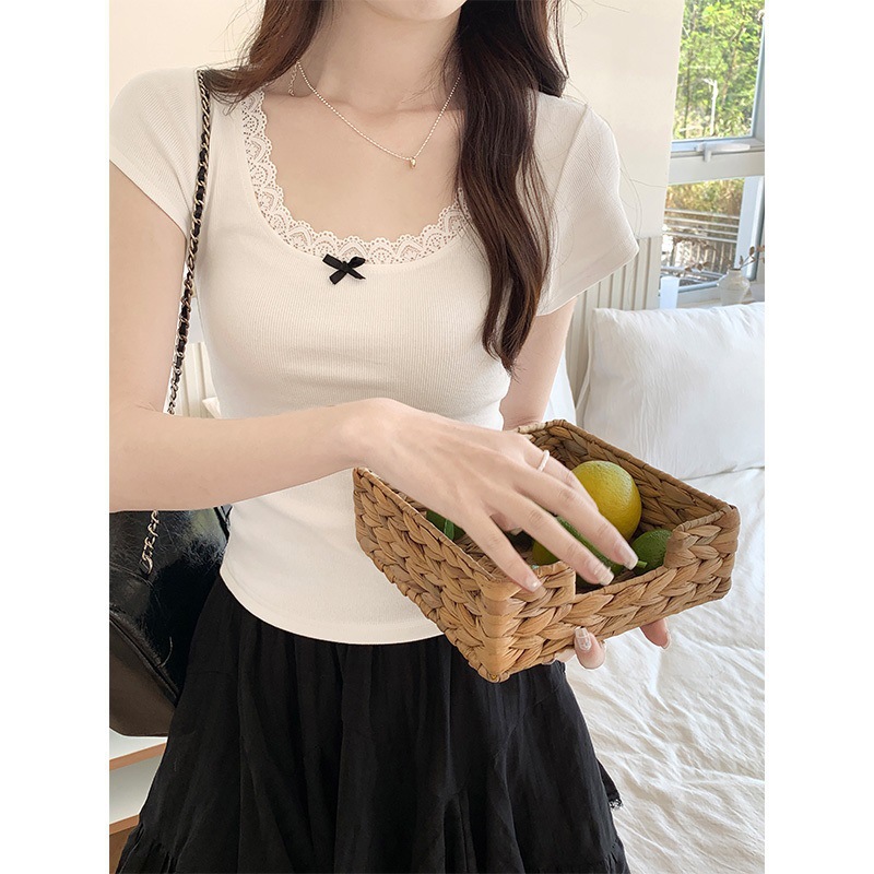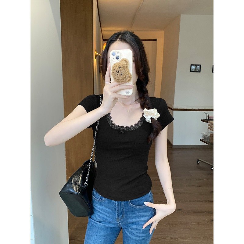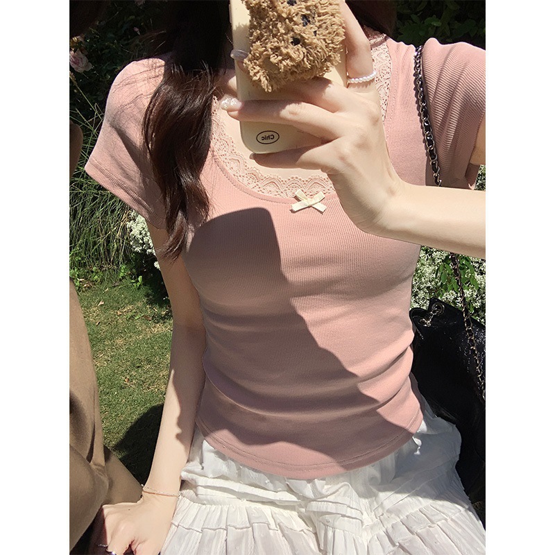 퓨어 블루 레이스 반팔 티셔츠 여성용 2024 년 새 여름 세련된 달콤하고 뜨거운 짧은 슬림 핏 숄더 탑스토어 가기