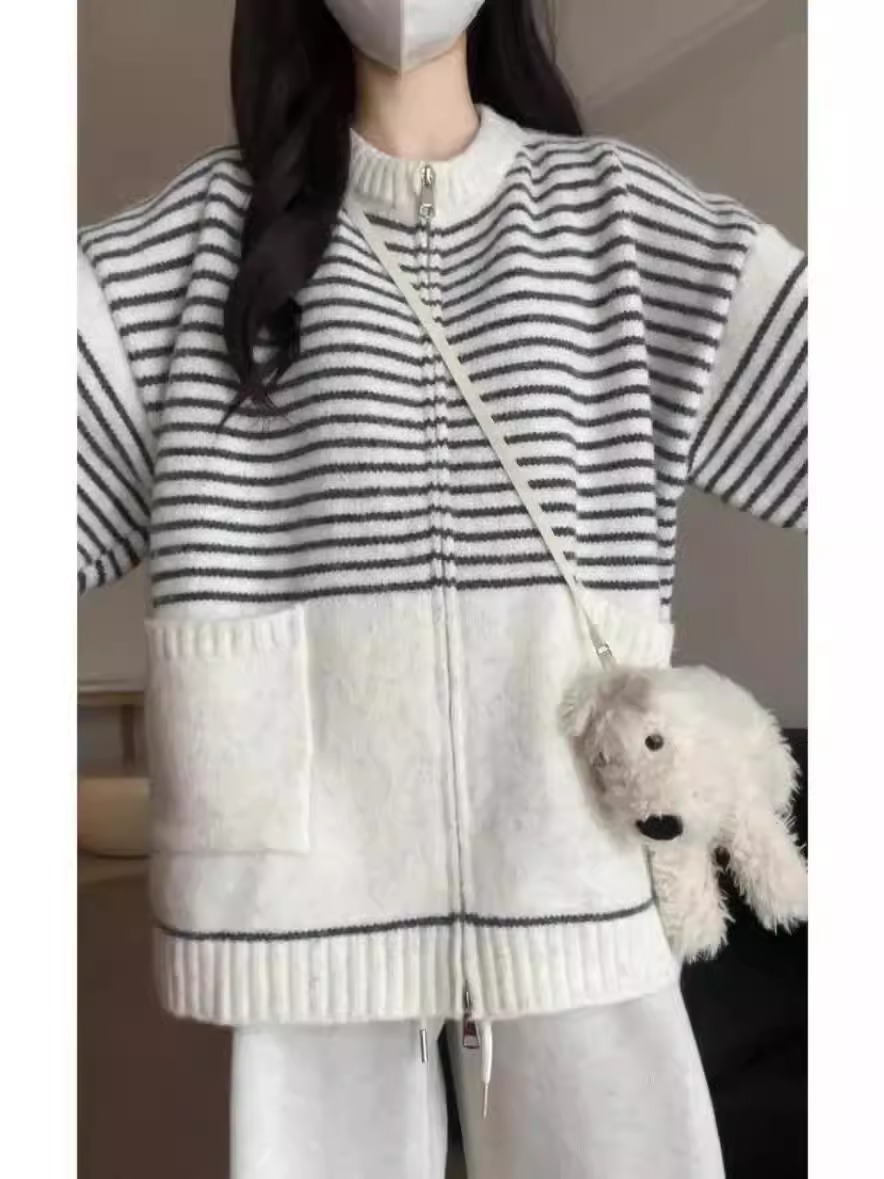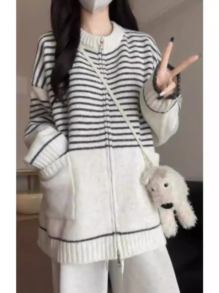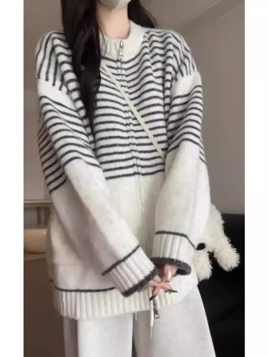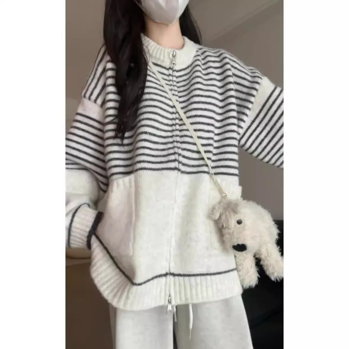 한국 스타일 게으른 스타일 줄무늬 외복 스웨터 가을과 겨울 여자 느슨한 대학 스타일 지퍼 두꺼운 스웨터 재킷