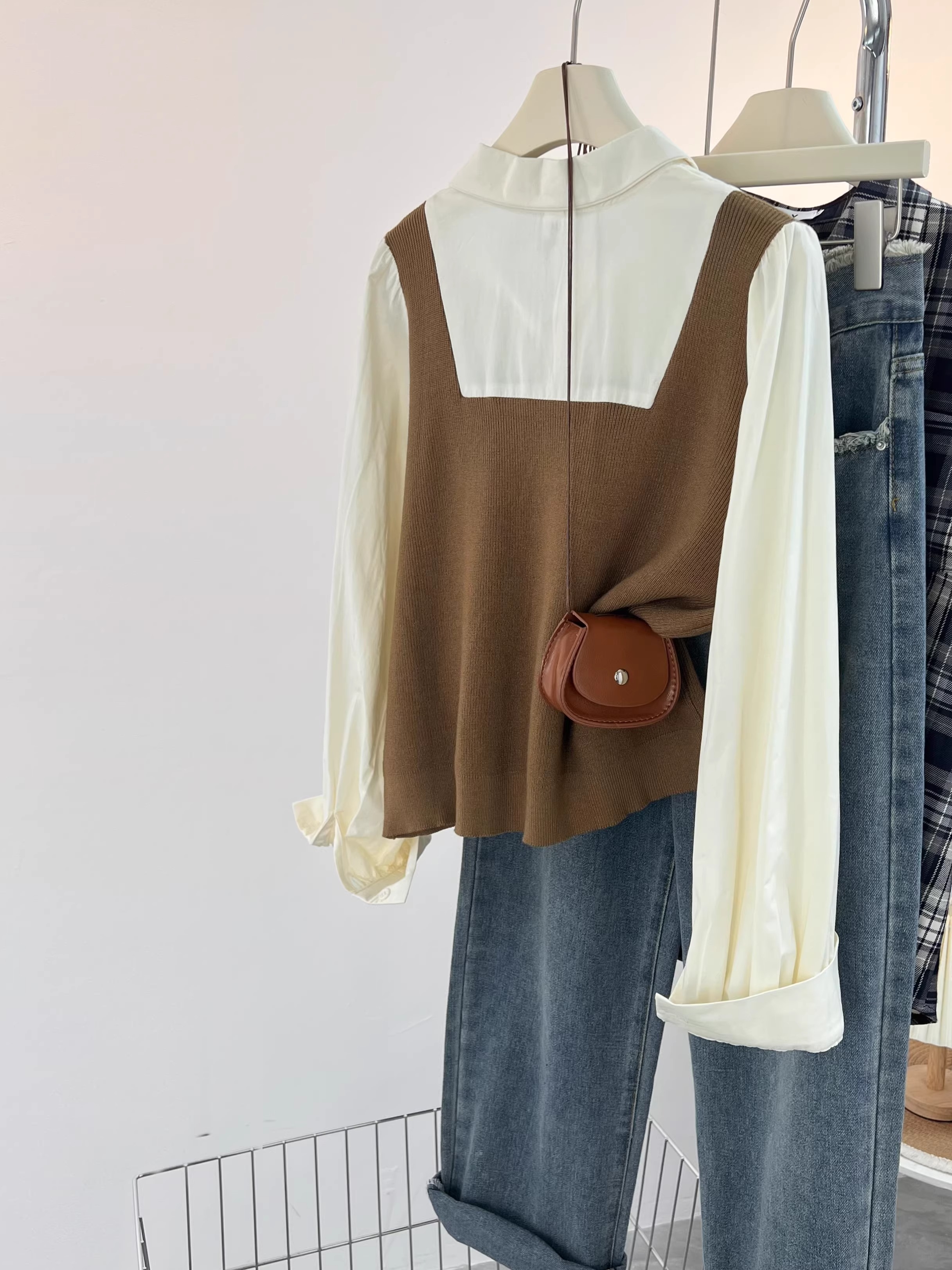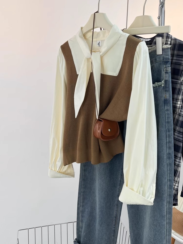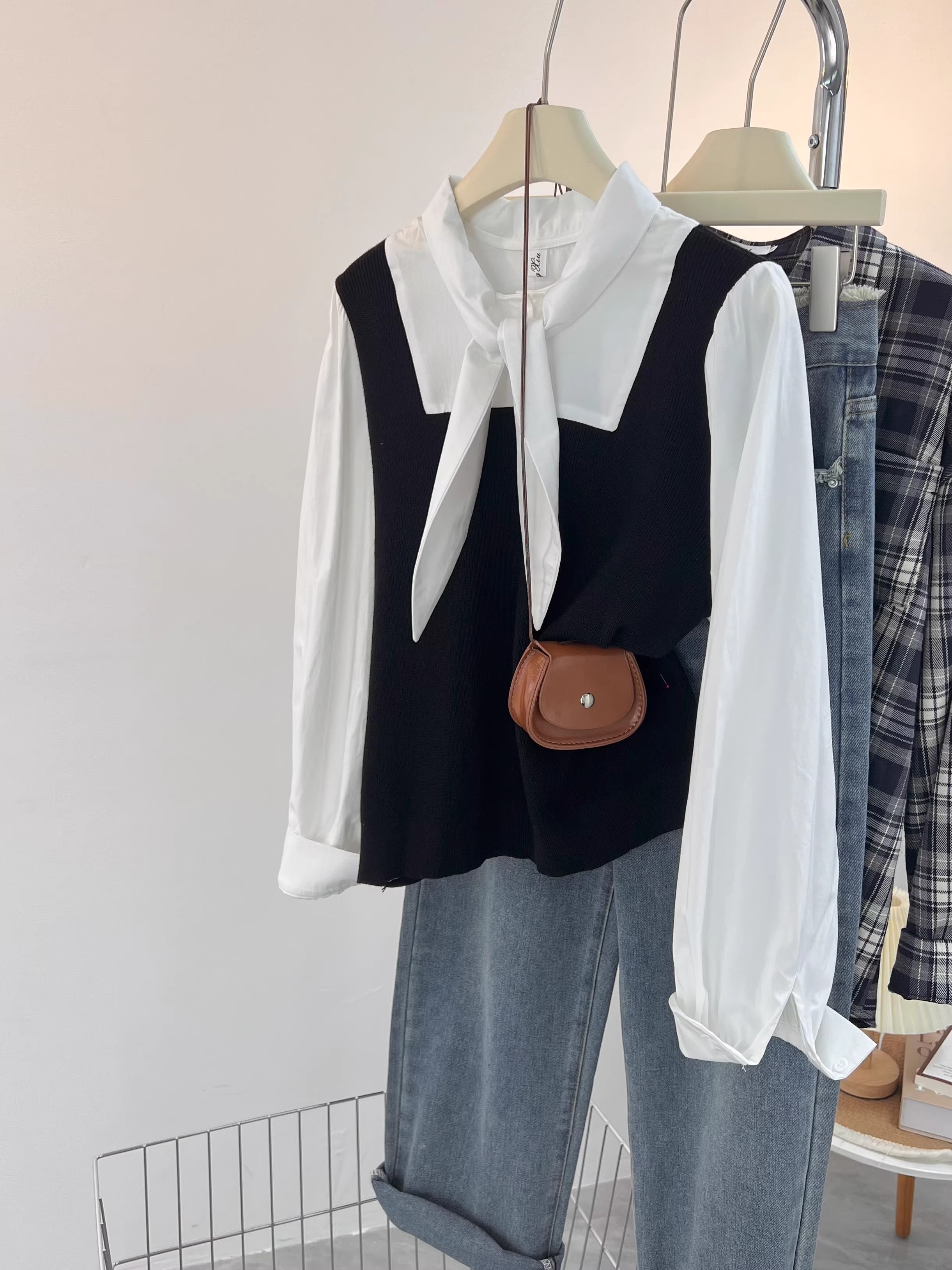 가짜 2 피스 니트 조끼 바느질 긴팔 셔츠 여성의 가을 패션 시대-세련된 올매치 루즈 업 탑 감소