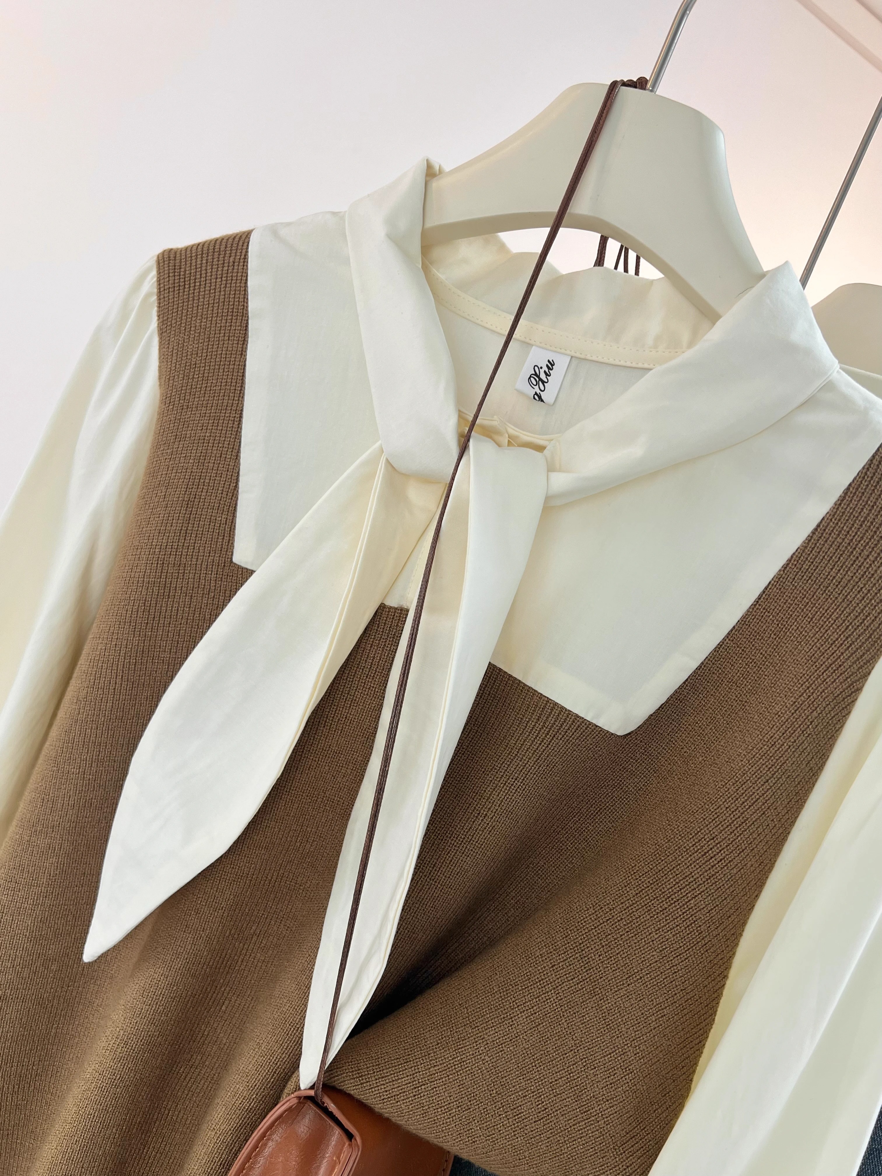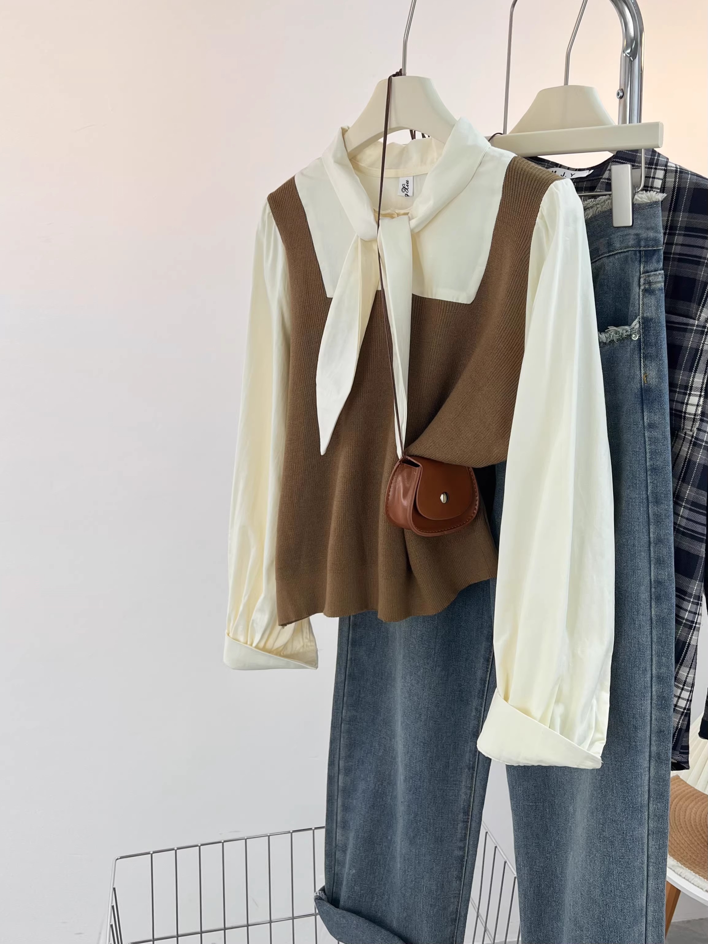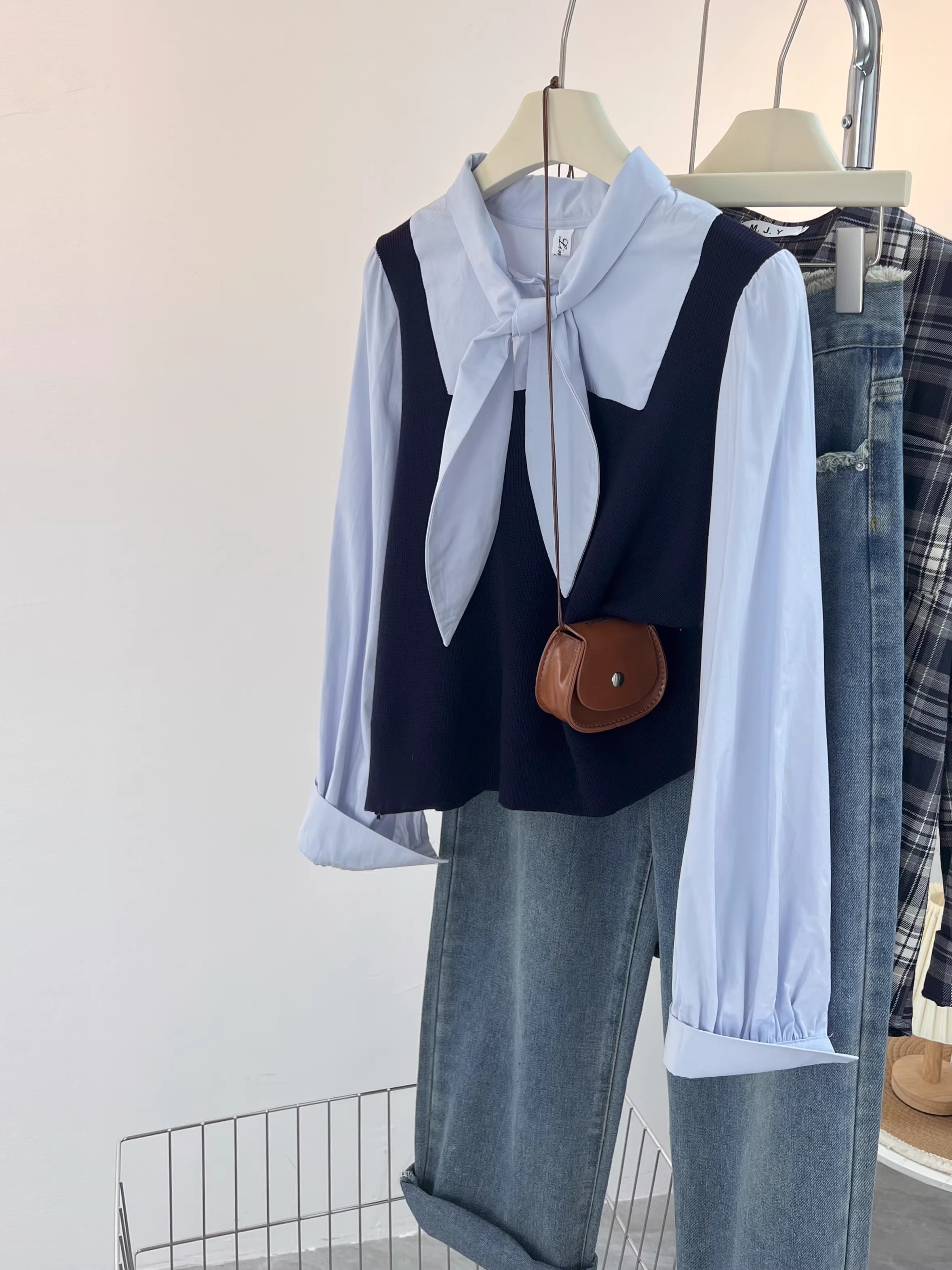 가짜 2 피스 니트 조끼 바느질 긴팔 셔츠 여성의 가을 패션 시대-세련된 올매치 루즈 업 탑 감소