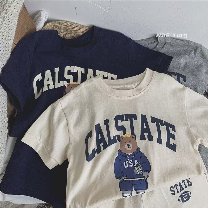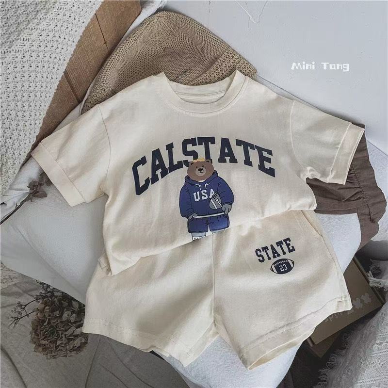 2025 여름 새로운 어린이 소년과 소녀 아기 곰 만화 서양식 얇은 캐주얼 스포츠 세트 투피스 세트스토어 가기