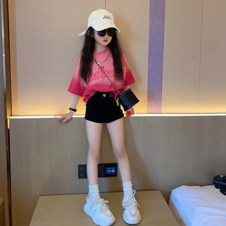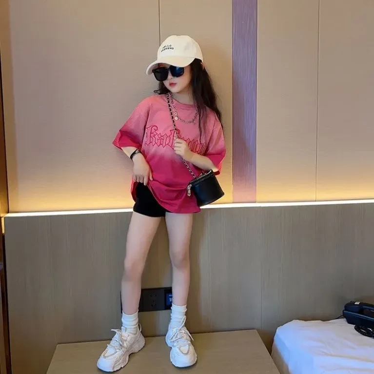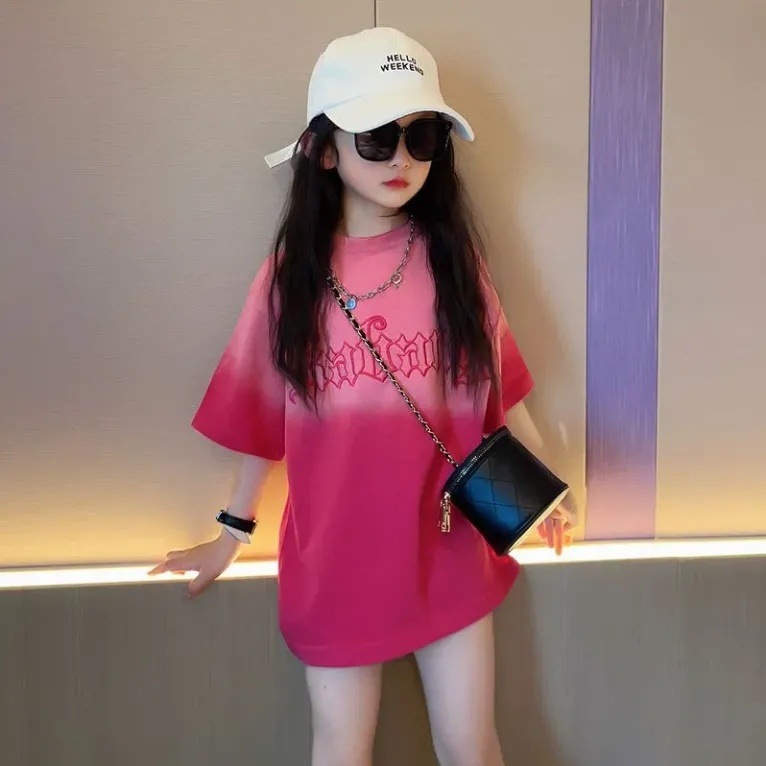 [얇은 디자인] 여자 티셔츠 2024 여름 새 반팔 탑 소녀 세련된 그라디언트 코튼 티셔츠