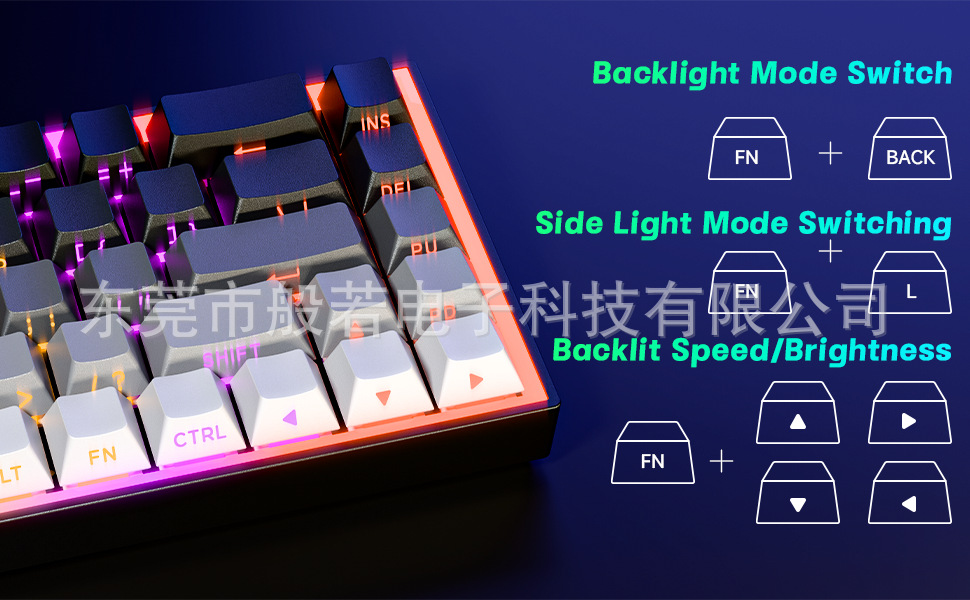 7.多种绚丽的单键背光(单色、RGB)控制及显示