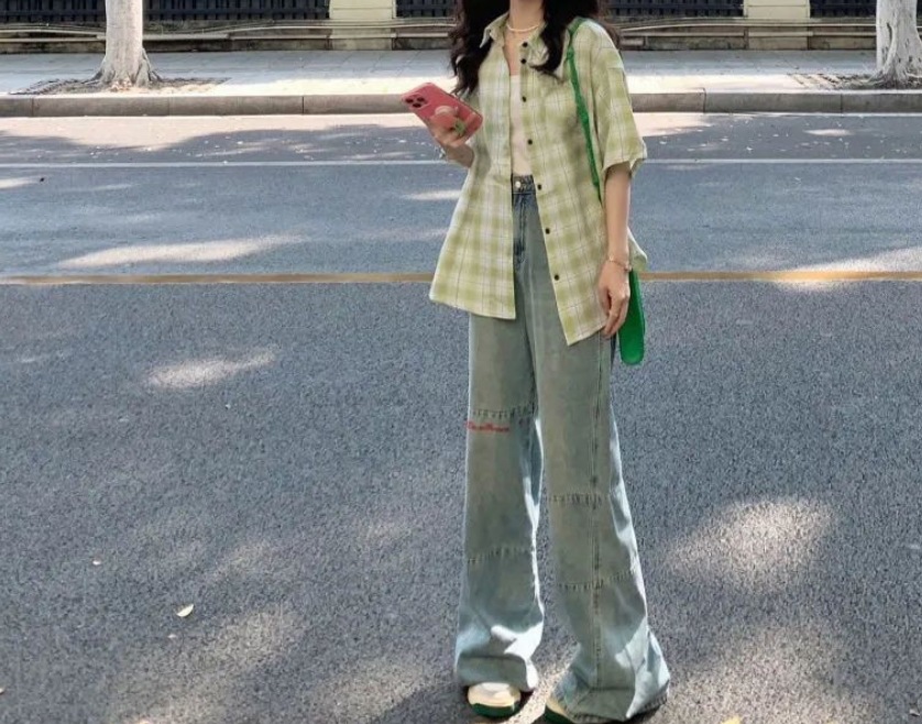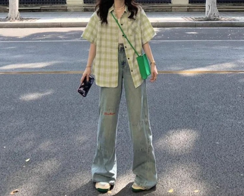 연두색 격자 무늬 짧은 소매 셔츠 여성용 아메리칸 스타일 레트로 2025 여름 신선한 달콤한 태양 셔츠스토어 가기