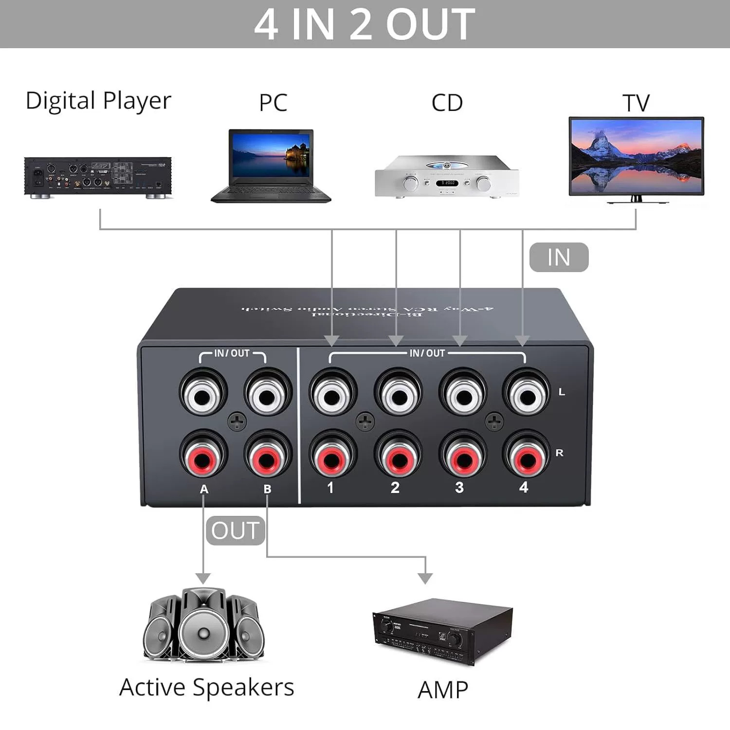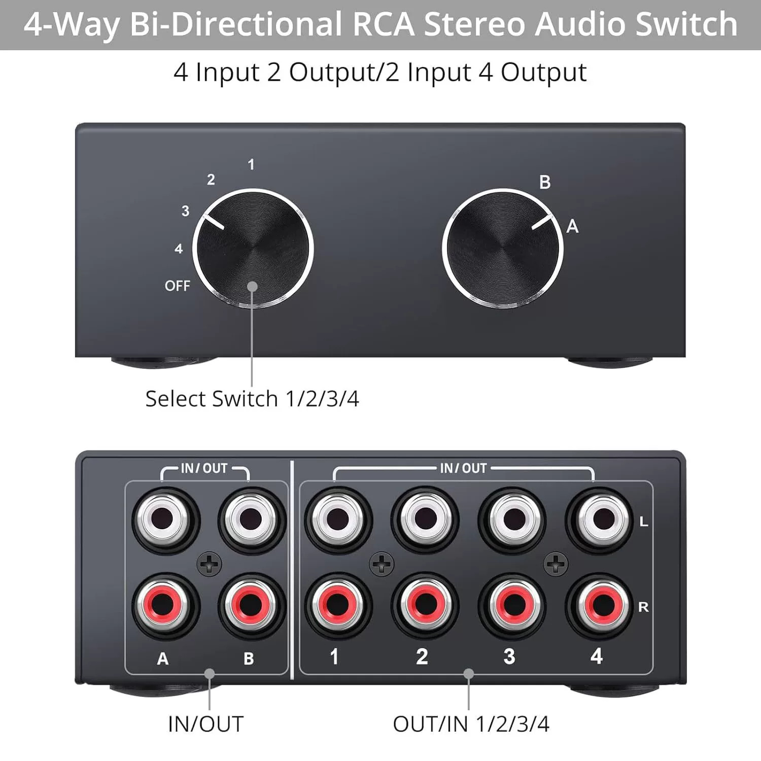 R/L 스테레오 스위처 왼쪽 및 오른쪽 채널 오디오 스위치 4 in 2 out/2 in 4 out 양방향 RCA 증폭기스토어 가기