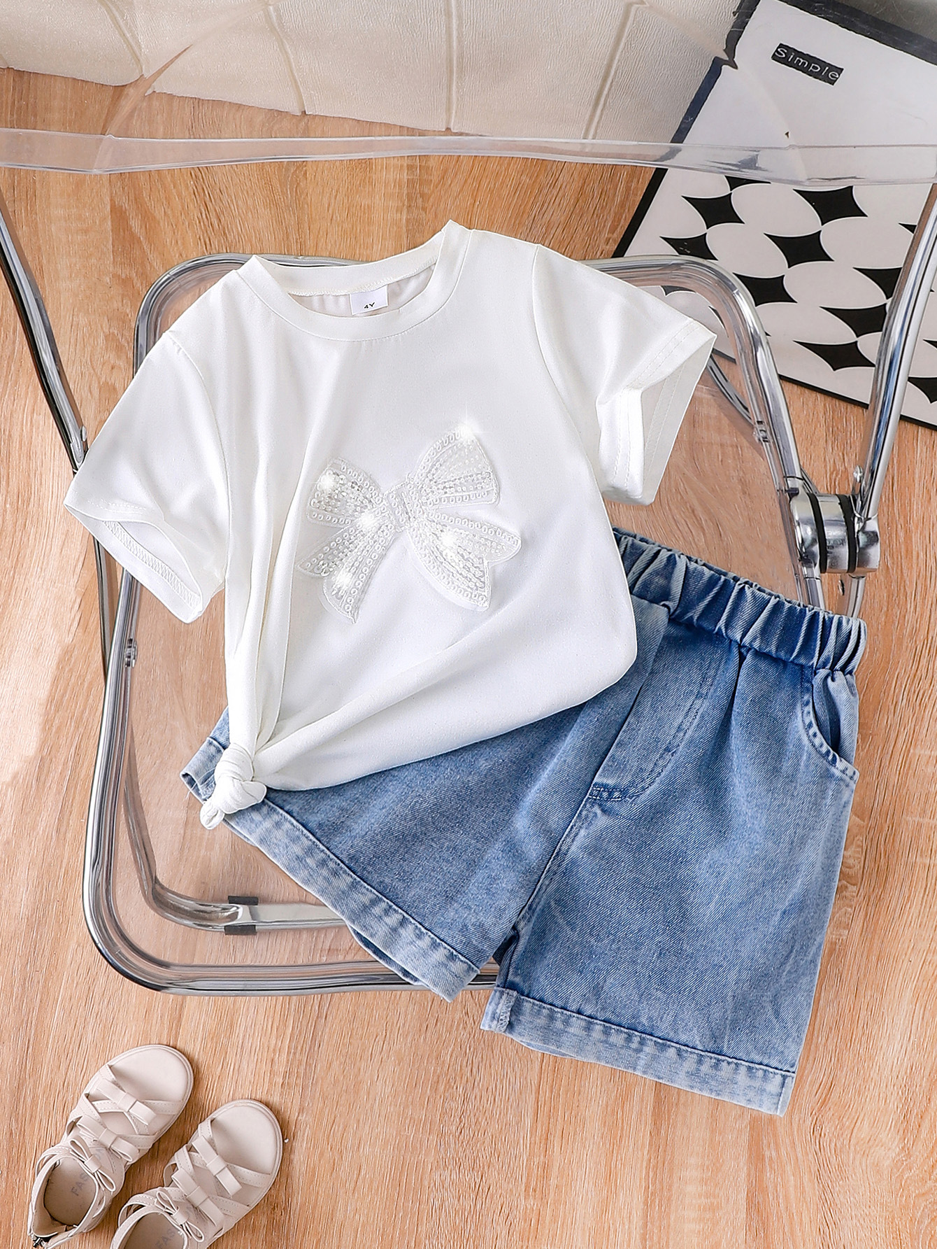 국경 간 대외 무역 소녀 세트 유럽과 미국의 여름 둥근 목 3 차원 활 반팔 티셔츠 데님 반바지 투피스 세트