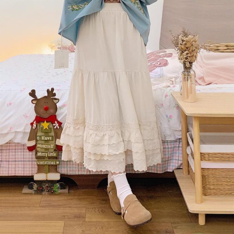 레이스 케이크 스커트 살구색 스커트 여성 가을과 겨울 일본 스타일 레트로 봄과 가을 화이트 롱 스커트 페티코트 스커트