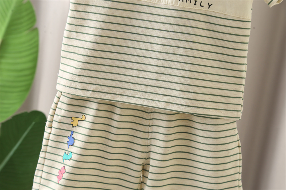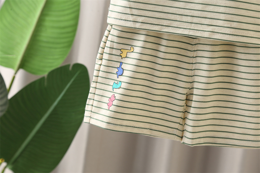 5 개의 작은 7 개의 아동복 2025 여름 새로운 0-4 세 소년 소녀 옷깃 줄무늬 공룡 짧은 소매 2 피스 세트스토어 가기