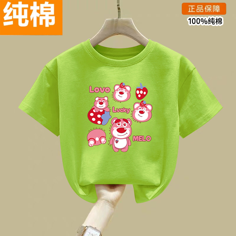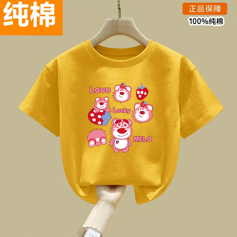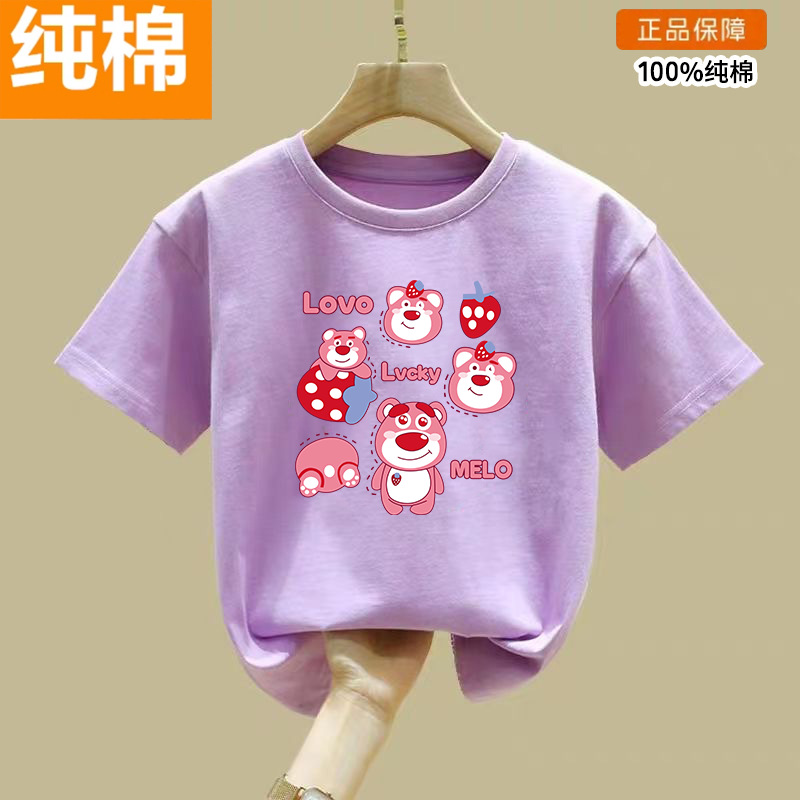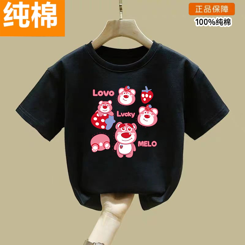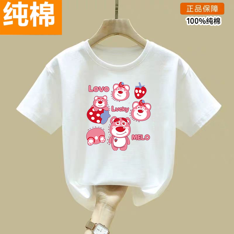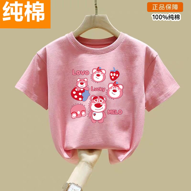 딸기 곰 티셔츠 소녀의 순면 여름 2024 새로운 스타일 중대형 어린이 핑크 최고 어린이 반팔 여름 티셔츠스토어 가기