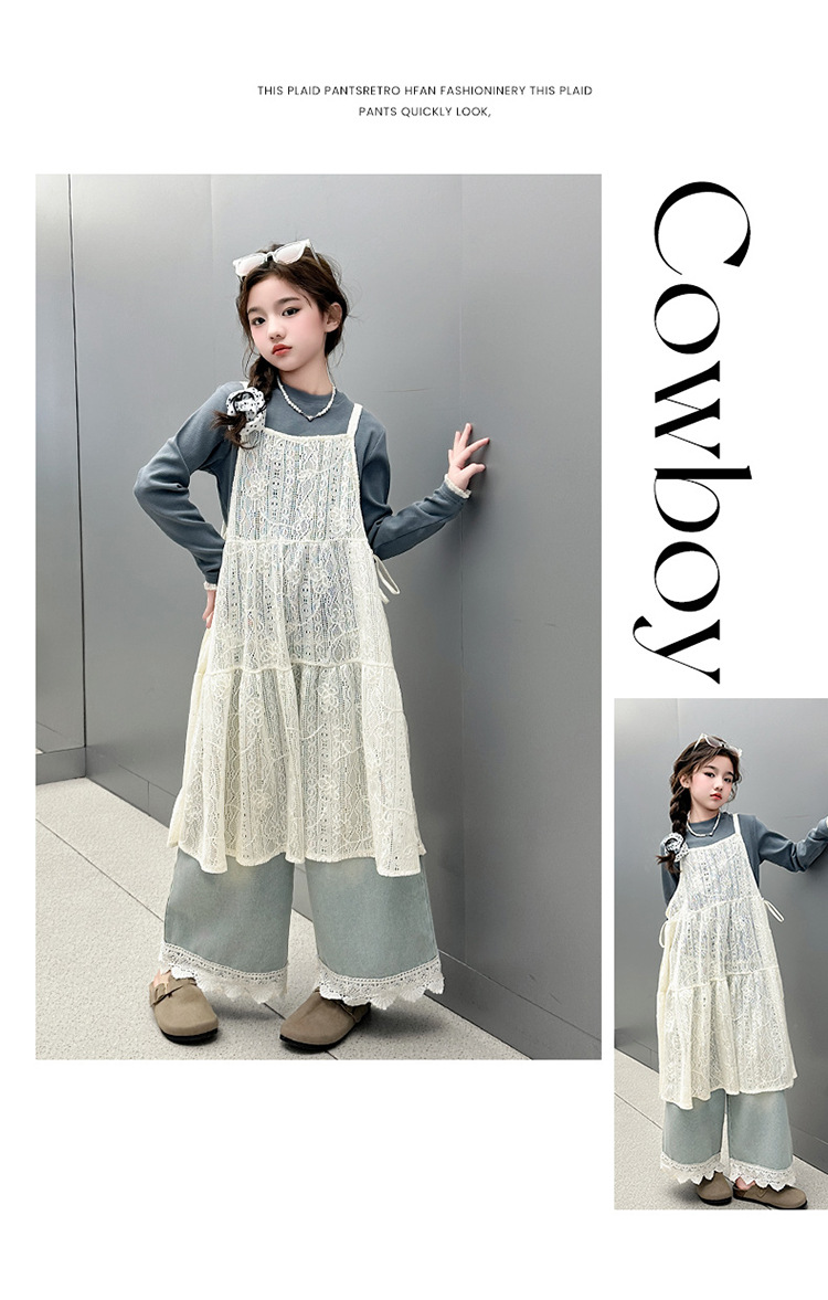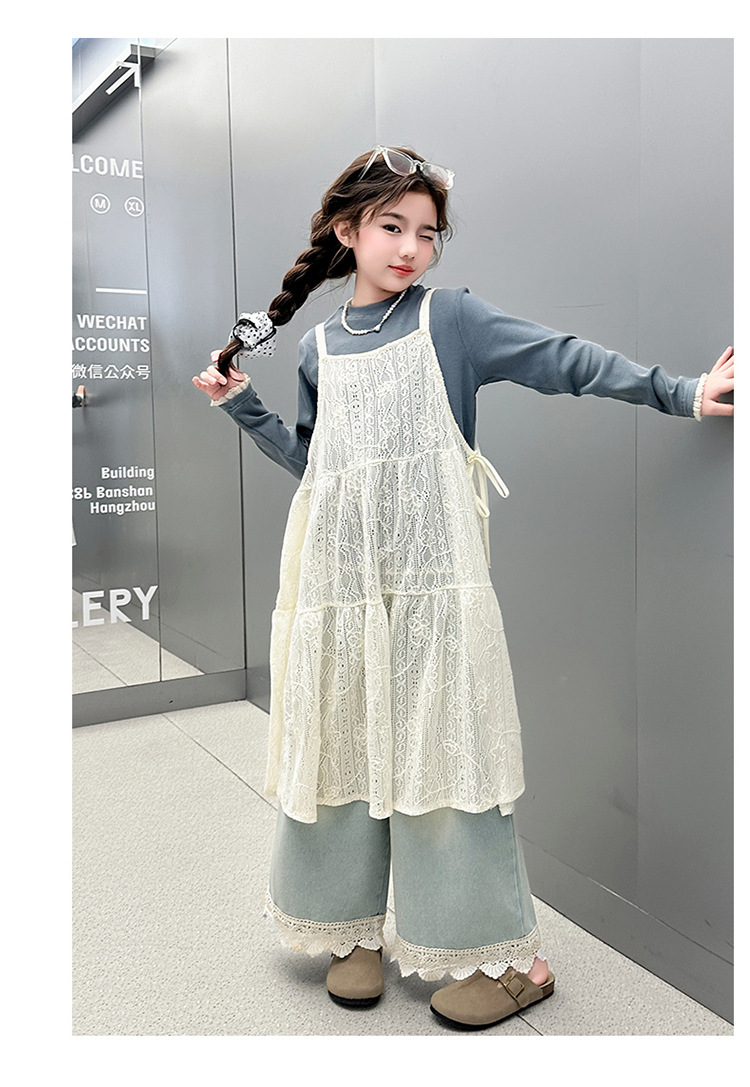 소녀의 봄 세트 2025 새로운 서양식 어린이 긴 소매 보틀 셔츠 데님 넓은 다리 바지 3 조각 세트스토어 가기