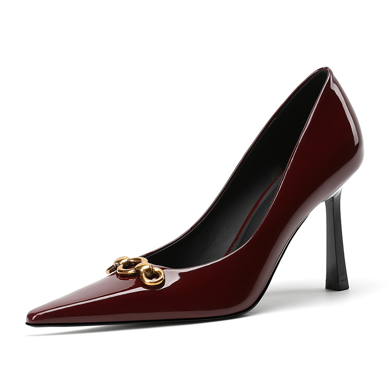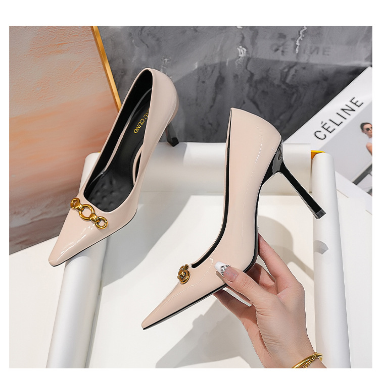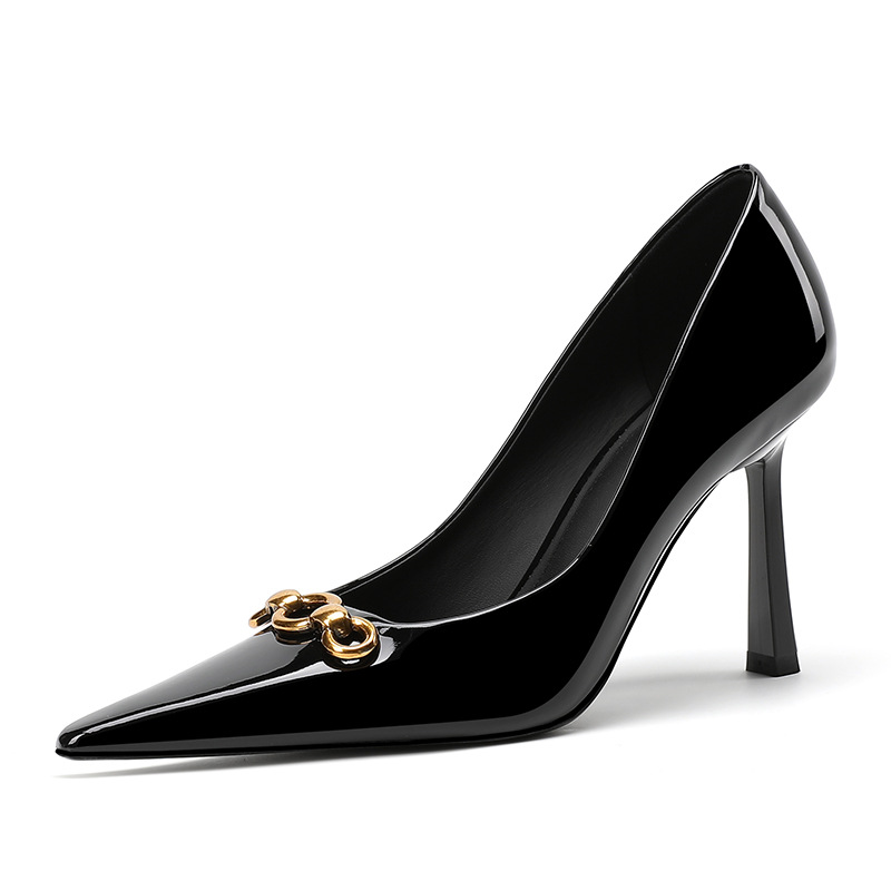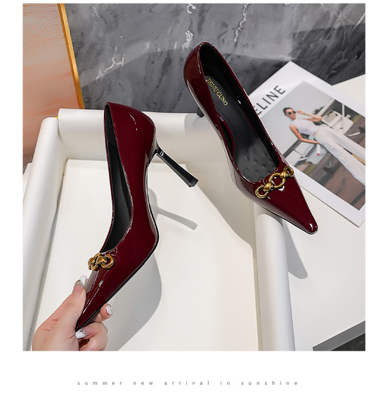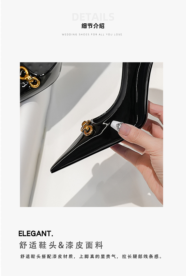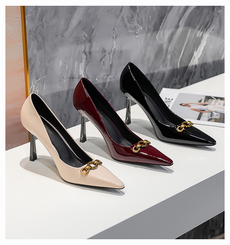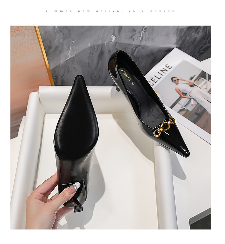 2025 새로운 스타일의 우아한 금속 버클 레트로 뾰족한 하이힐 섹시한 패션 올매치 슬리밍 특허 가죽 스틸레토 힐 신발스토어 가기
