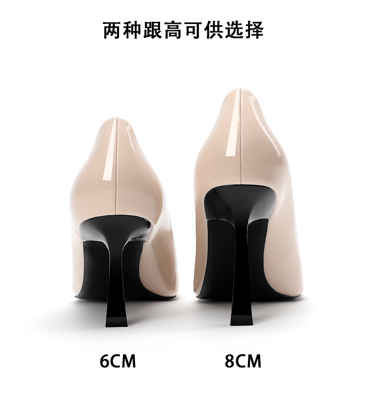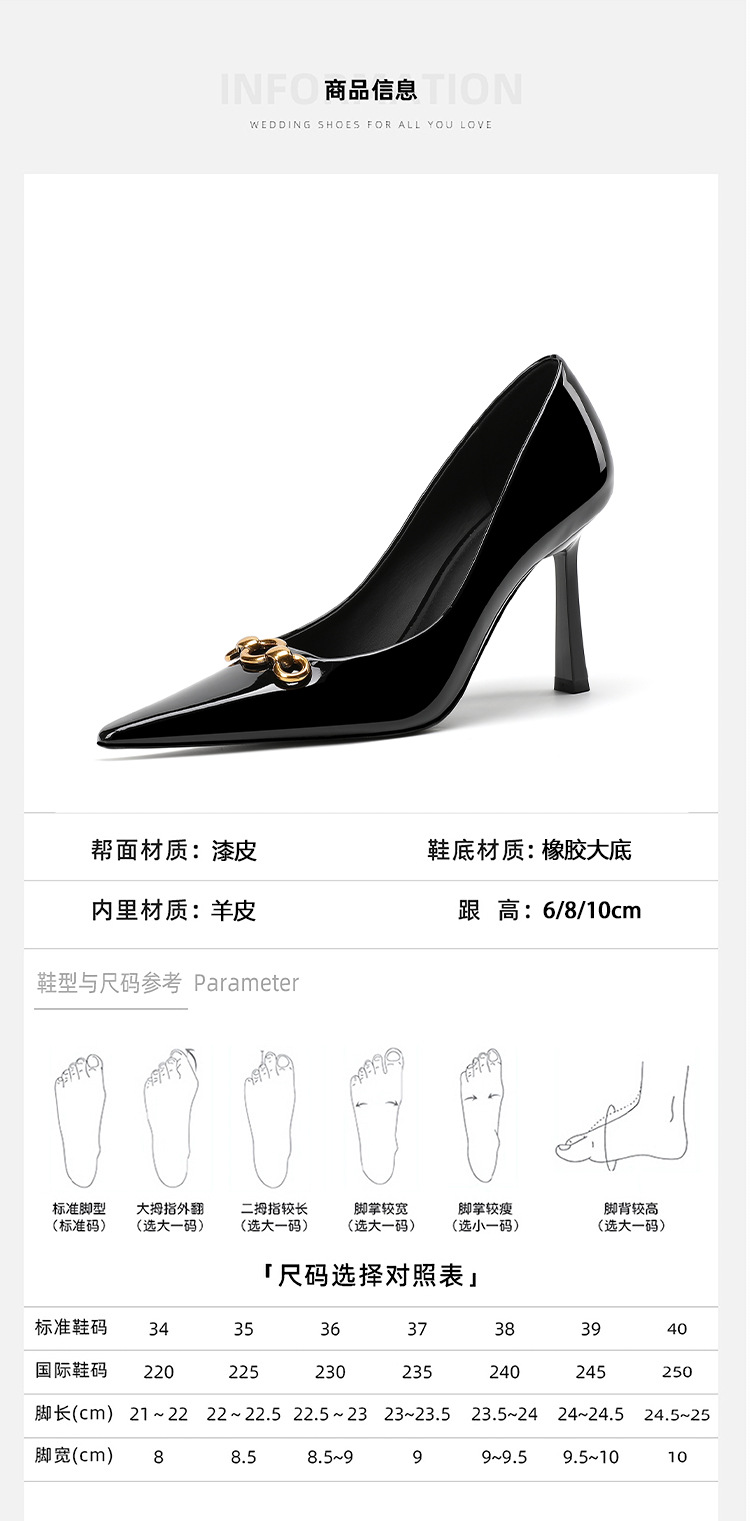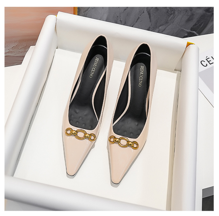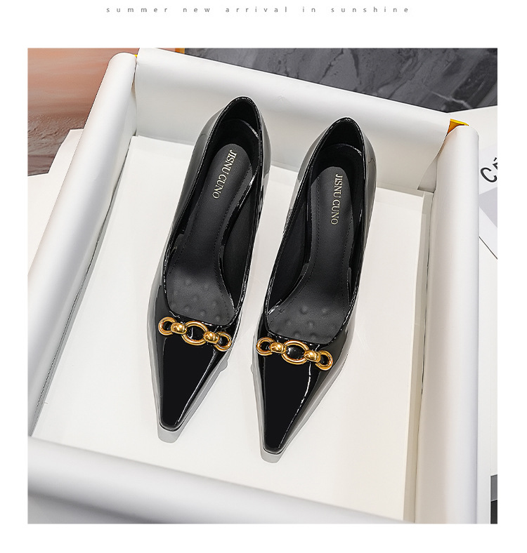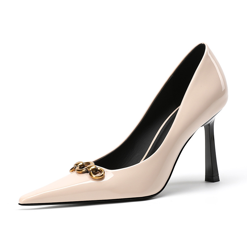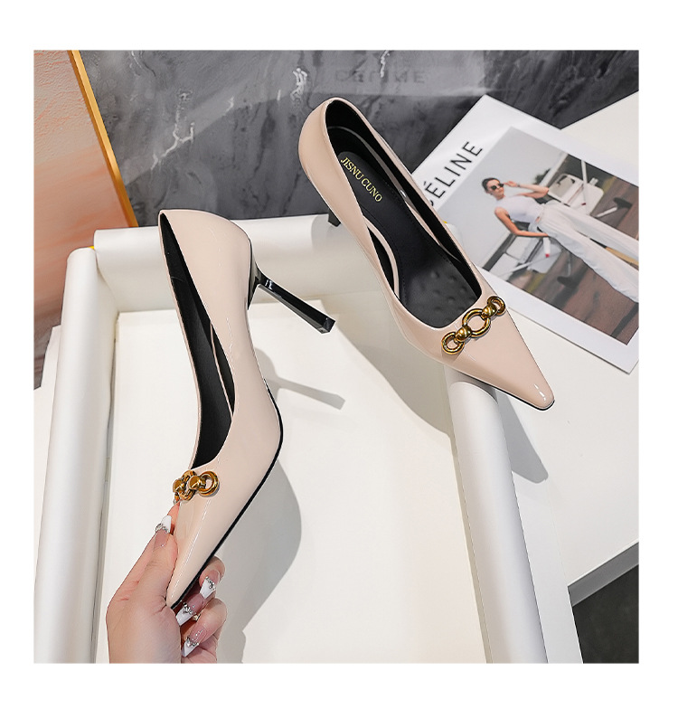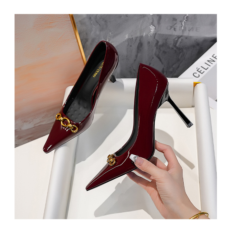 2025 새로운 스타일의 우아한 금속 버클 레트로 뾰족한 하이힐 섹시한 패션 올매치 슬리밍 특허 가죽 스틸레토 힐 신발스토어 가기