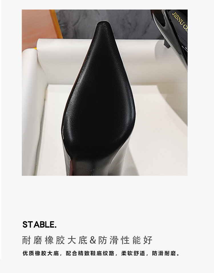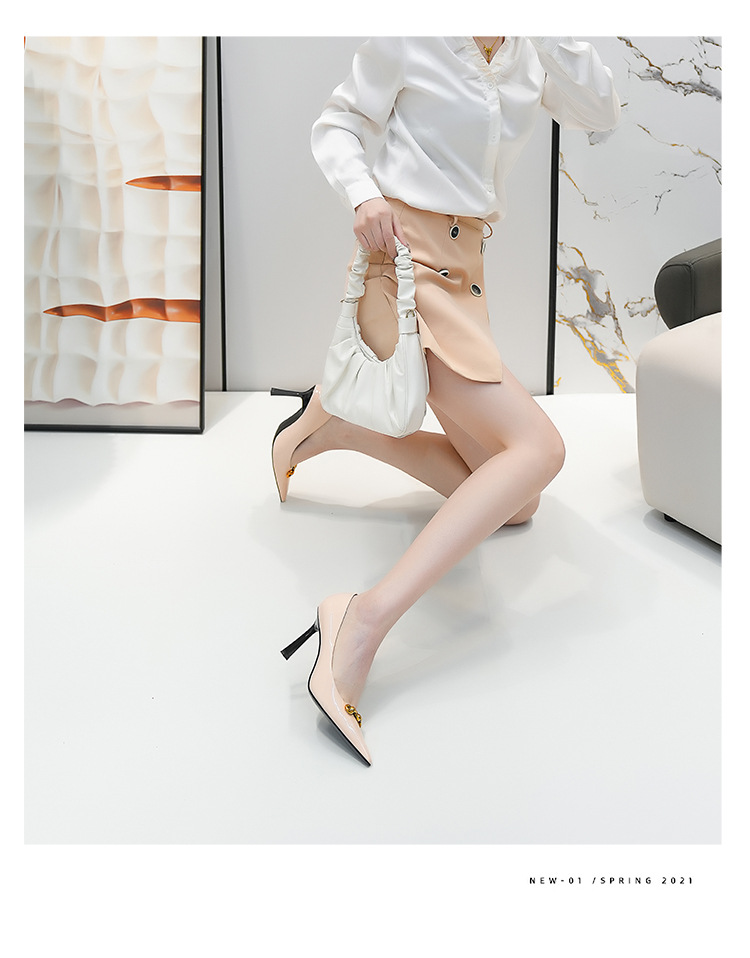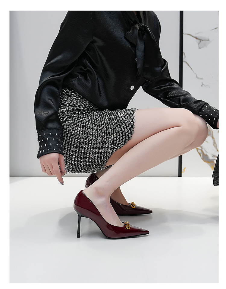2025 새로운 스타일의 우아한 금속 버클 레트로 뾰족한 하이힐 섹시한 패션 올매치 슬리밍 특허 가죽 스틸레토 힐 신발