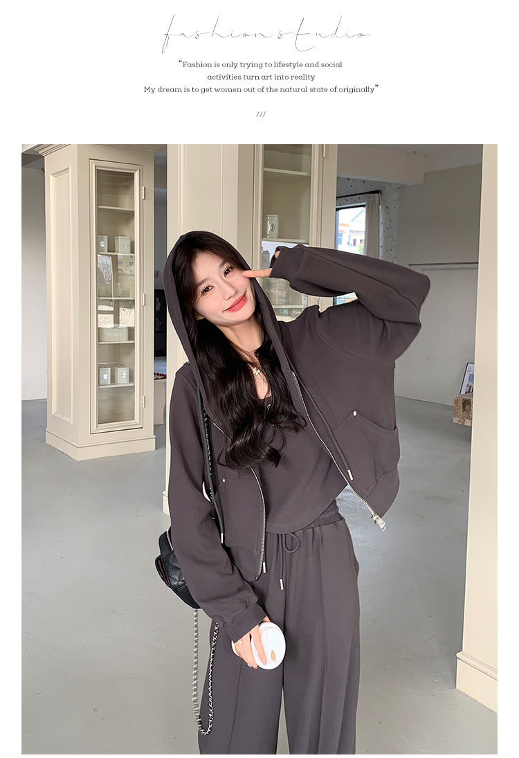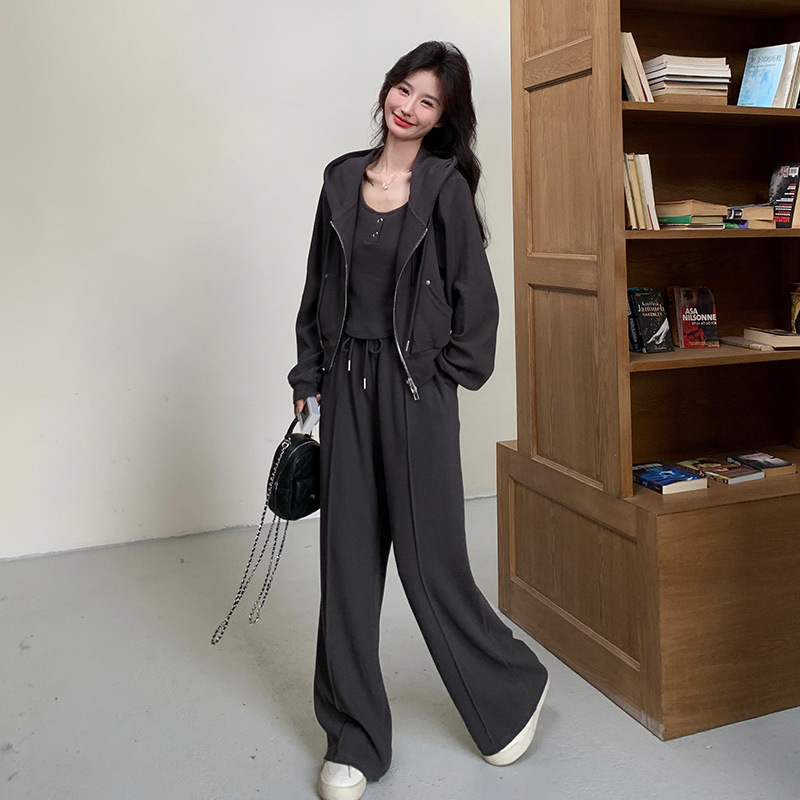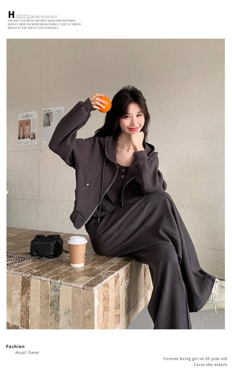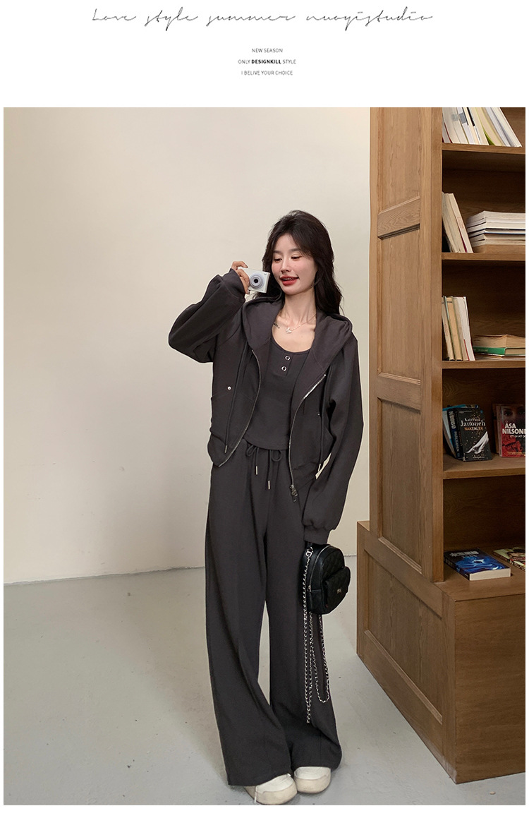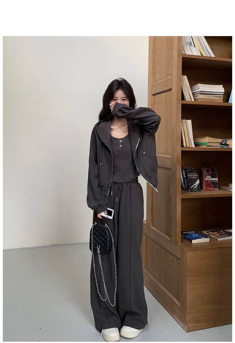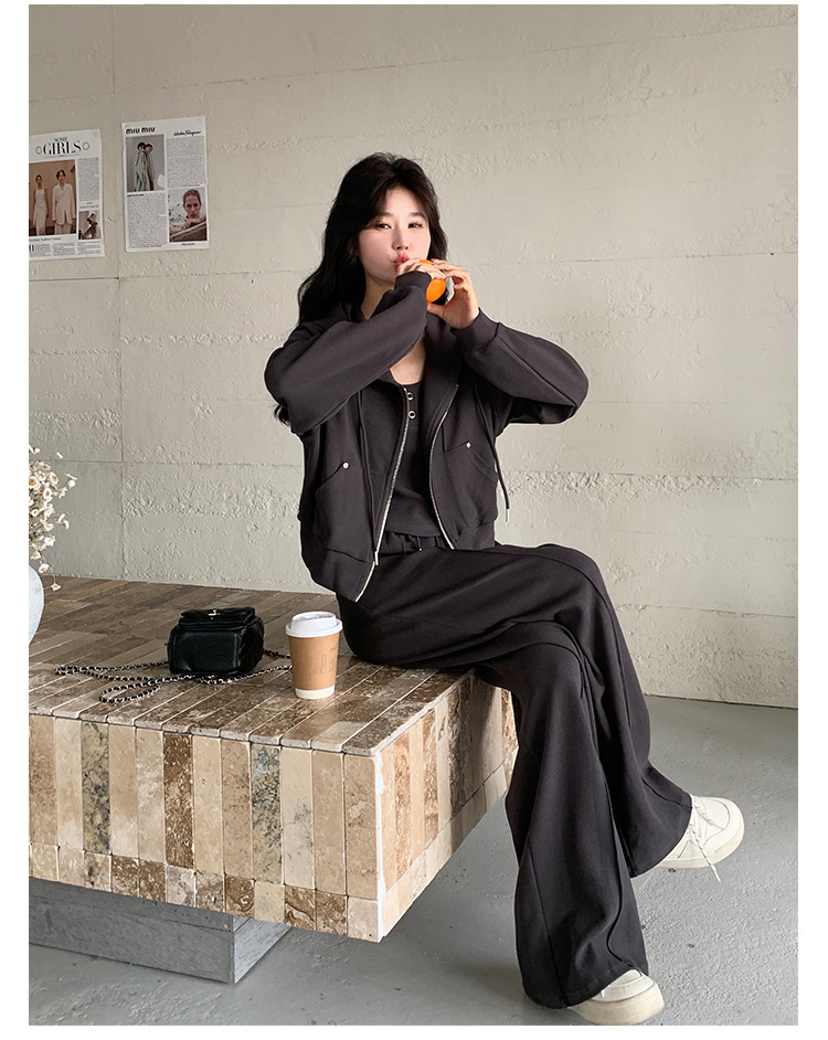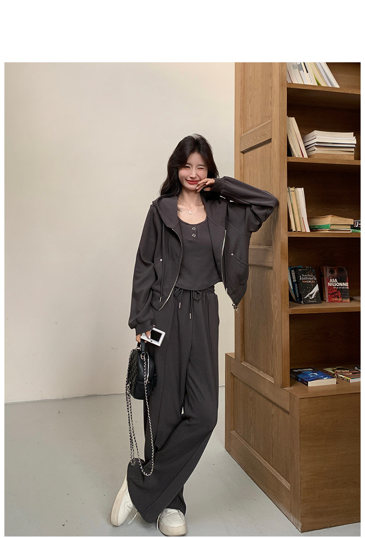 [멩메이] 25 봄 다크 그레이 한국 후드스웨터 카디건 스포츠 세트 여자 슬림 3 피스 세트스토어 가기