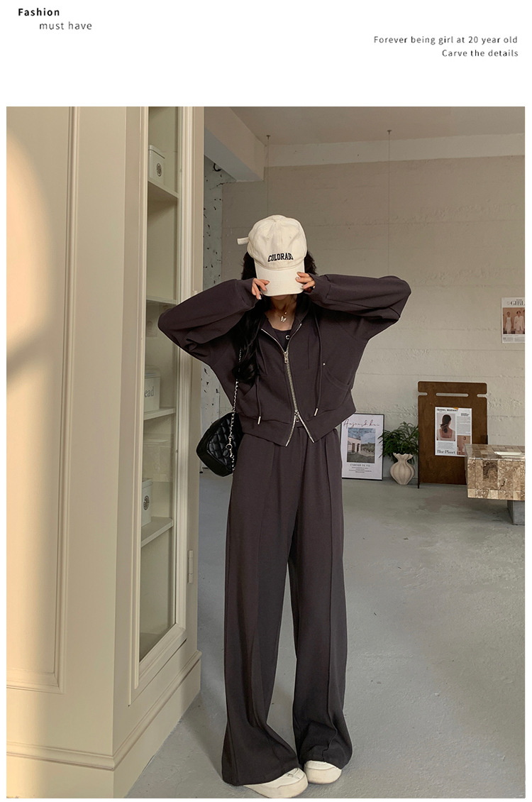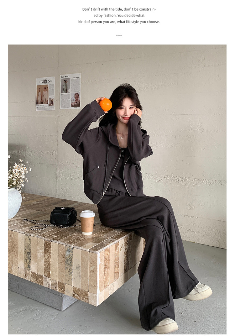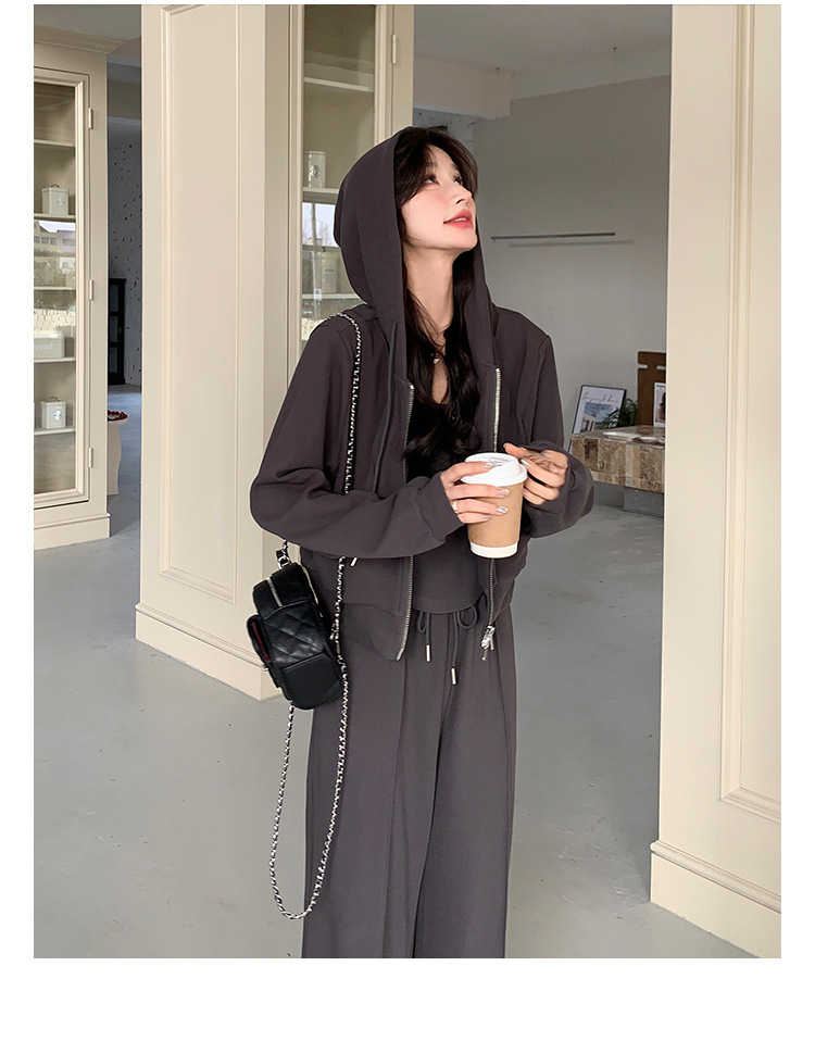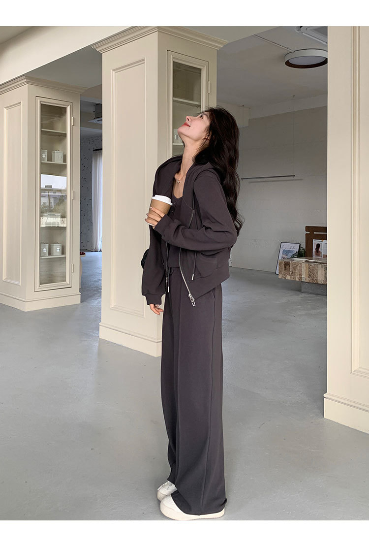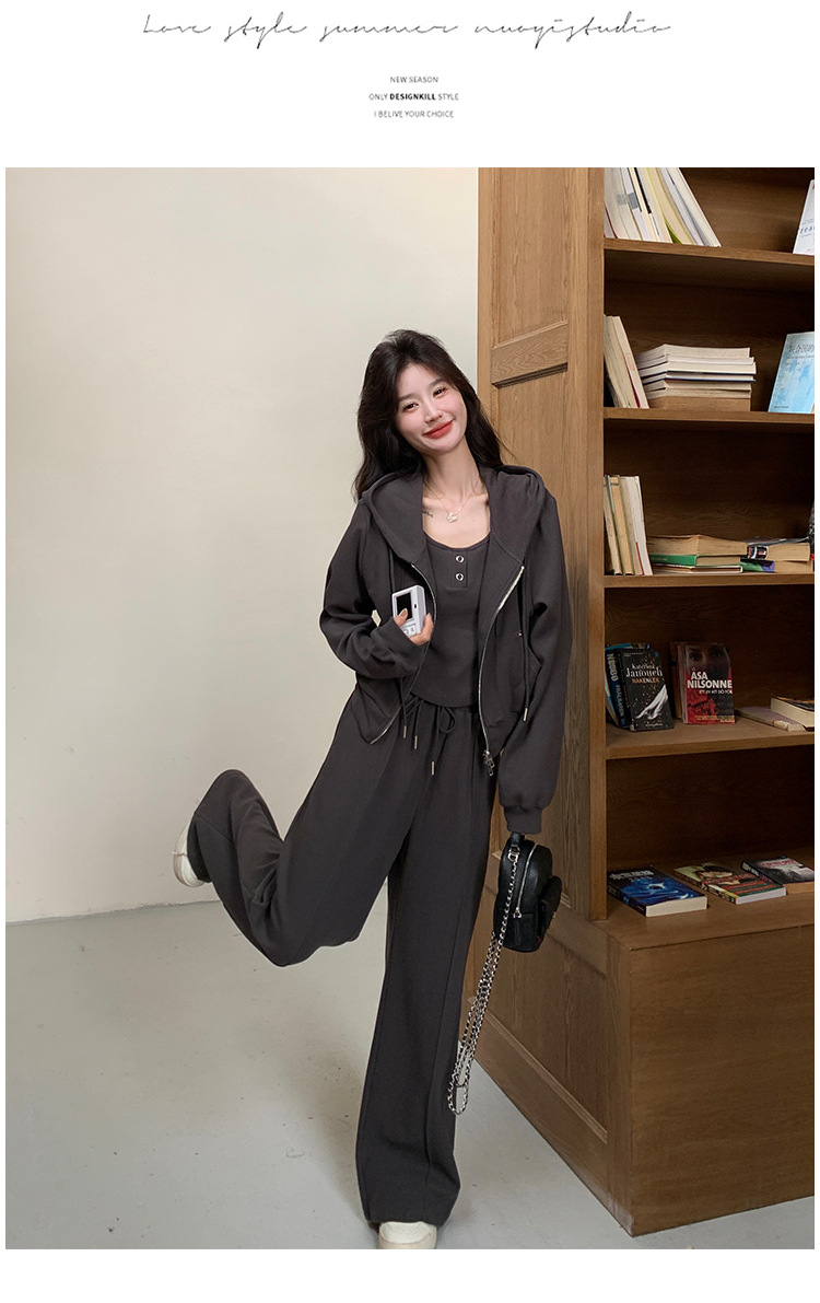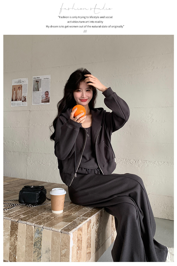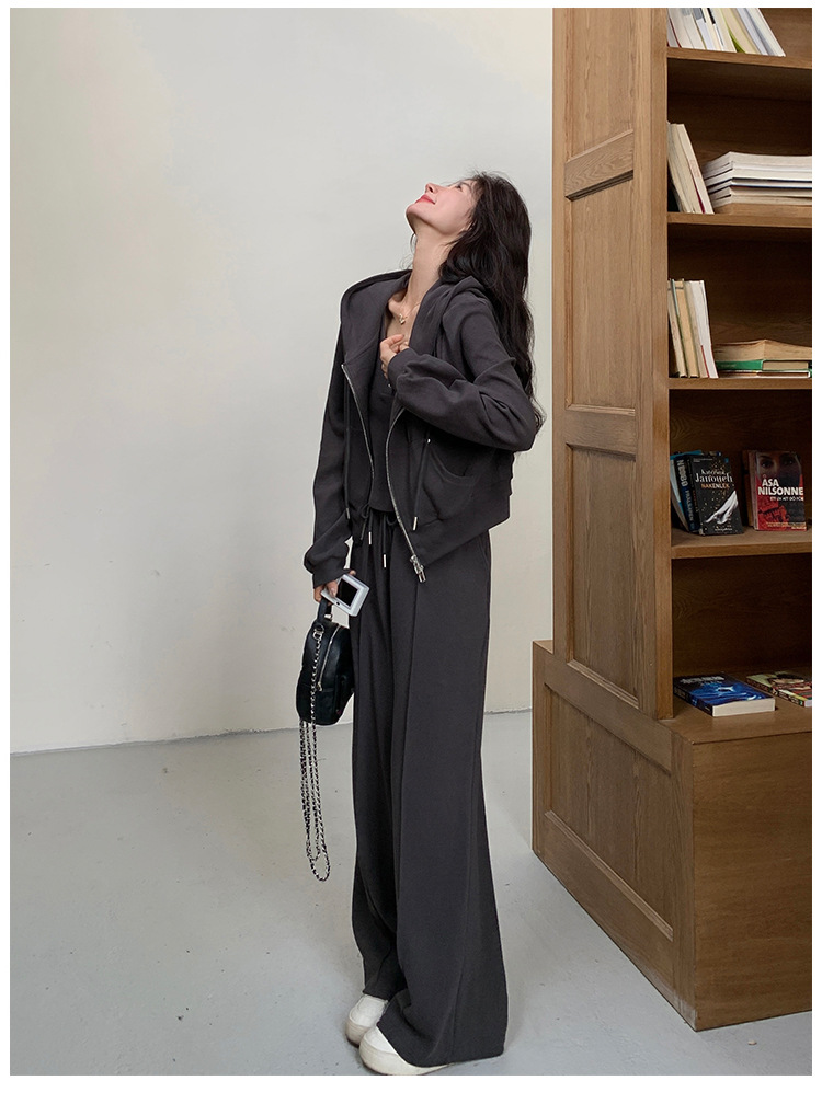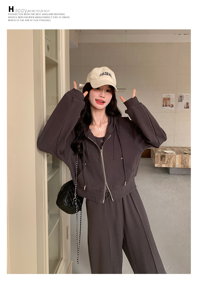 [멩메이] 25 봄 다크 그레이 한국 후드스웨터 카디건 스포츠 세트 여자 슬림 3 피스 세트스토어 가기