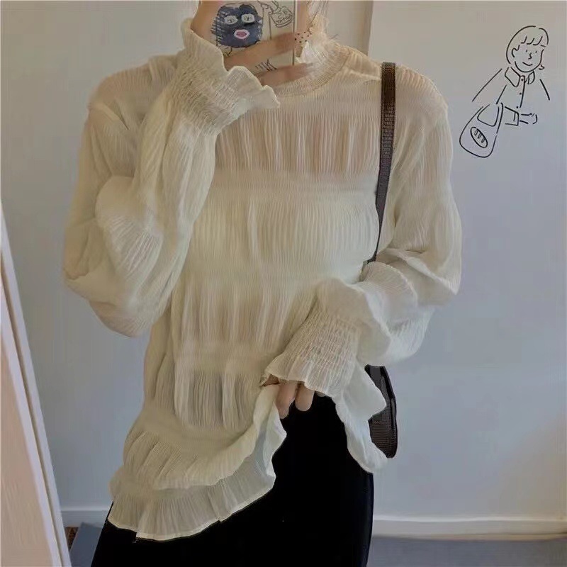 봄과 가을 2023 서양식 새 긴팔 반팔 칼라 쉬폰 주름 스위트베이스 셔츠