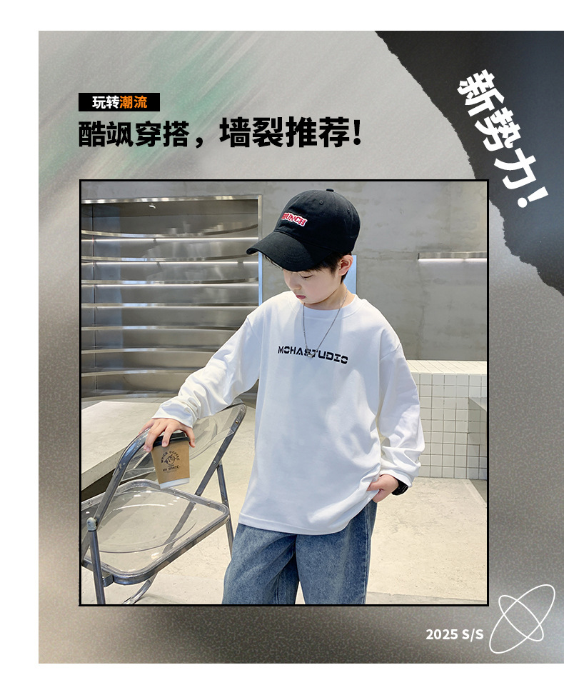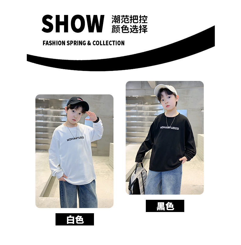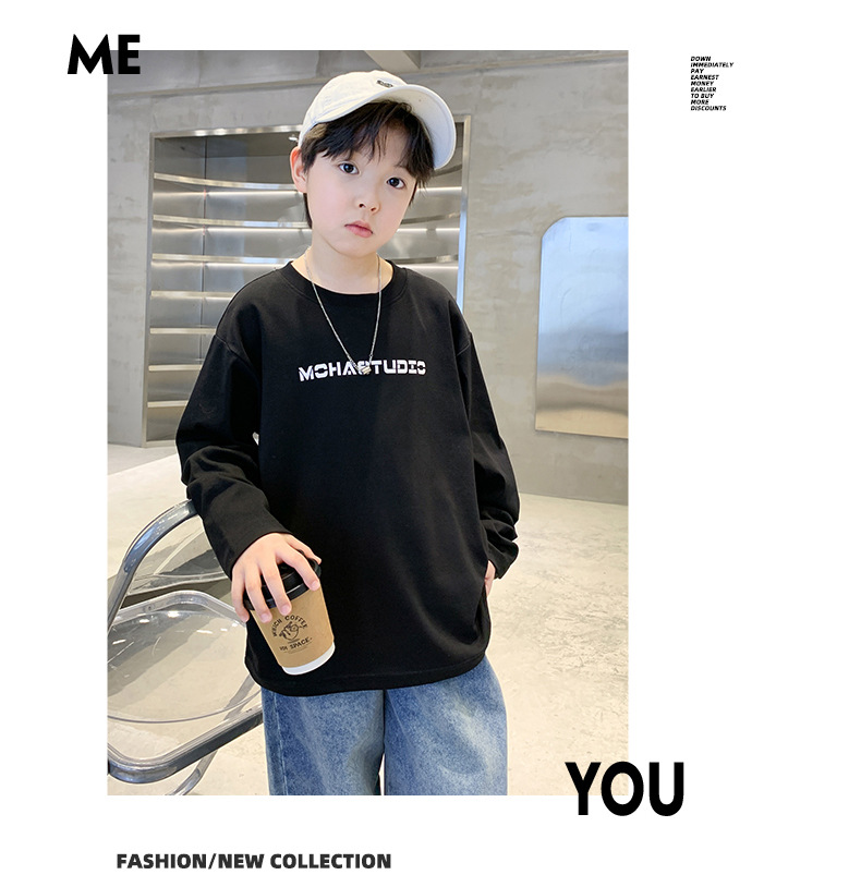 남성 대형 어린이 봄과 가을 편지 인쇄 기본 셔츠 2025 피부 친화적 인 부드러운 편지 크루 넥 스웨터 새로운 패션스토어 가기