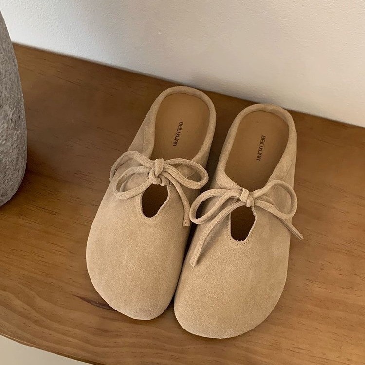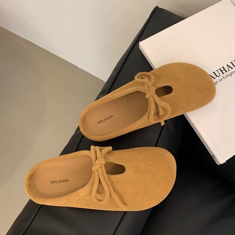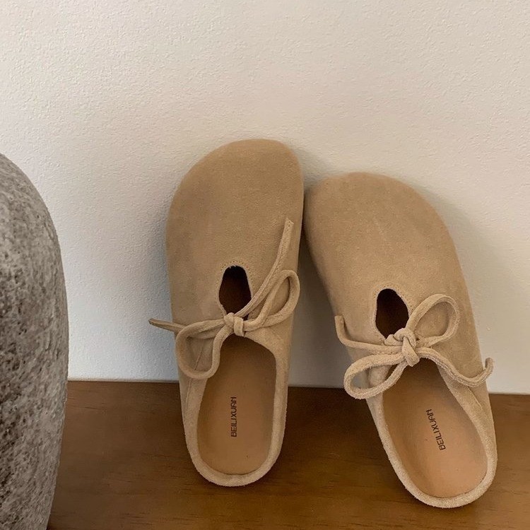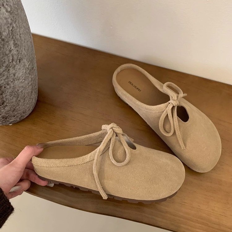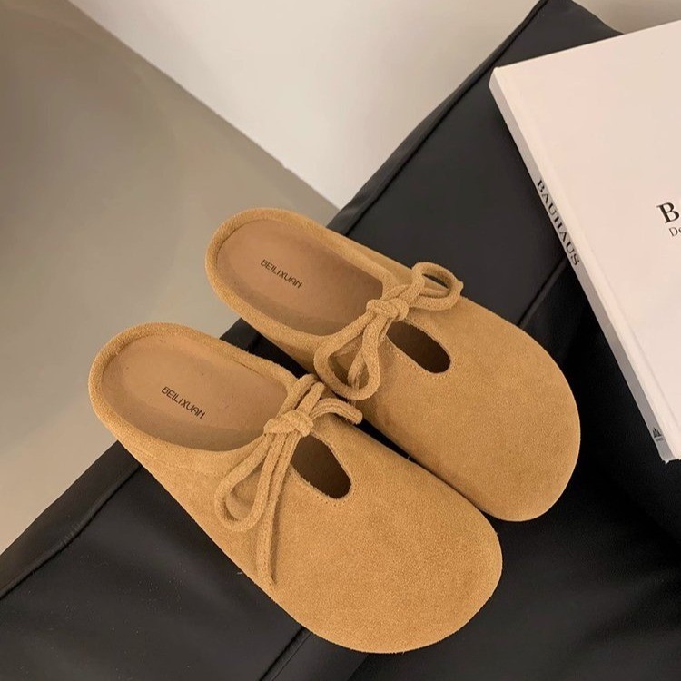빈티지 모리 스타일 부드러운 바닥 바오투 하프 슬리퍼 아우터웨어 2025 봄 및 가을 새로운 플랫 슬리퍼 다크 브라운 레이스 업 여성용 신발스토어 가기