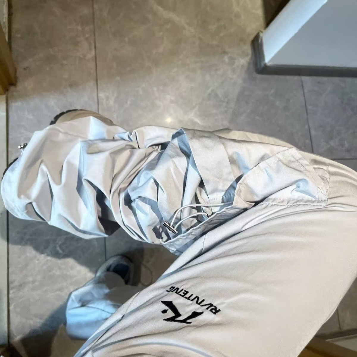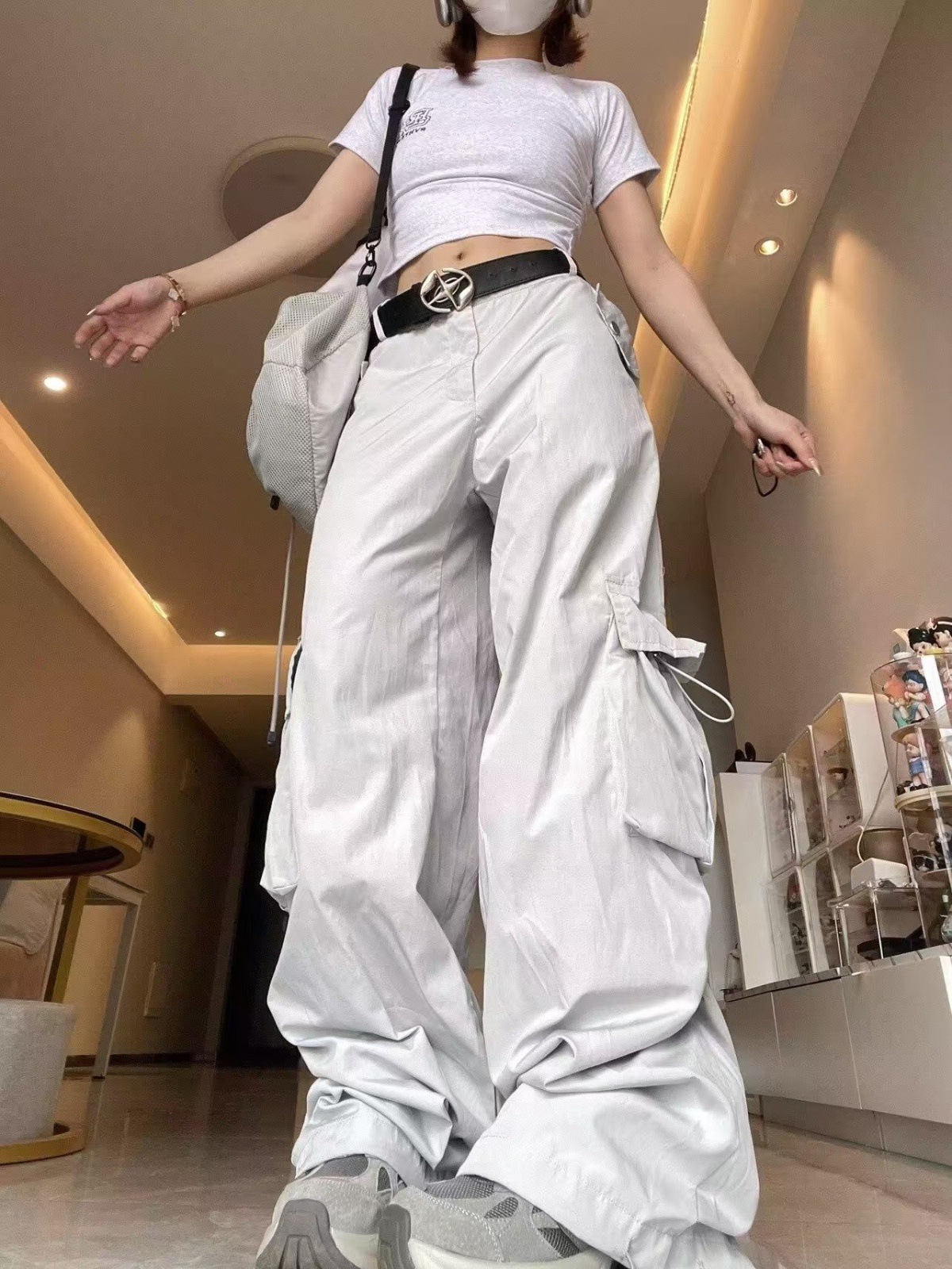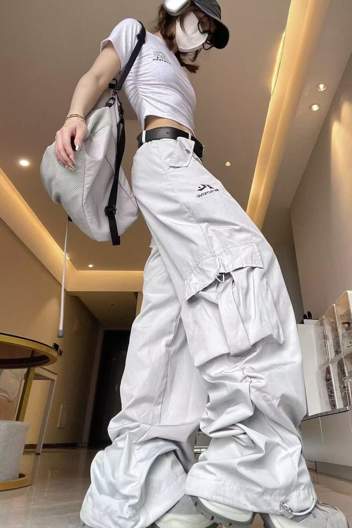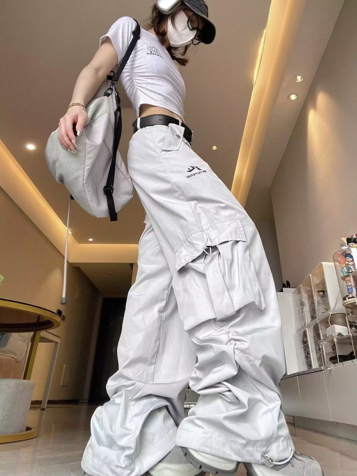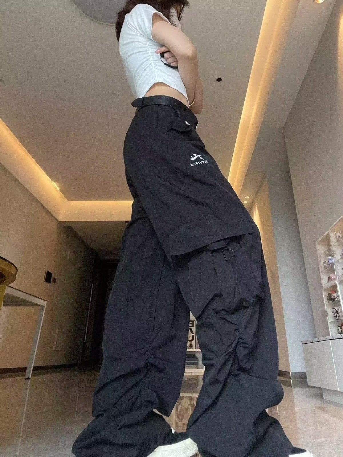 아메리칸 스타일 오프 화이트 빠른 건조 낙하산 병 충전 스포츠 바지 여자 여름 캐주얼 스트레이트 루즈 히팝 와이드 레그 바지스토어 가기