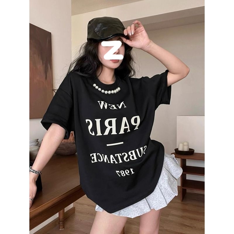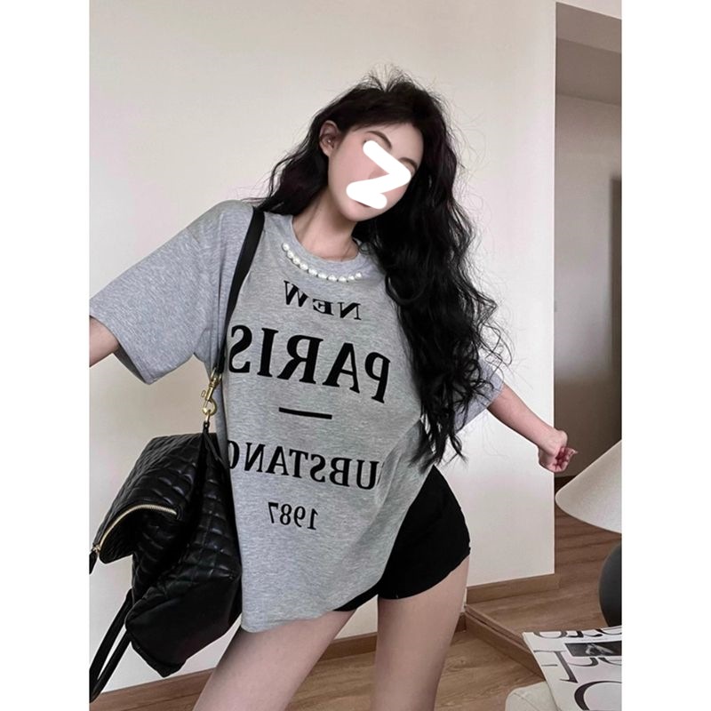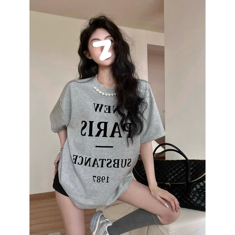 미국 복고풍 편지 인쇄 반팔 티셔츠 여성용 여름 디자인 센스 진주 크루 넥 캐주얼 탑 그레이스토어 가기