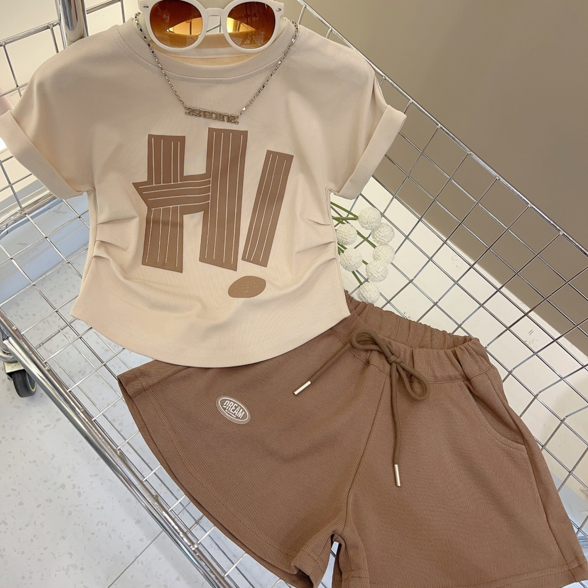 소녀 세트 2025 새로운 여름 캐주얼 인쇄 세트 반팔 반바지 패션 어린이 투피스 유행 세트