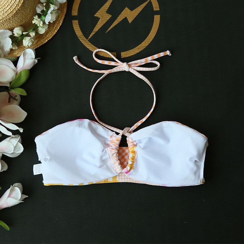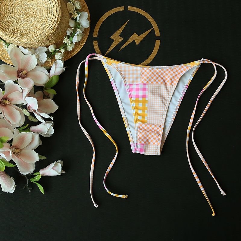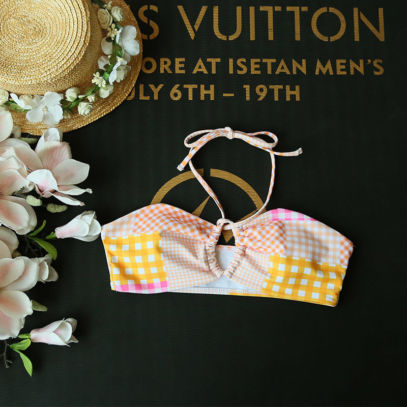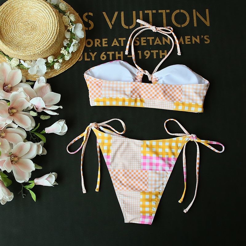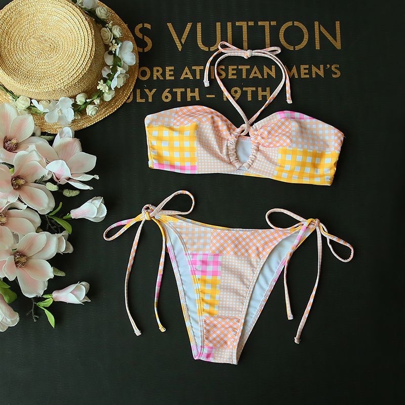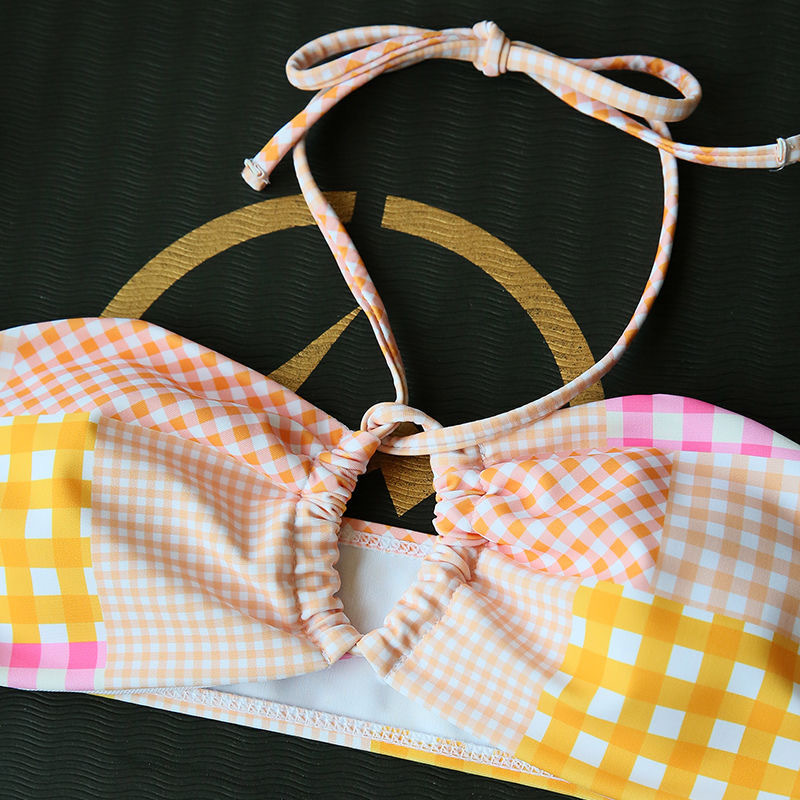 핑크 오렌지 격자 무늬 프린트 스트랩리스 비키니 스트랩 트리플 비키니 서핑 수영복 여성 스파이스 걸 싼야 휴가스토어 가기