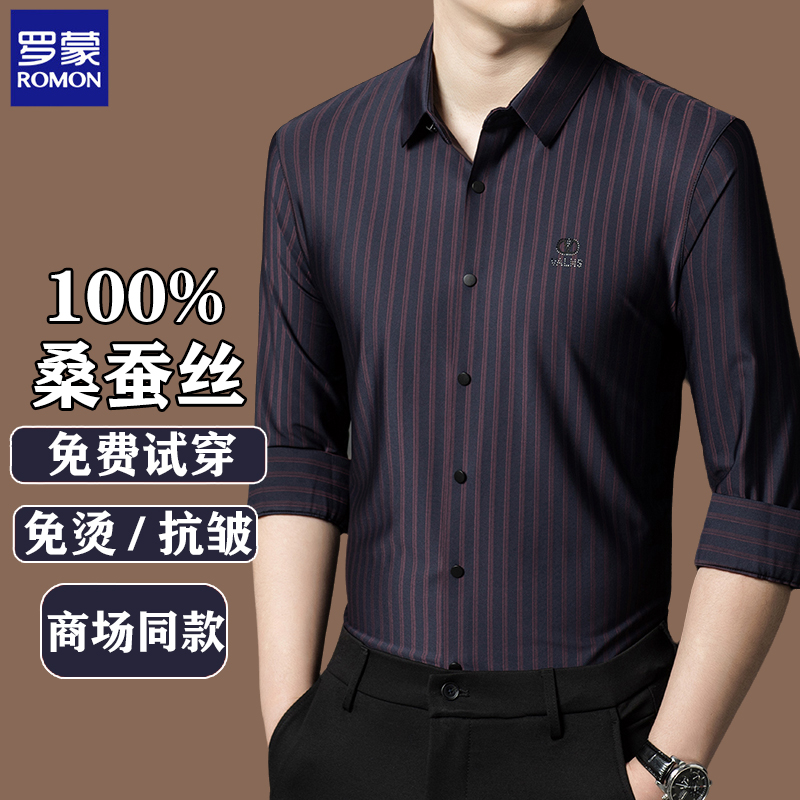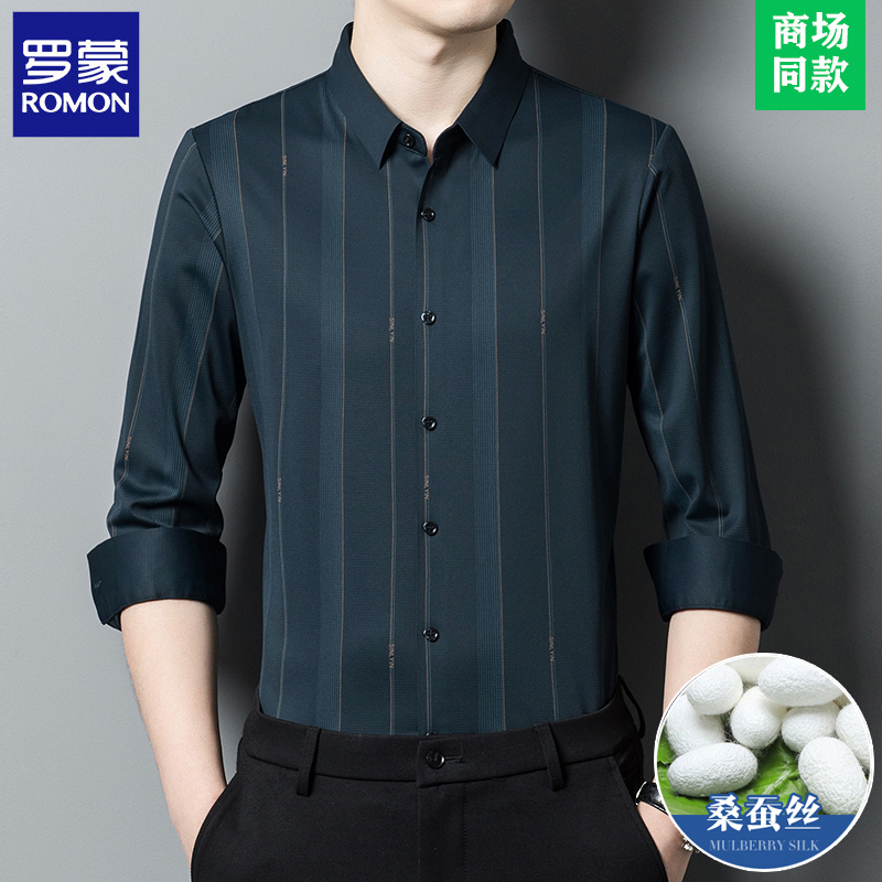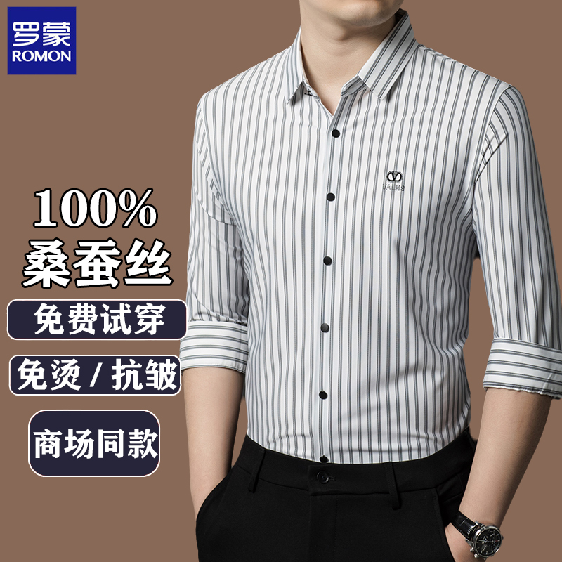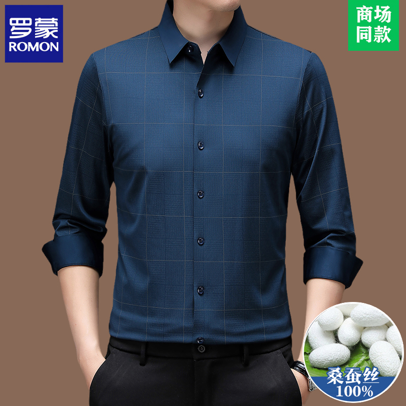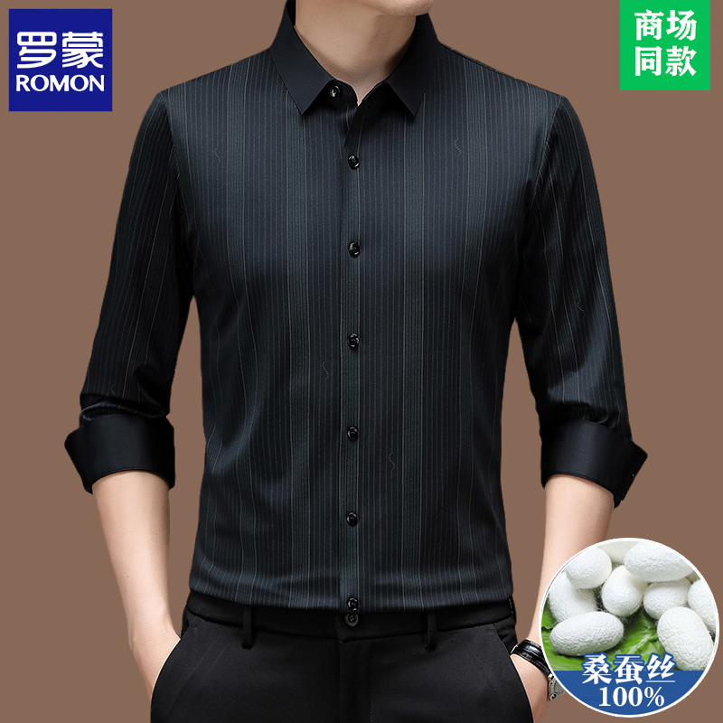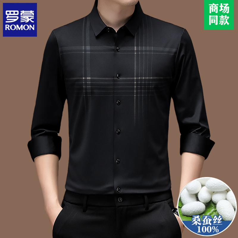 Ly罗蒙高级感100%桑蚕丝长袖衬衫男士秋冬季商务休闲加绒加厚衬衣스토어 가기