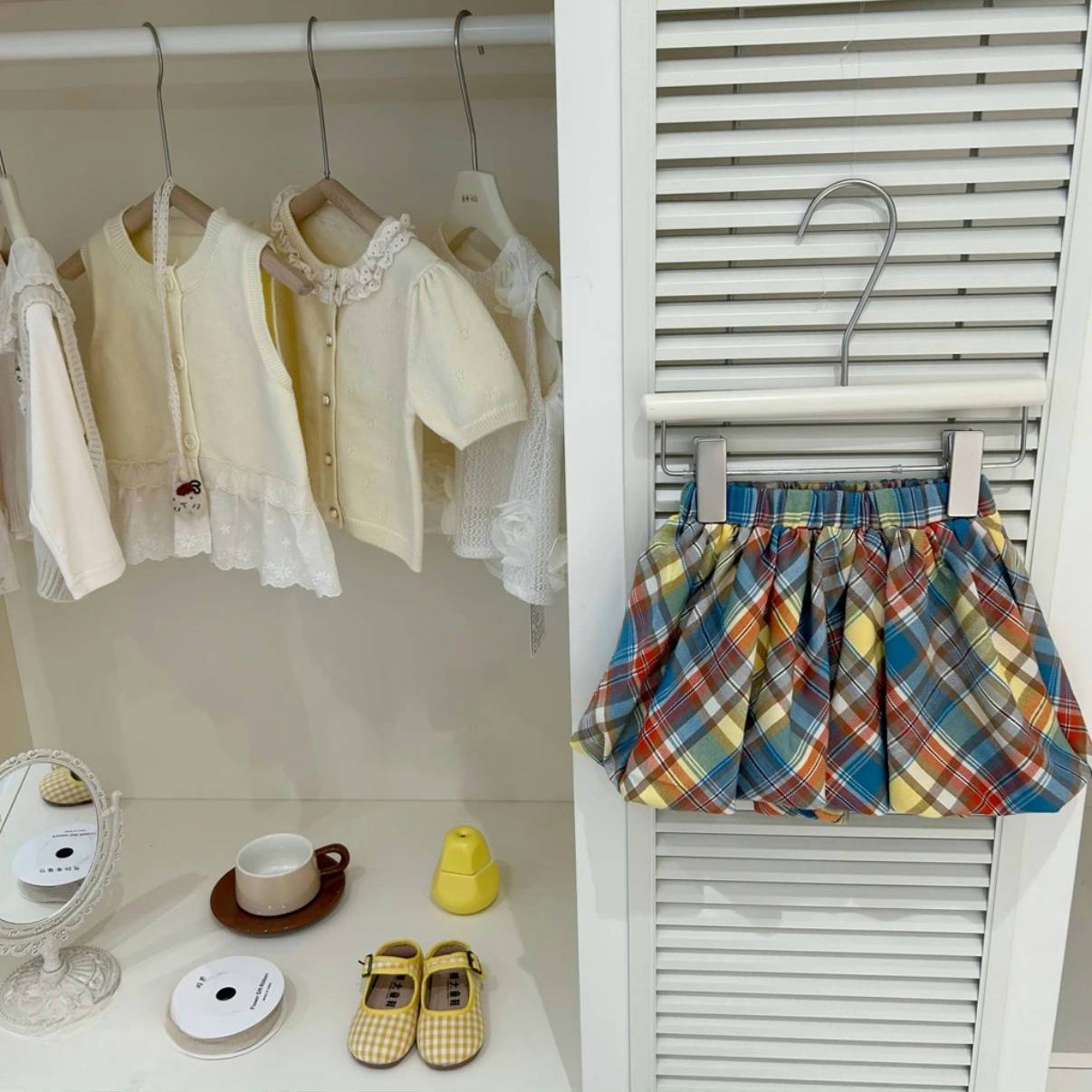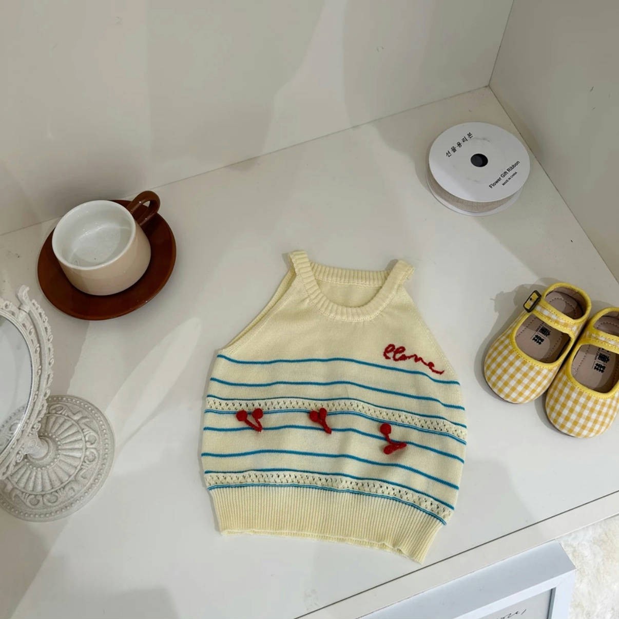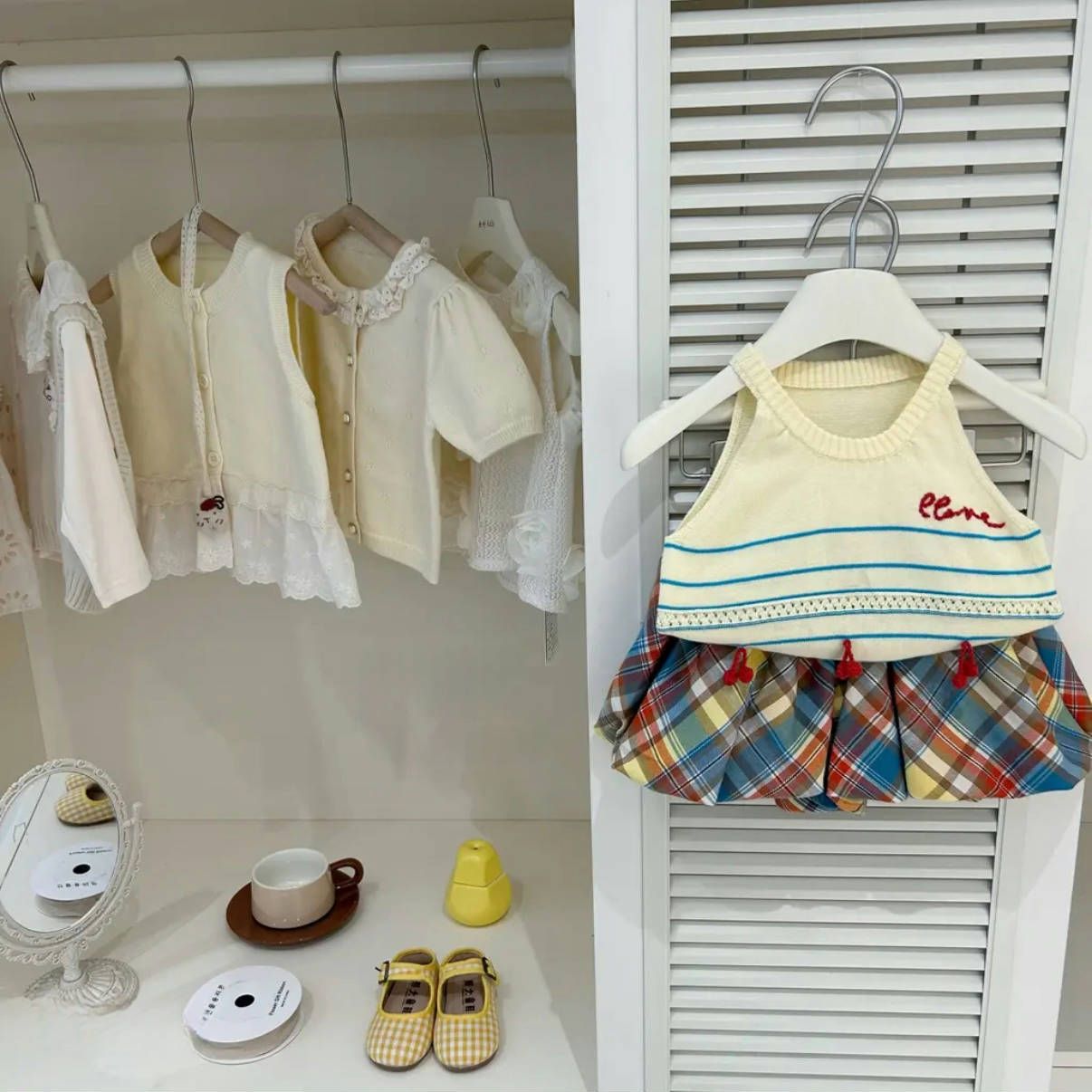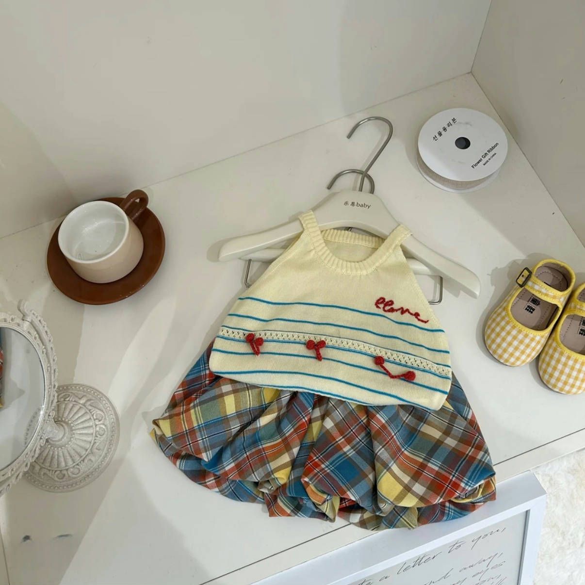 한국식 아동복 소녀 세트 봄과 여름 2025 새로운 도착 소녀 니트 셔츠, 서스펜더 격자 무늬 2 피스 바지 세트스토어 가기