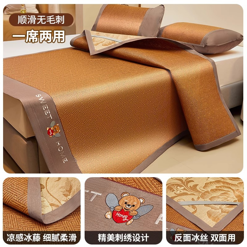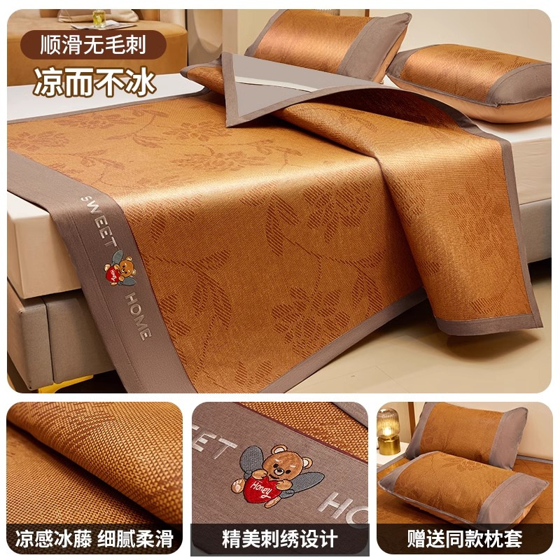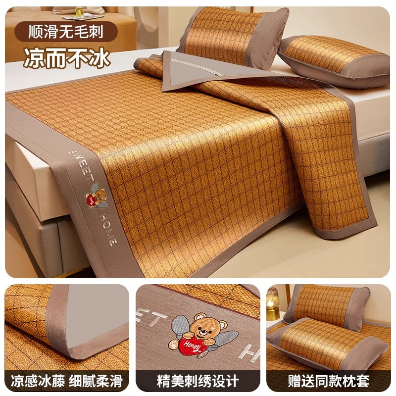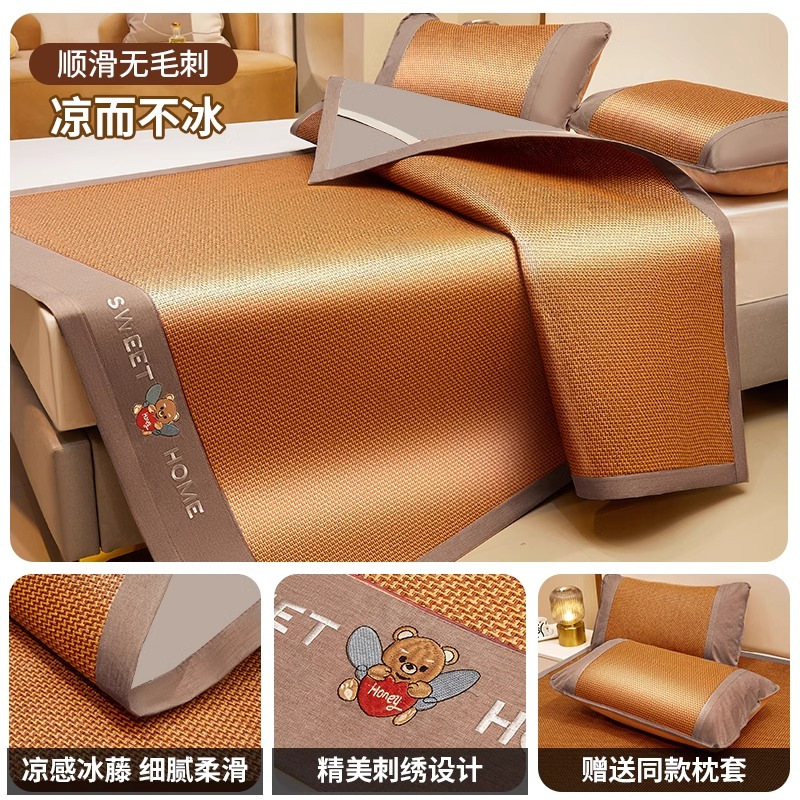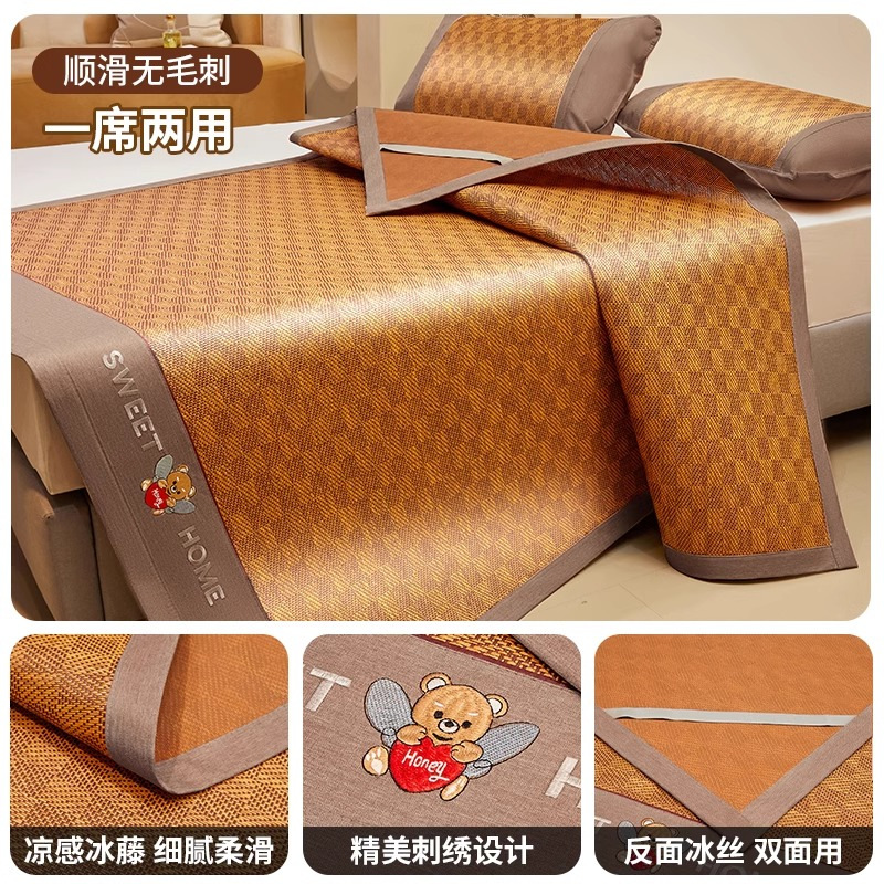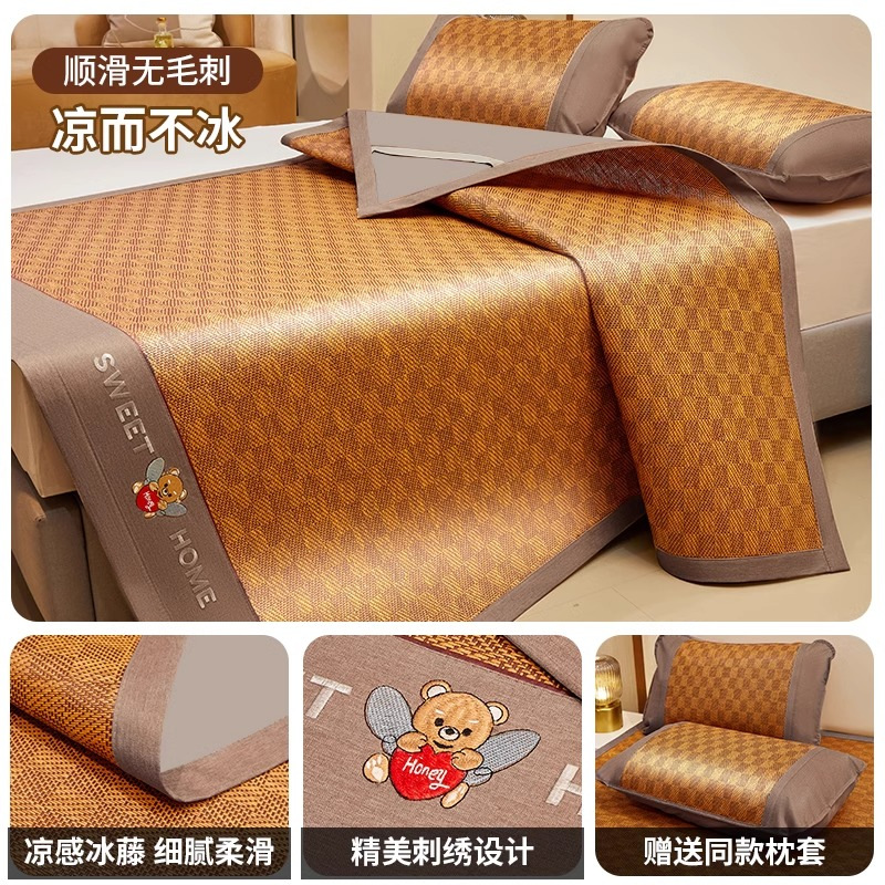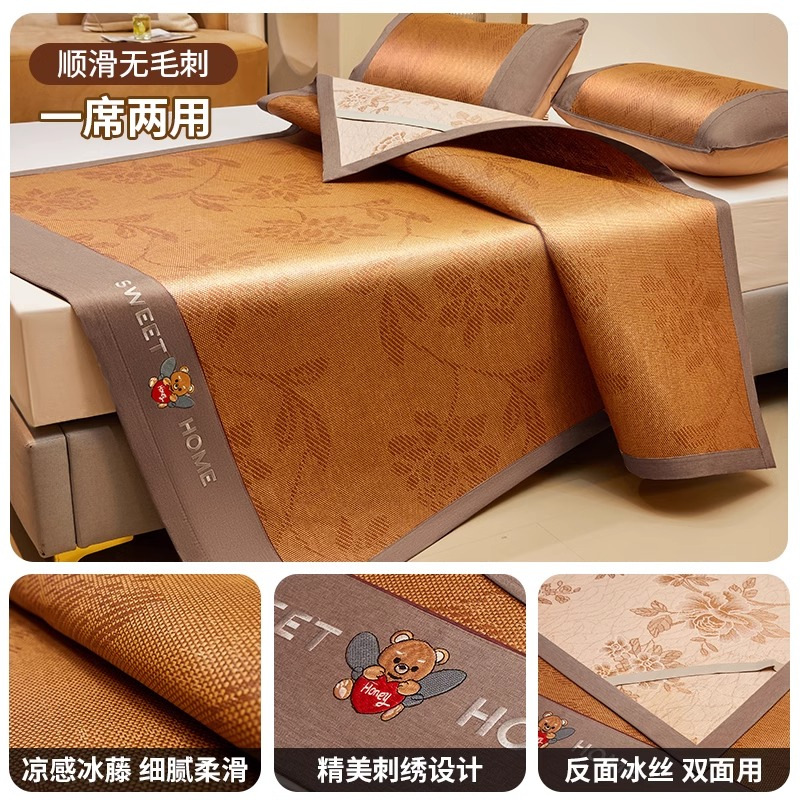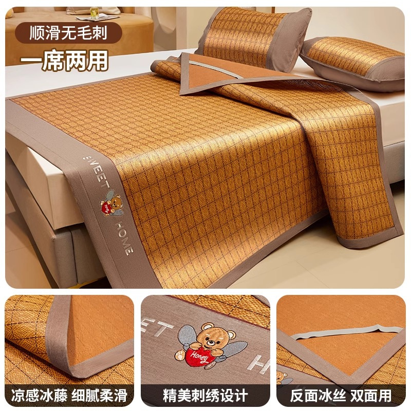 2025 심플 베어 수 놓은 아이스 등나무 매트 3 조각 접이식 홈 싱글 더블 학생 소프트 매트 라이브 방송스토어 가기