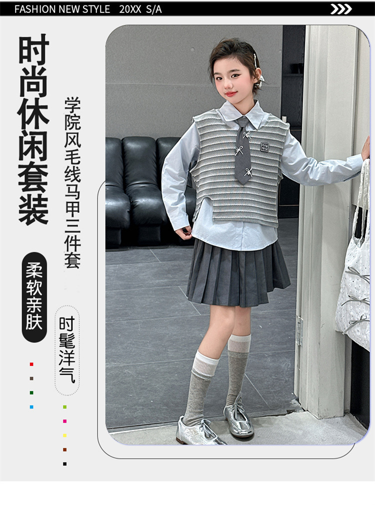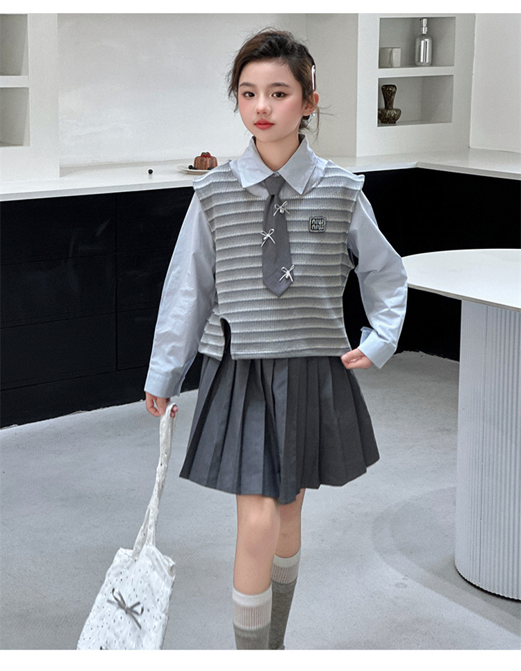 소녀 아카데미 스타일 세트 2025 봄과 가을 새 스타일 소녀의 니트 조끼 셔츠 주름 치마 3 종 세트스토어 가기