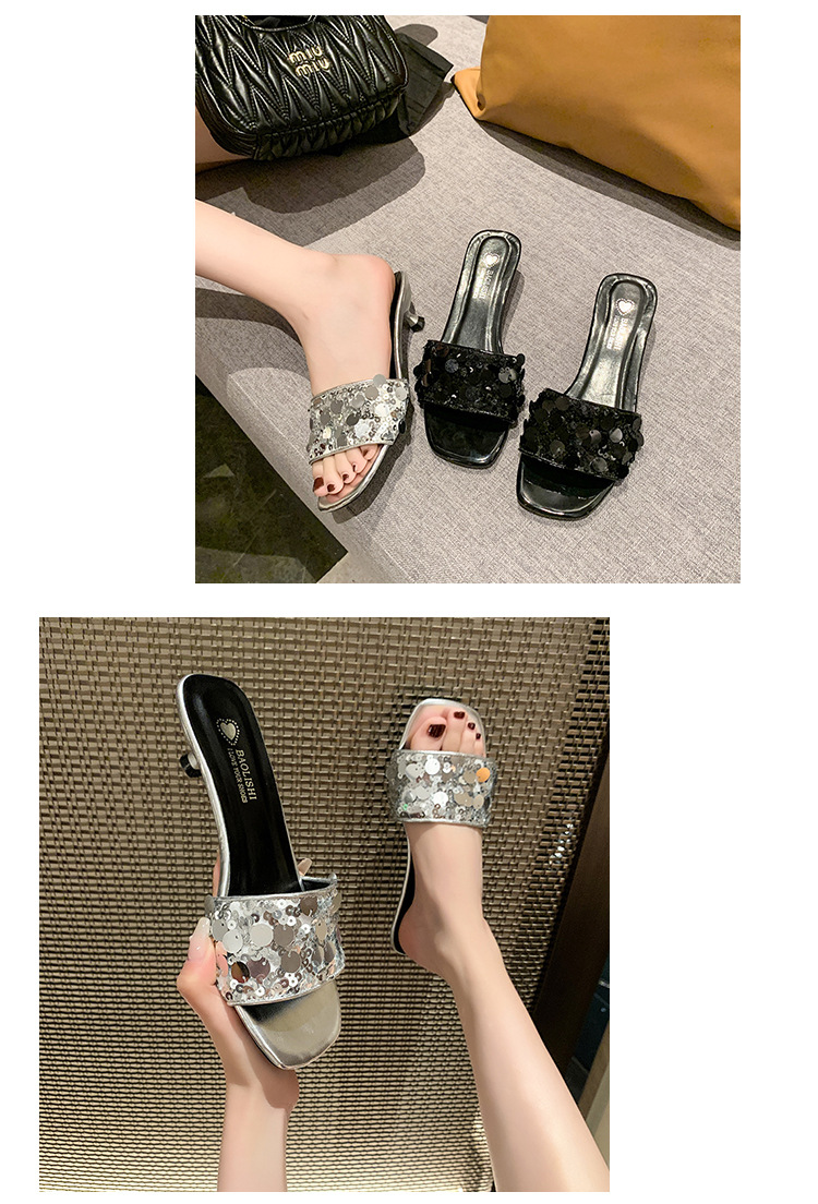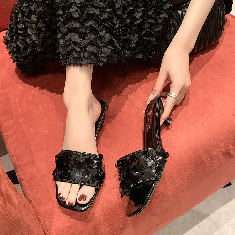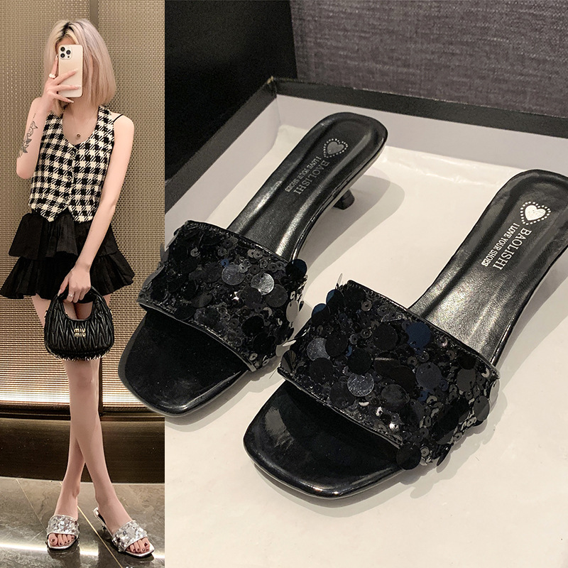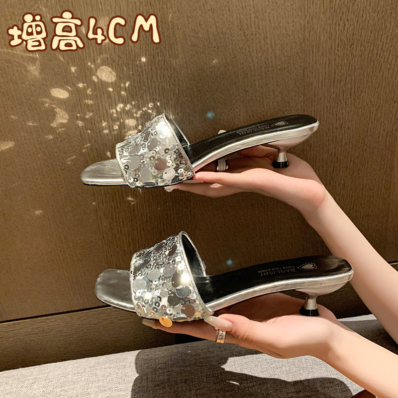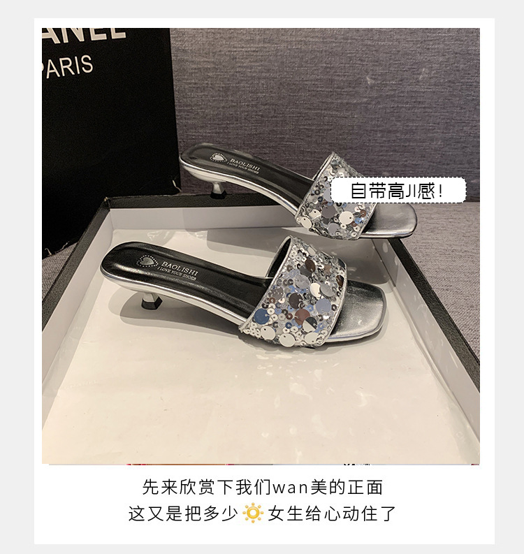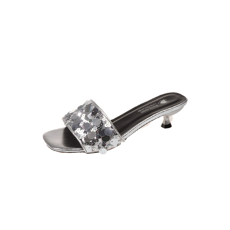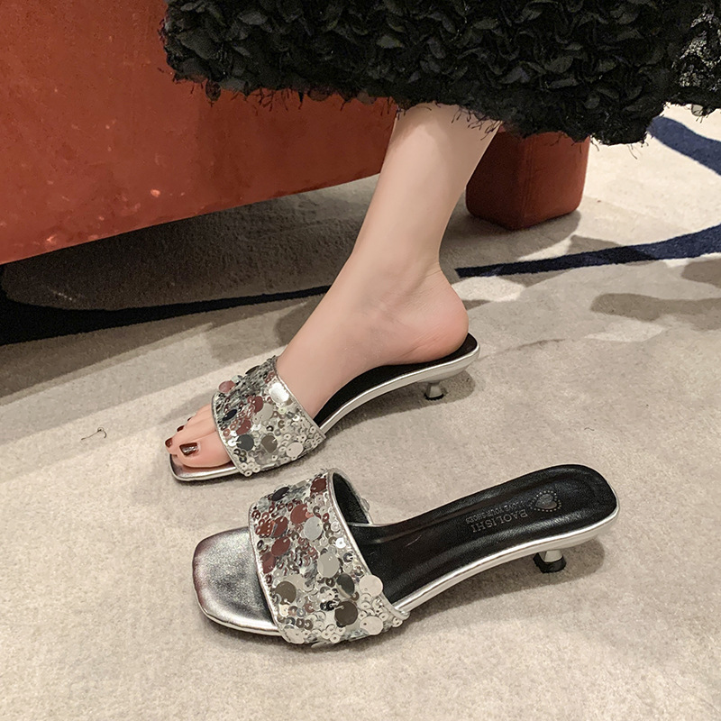 프랑스 스타일 라인스톤 속편 얇은 뒤꿈치 슬리퍼 여성 여름 착용 2025 새로운 저발 고급 실버 샌들스토어 가기