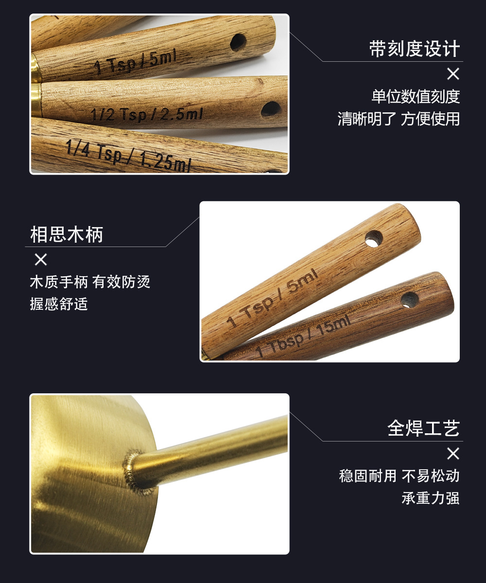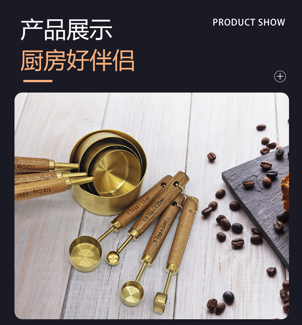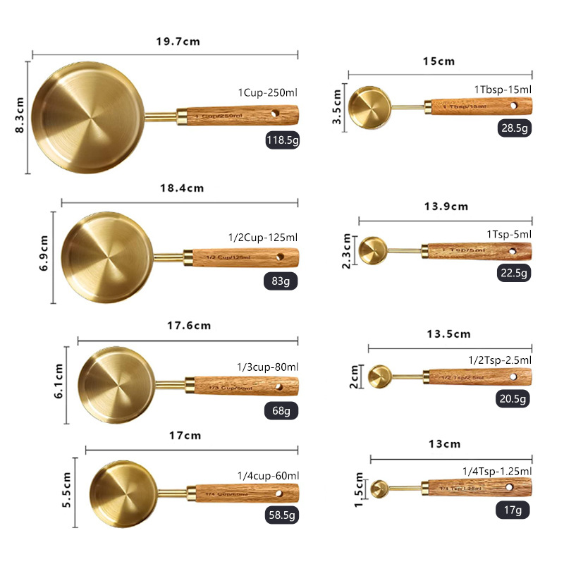 공장 직접 공급 스테인레스 스틸 금도금 측정 컵 나무 손잡이 측정 컵 눈금 측정 컵 측정 숟가락 8 피스 세트스토어 가기