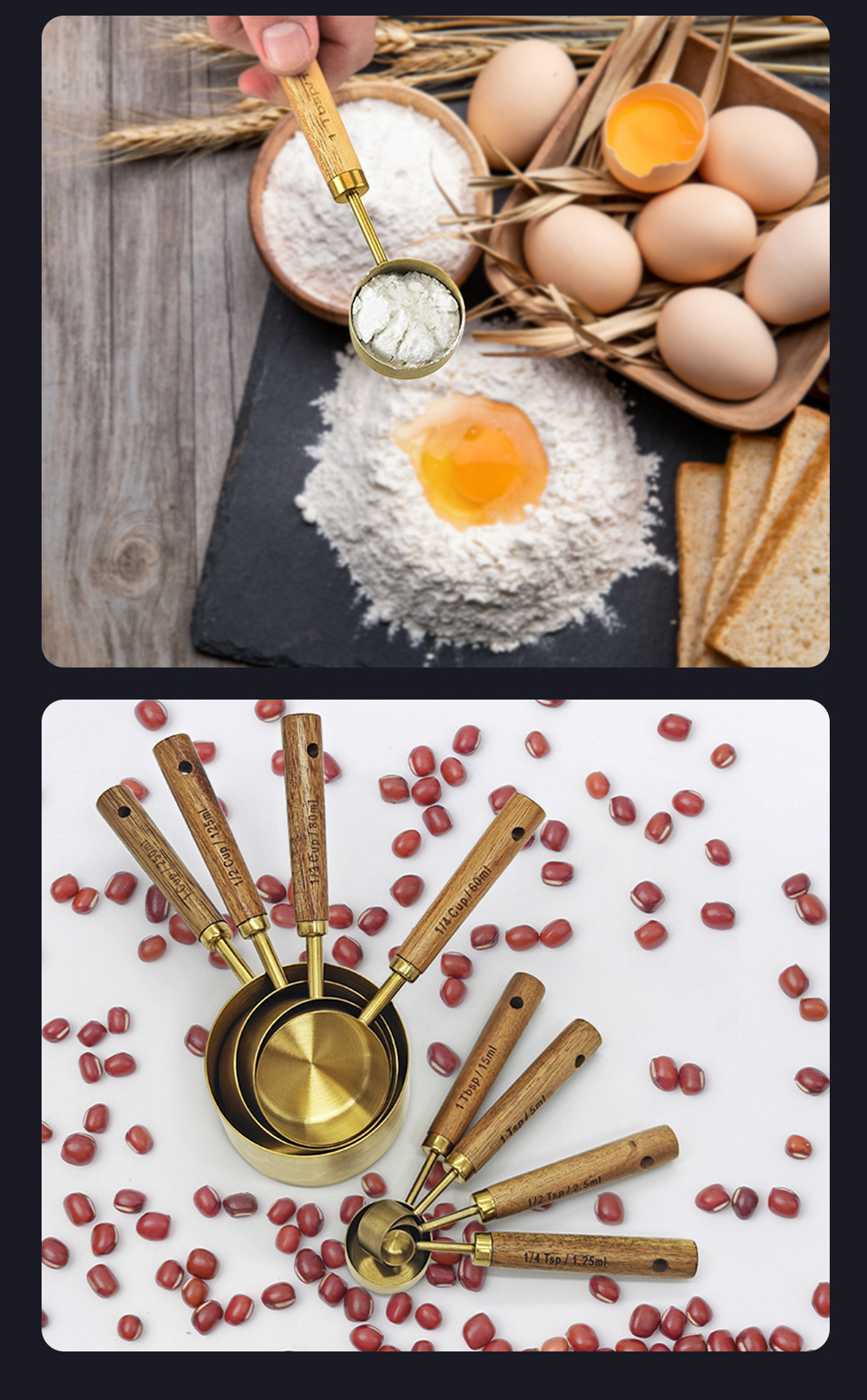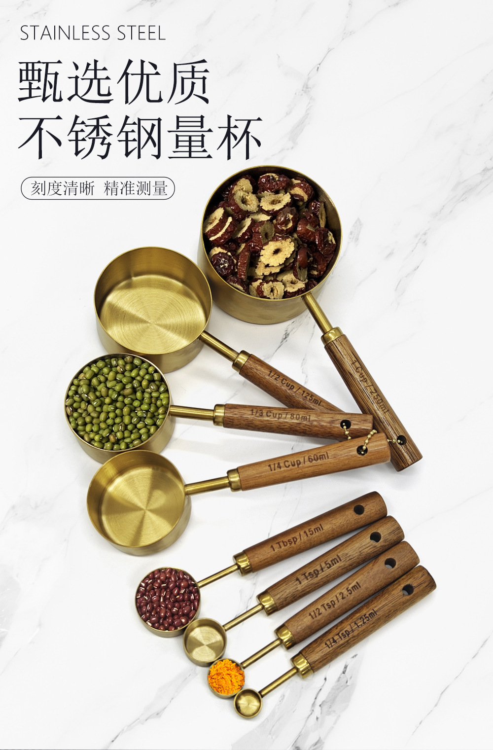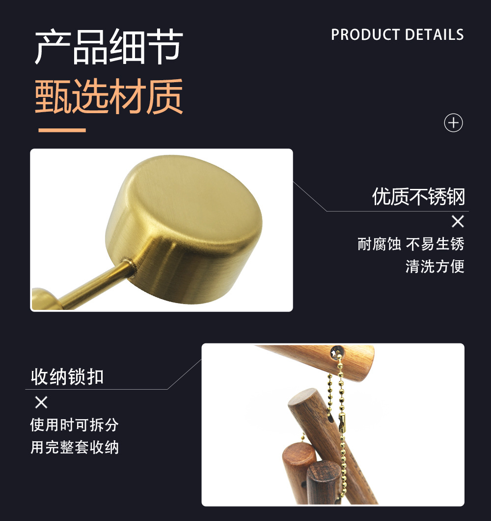 공장 직접 공급 스테인레스 스틸 금도금 측정 컵 나무 손잡이 측정 컵 눈금 측정 컵 측정 숟가락 8 피스 세트스토어 가기