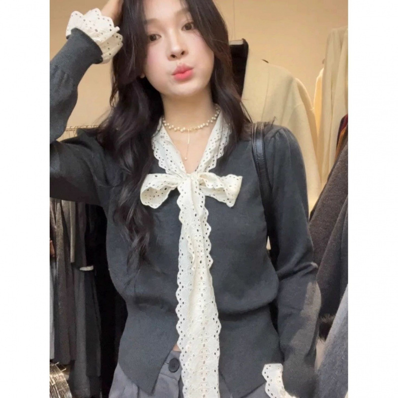 이른 봄 레이스 활 V-넥 스웨터 니트 스웨터 여성용 봄과 가을 우유 달콤한 소프트 왁스 롱 슬리브 탑 착용스토어 가기
