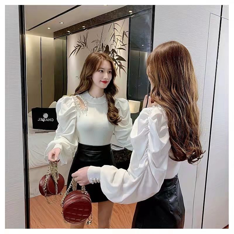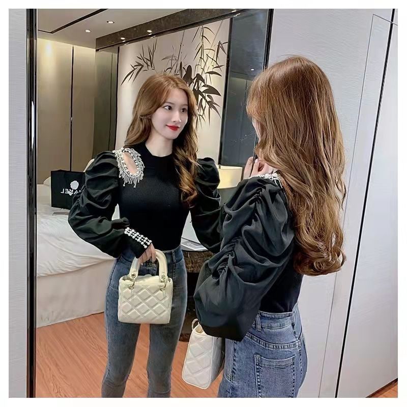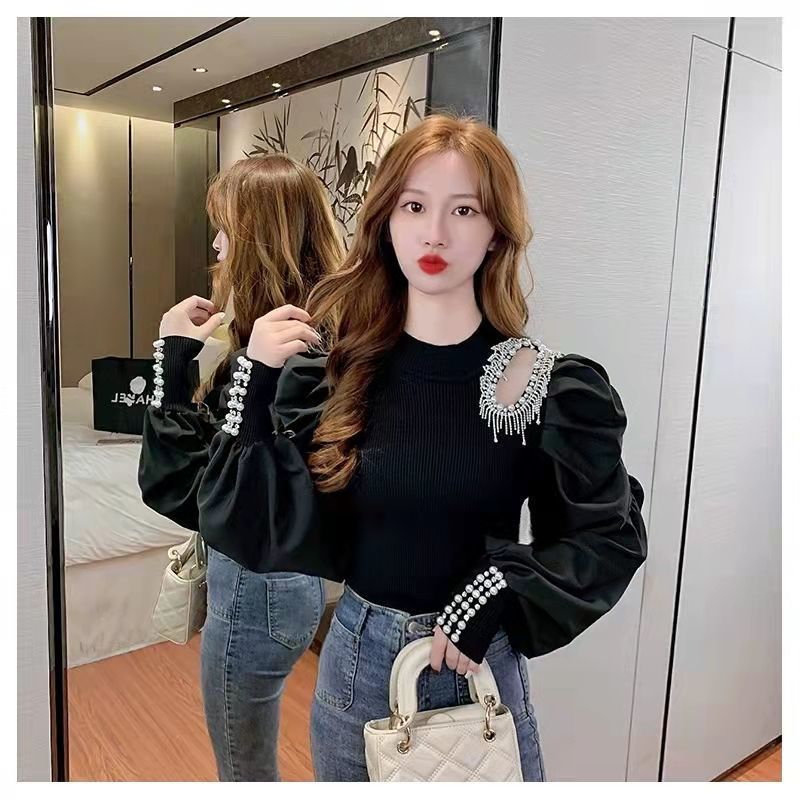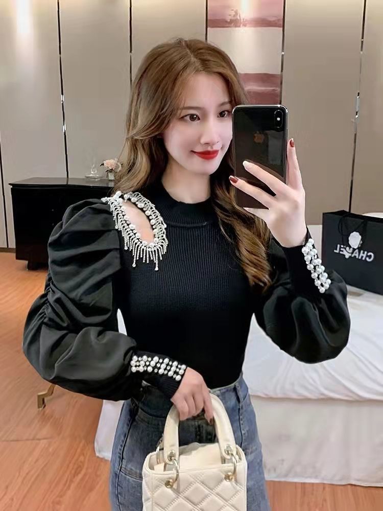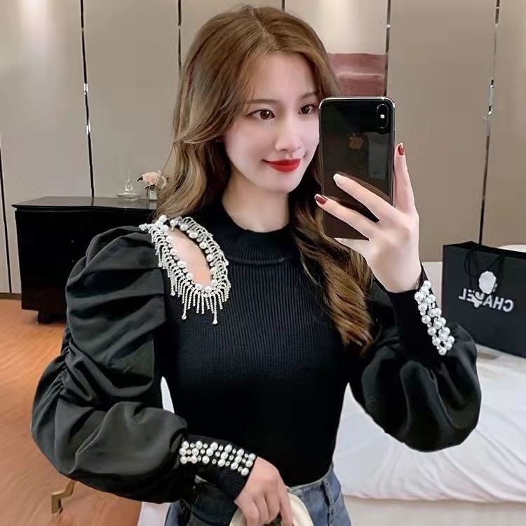 서양식 랜턴 슬리브 스티칭 니트웨어 2023 달콤한 중공업 구슬 캐리 머신 할로우 디자인 센스 베이스 셔츠 여성스토어 가기