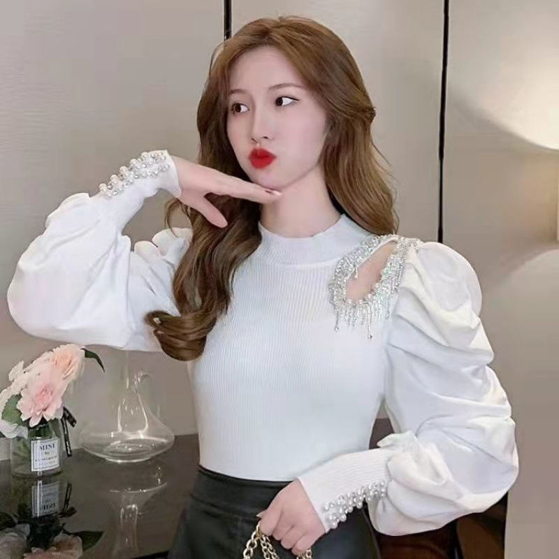 서양식 랜턴 슬리브 스티칭 니트웨어 2023 달콤한 중공업 구슬 캐리 머신 할로우 디자인 센스 베이스 셔츠 여성