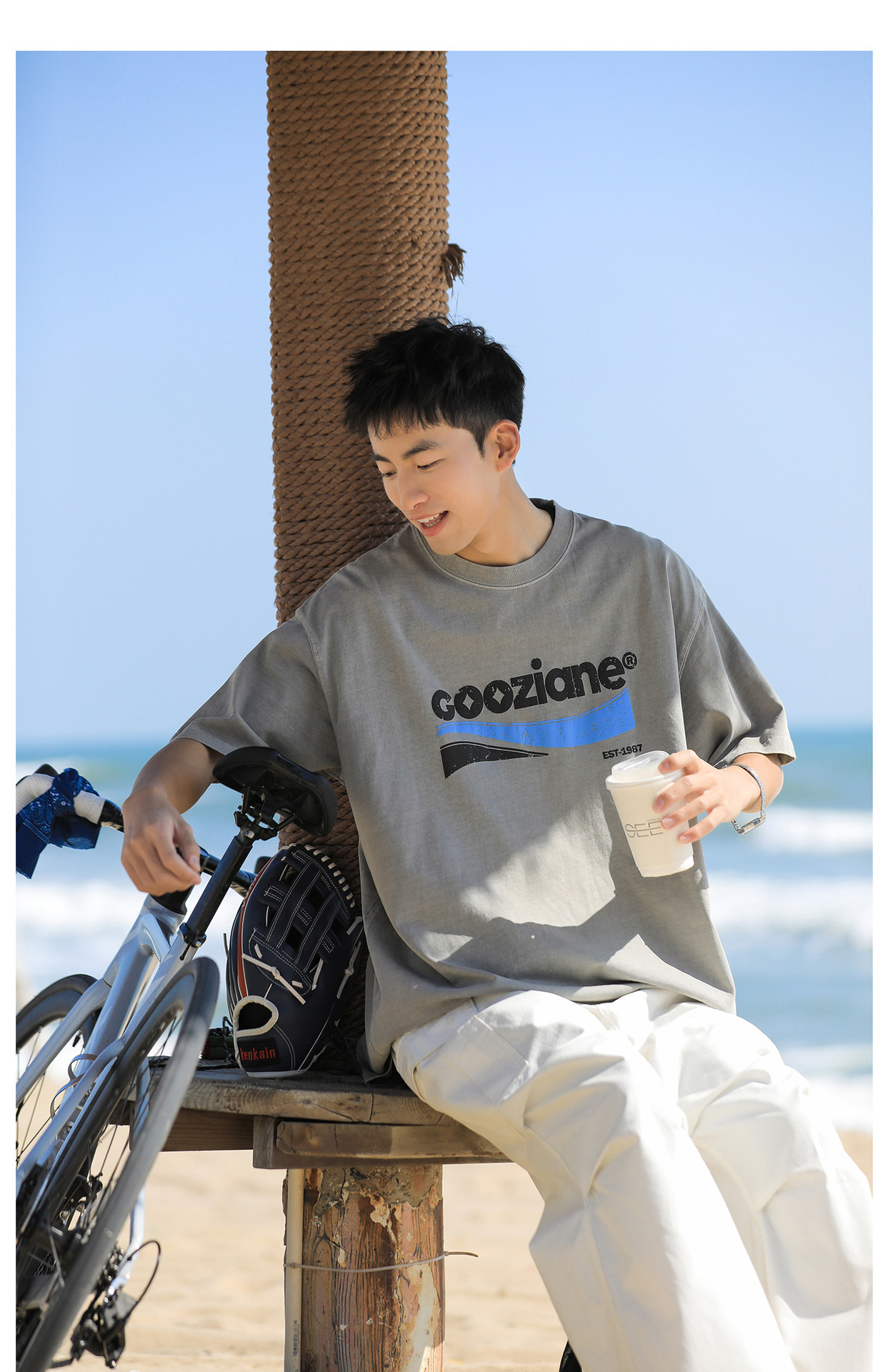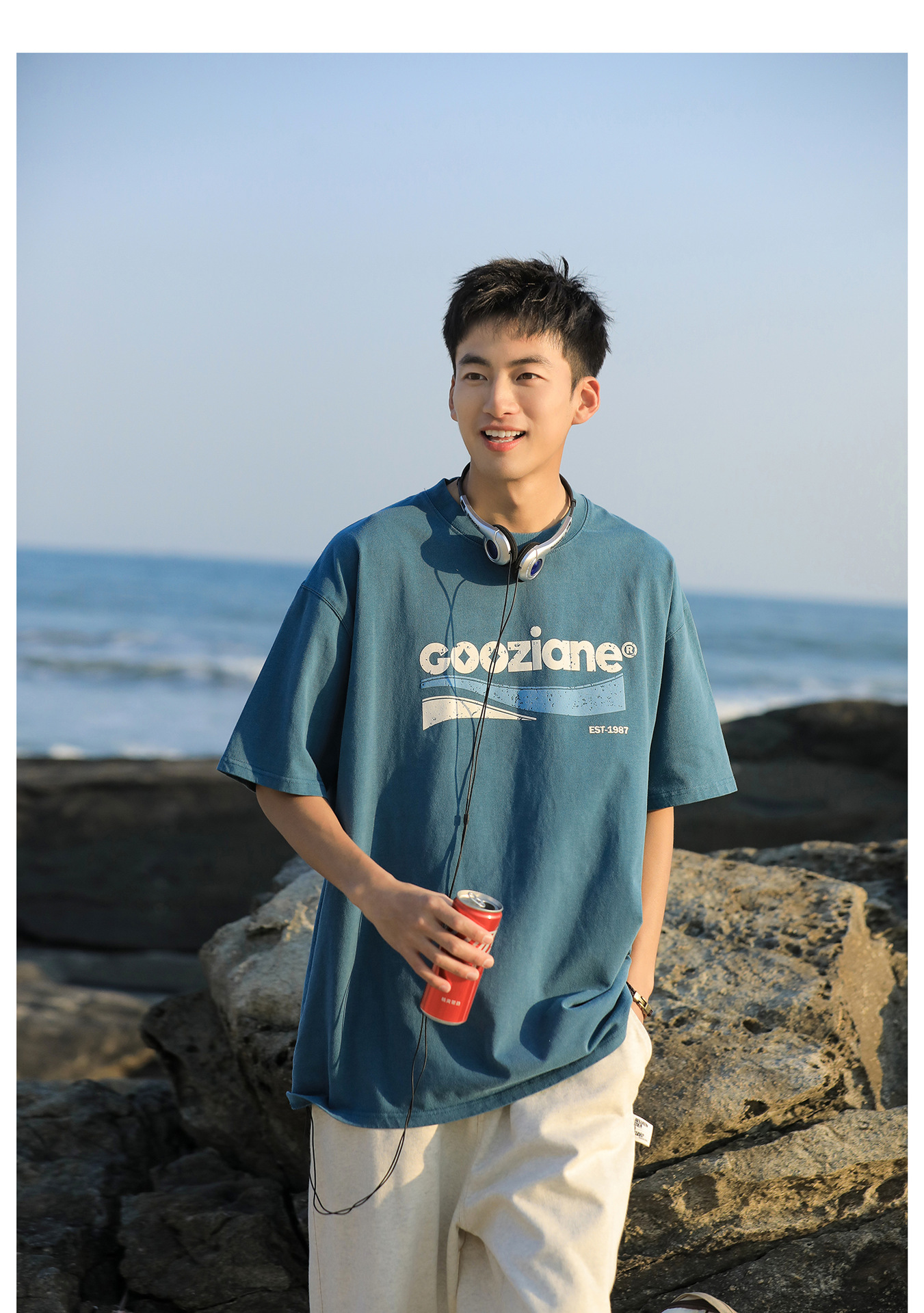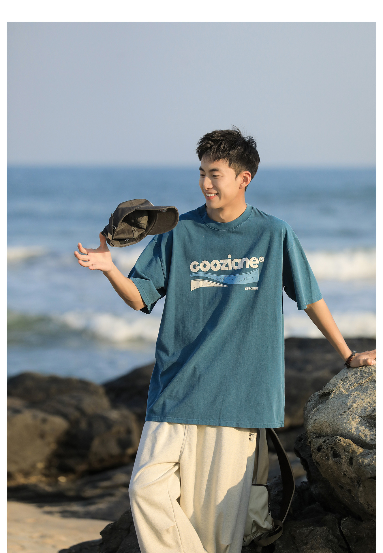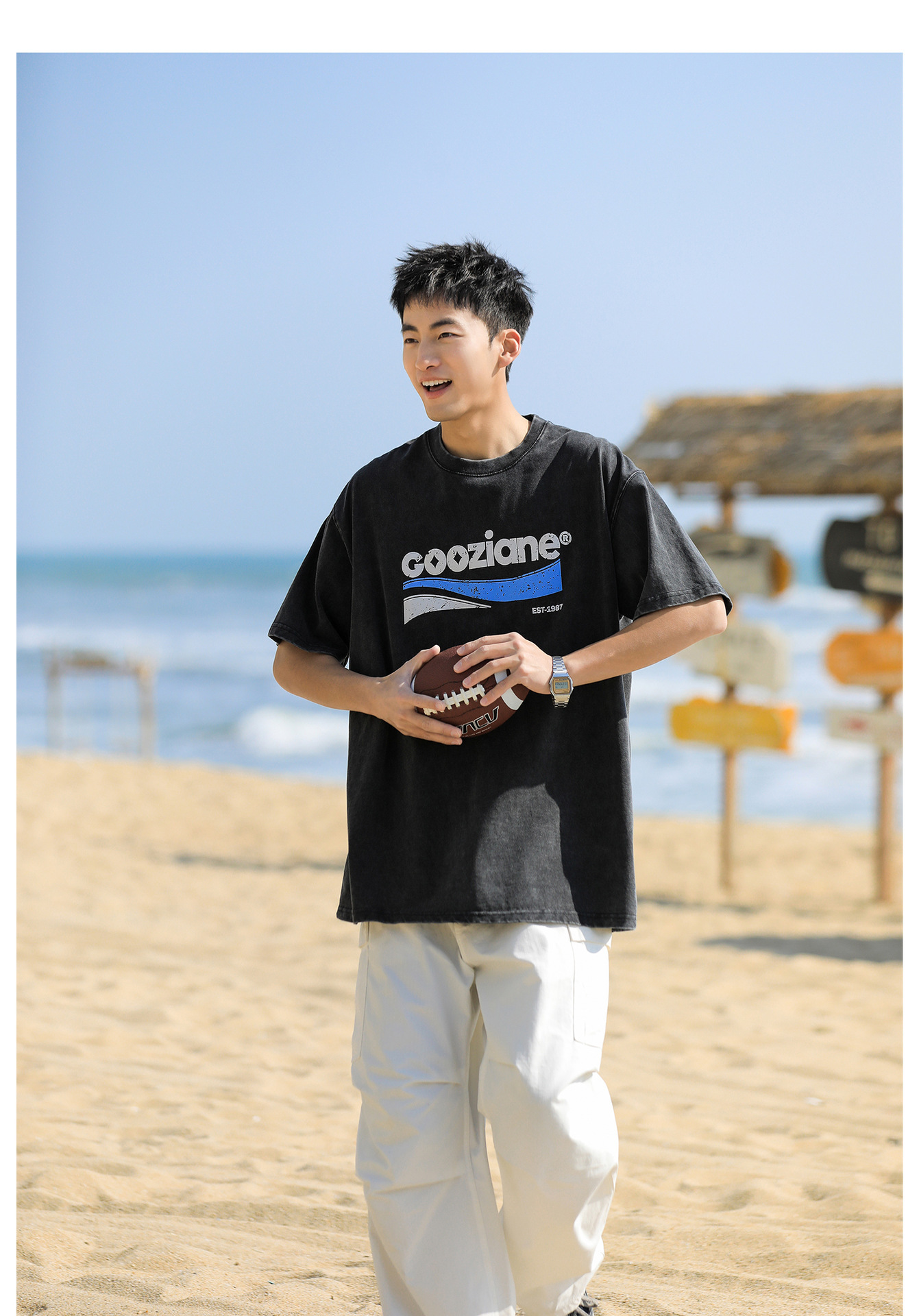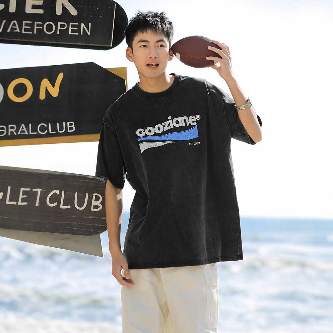 공장 직접 공급 220g 무거운 인쇄 세척 짧은 소매 티셔츠 남성 2025 여름 미국 복고풍 소년 반소매