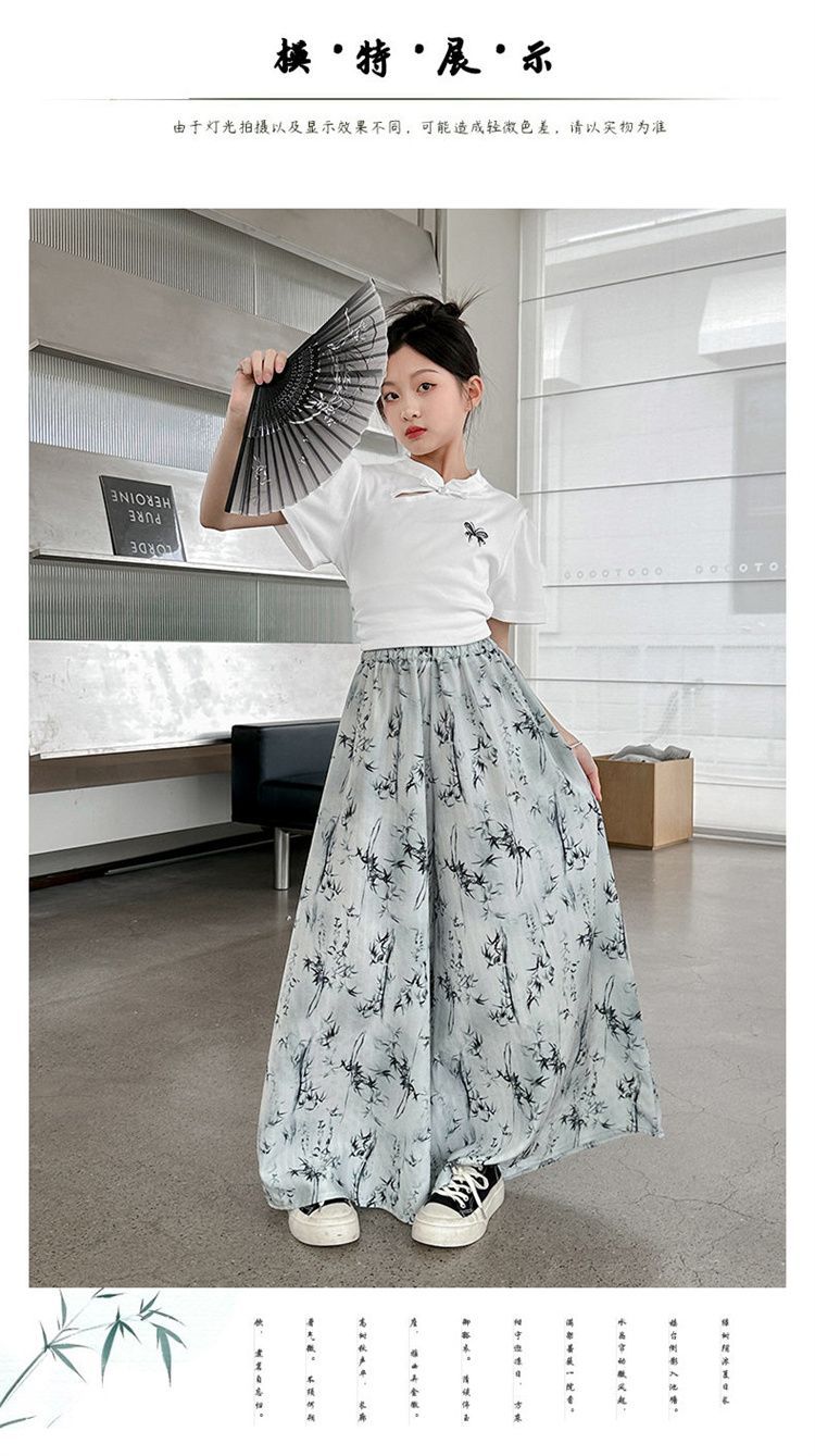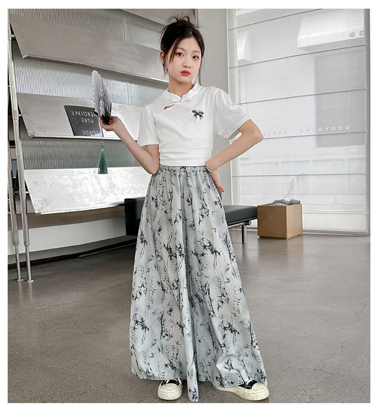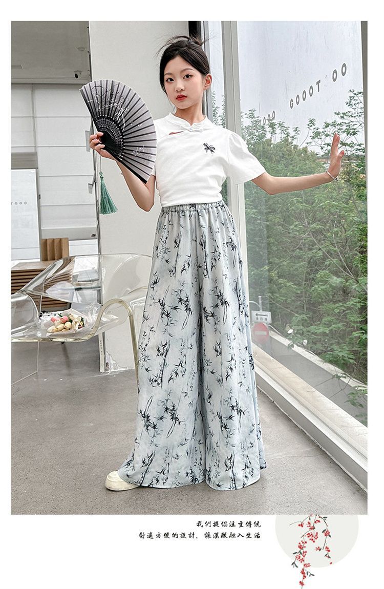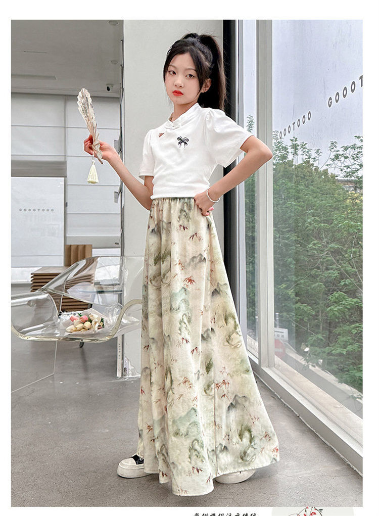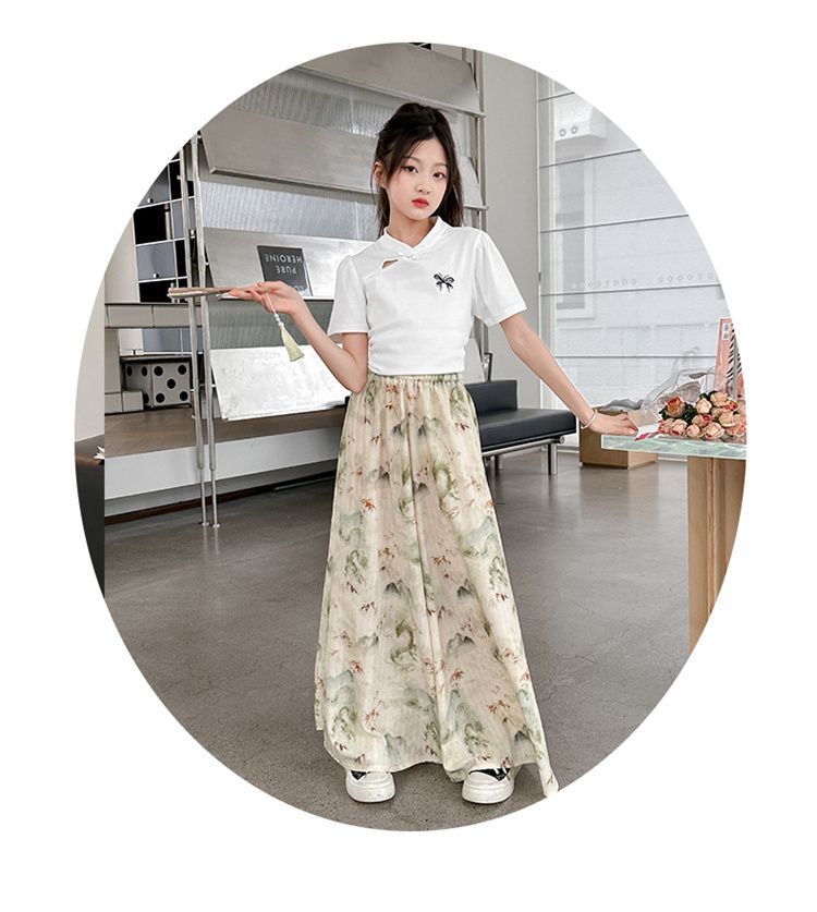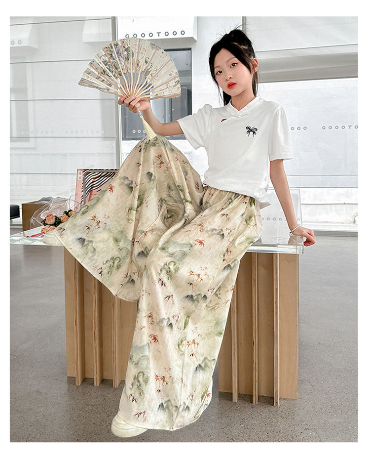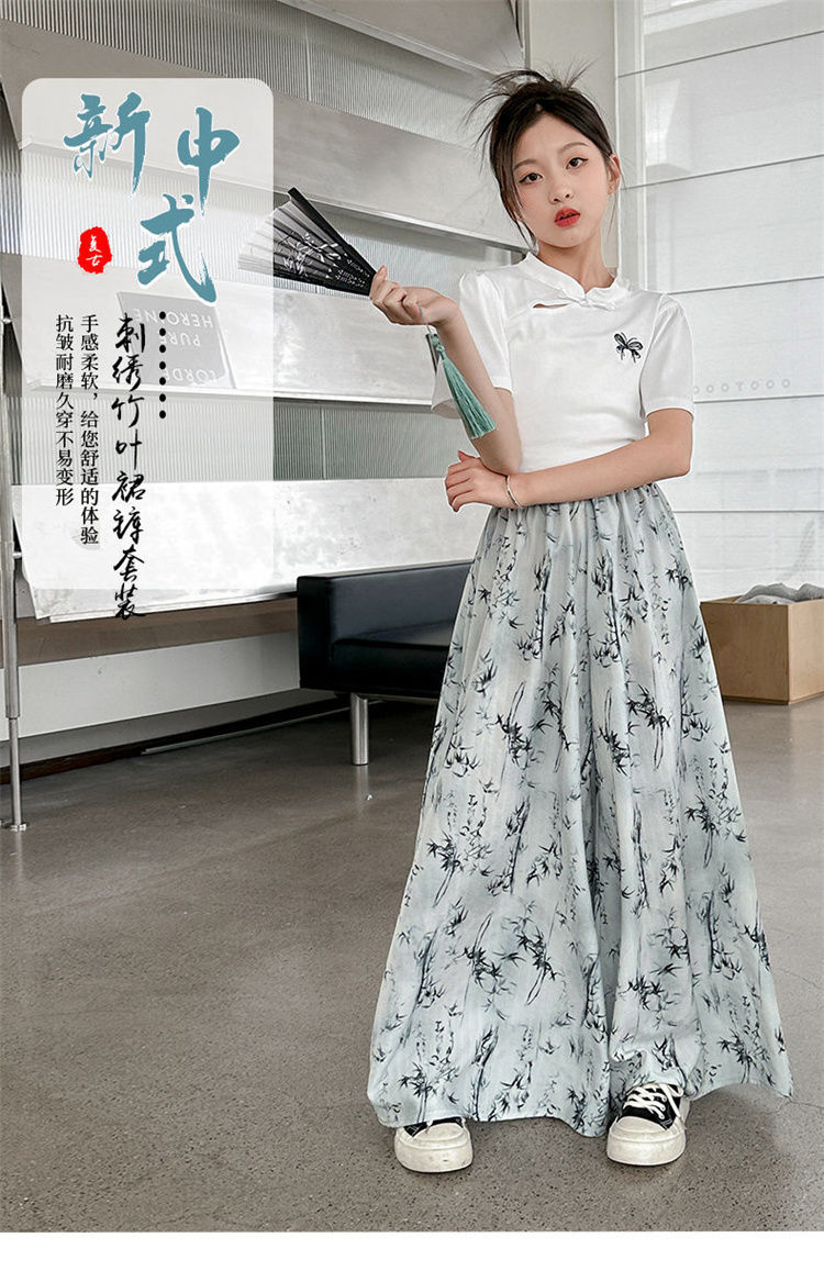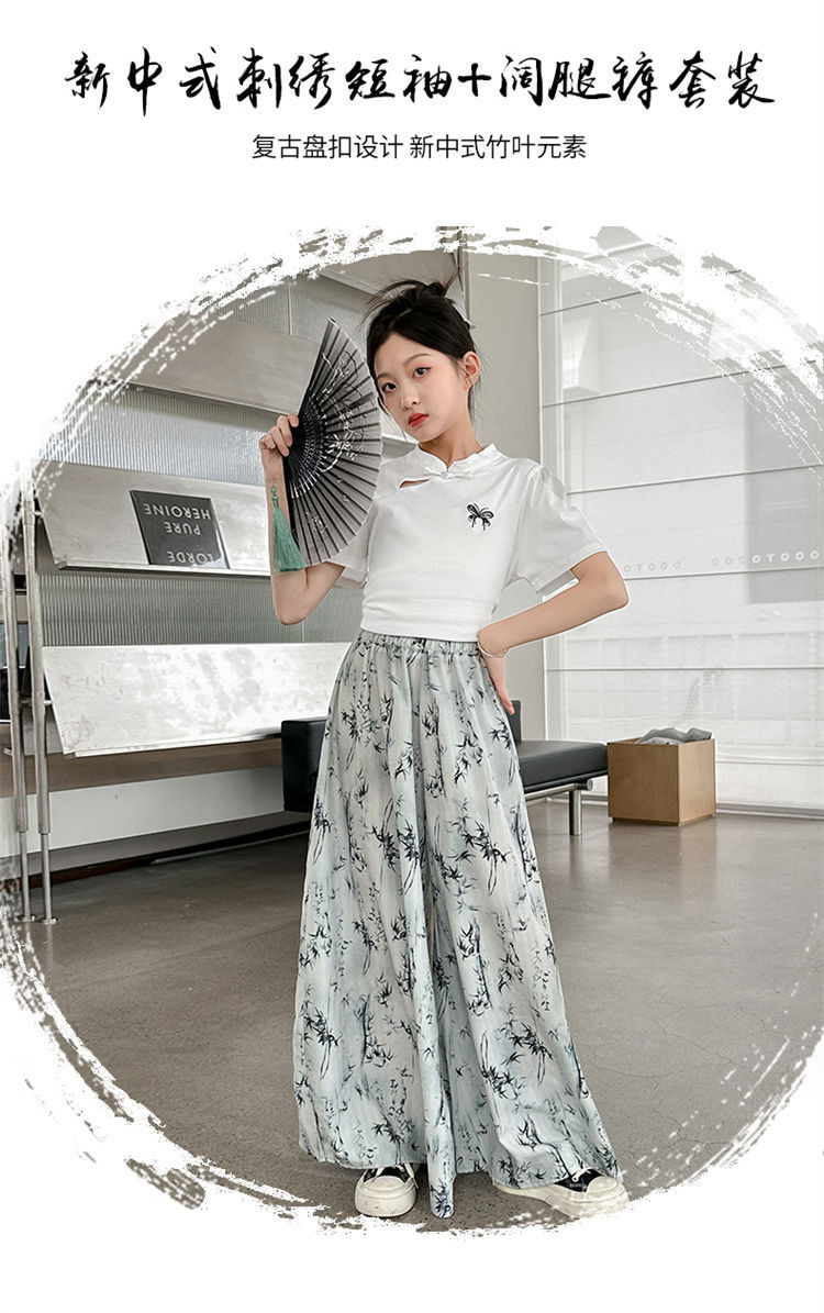 새로운 어린이 투피스 세트 2025 중국 스타일 큰 어린이 여름 잉크 그림 소녀의 여름 세트