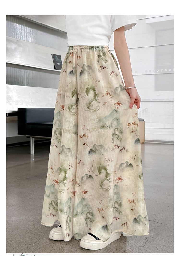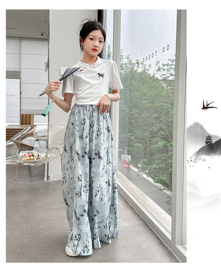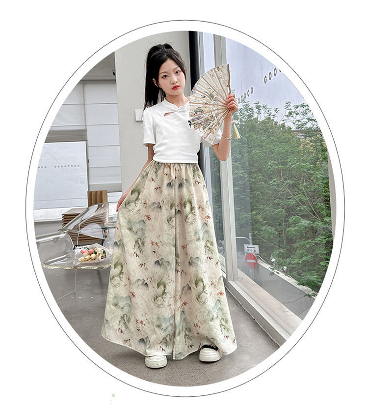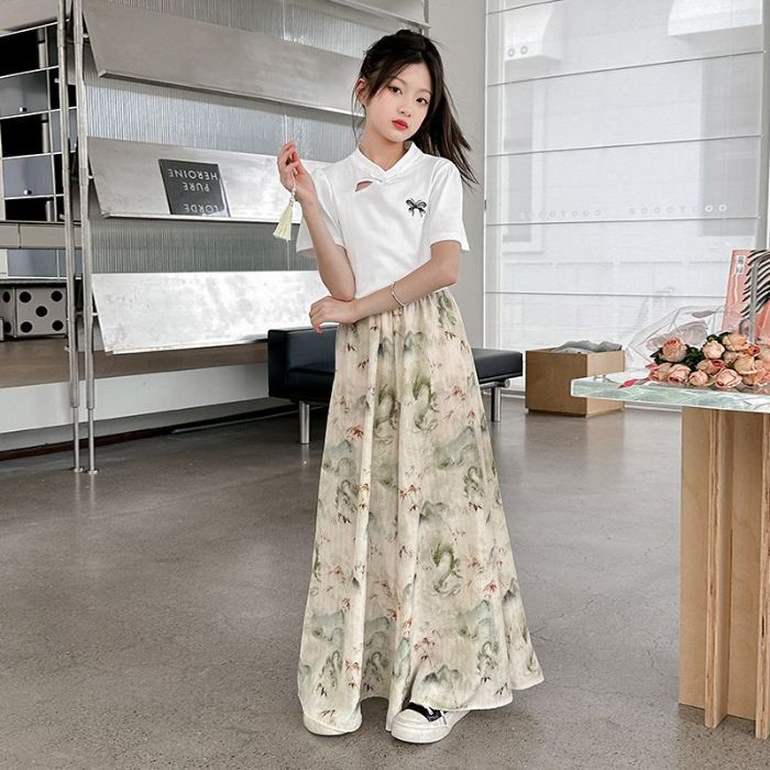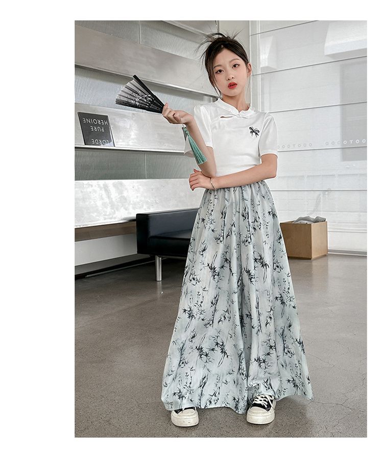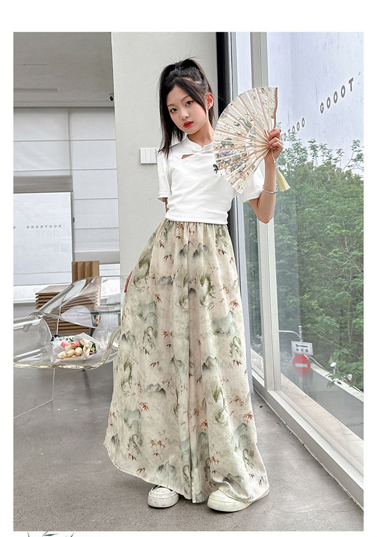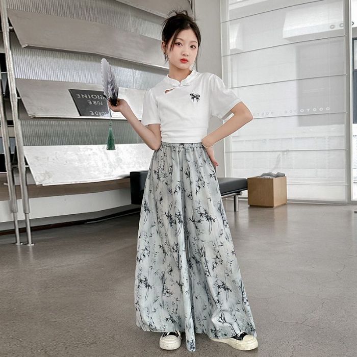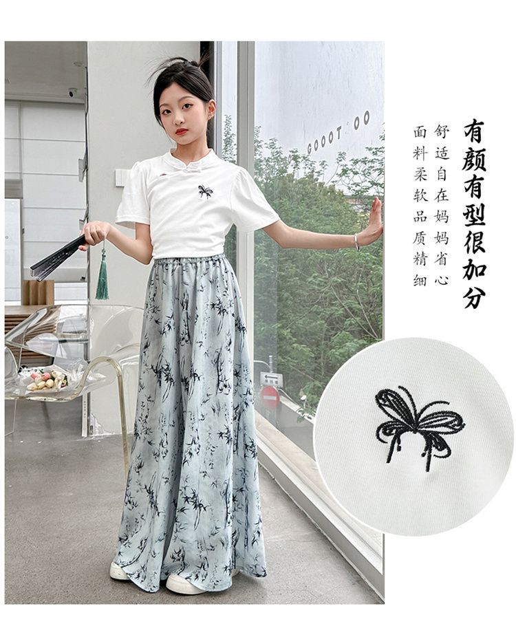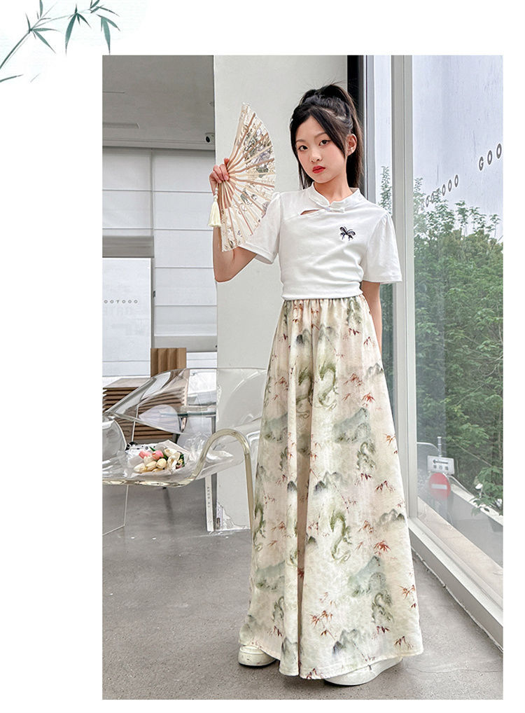 새로운 어린이 투피스 세트 2025 중국 스타일 큰 어린이 여름 잉크 그림 소녀의 여름 세트