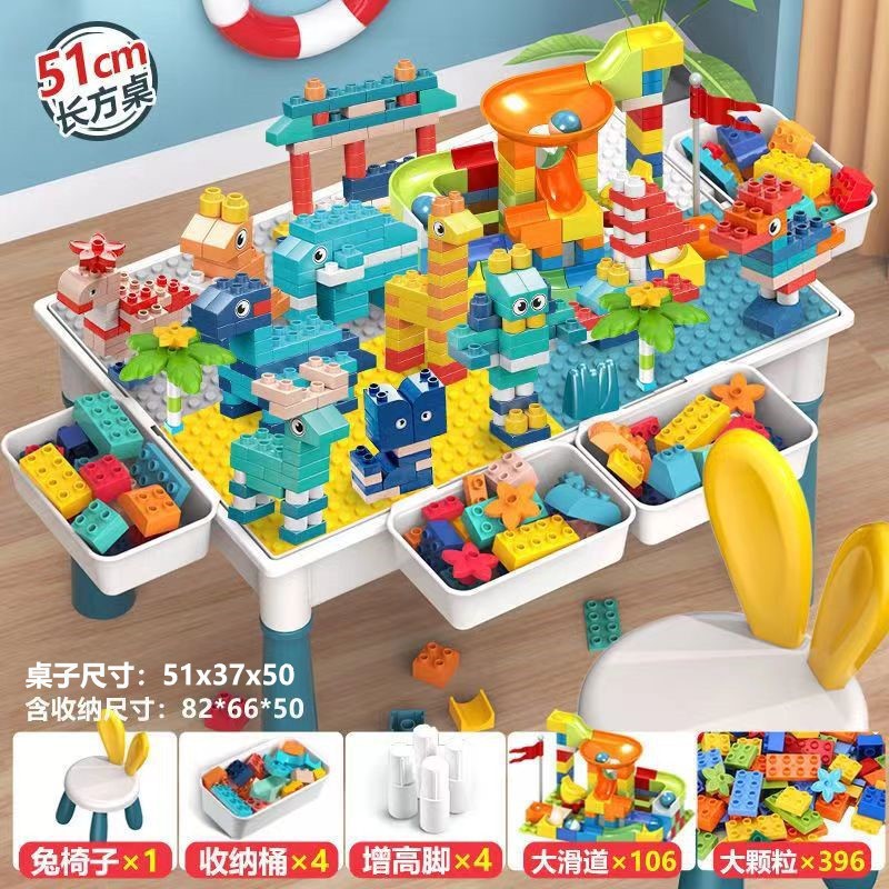 • 확대되고 두꺼워진 테이블 + 토끼 의자 2개 + 공룡 슬라이드 215개 + 대형 입자 312개 + 자동차 134개 + 수납 공간 44개