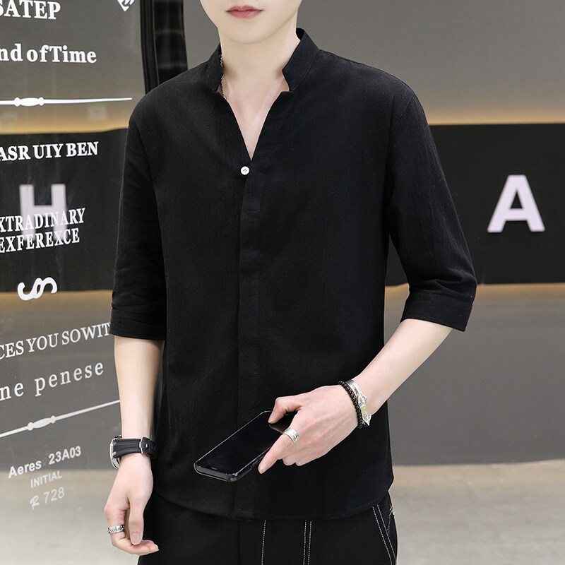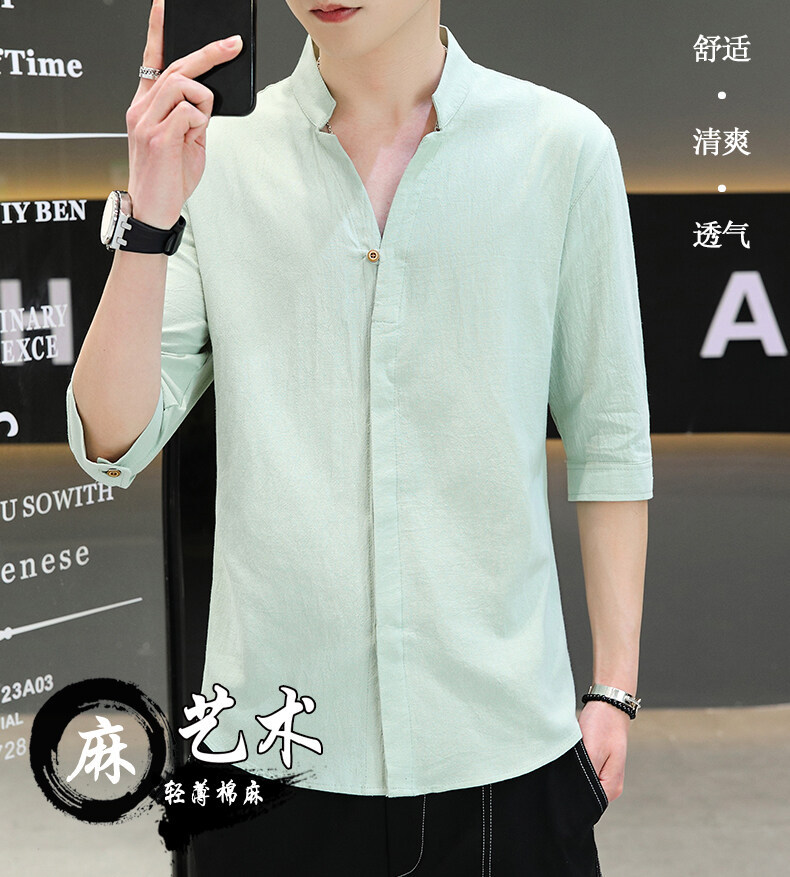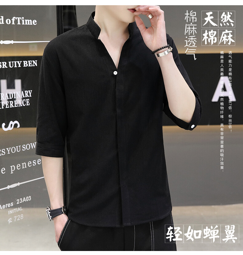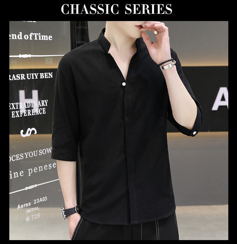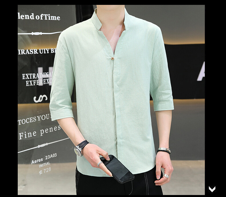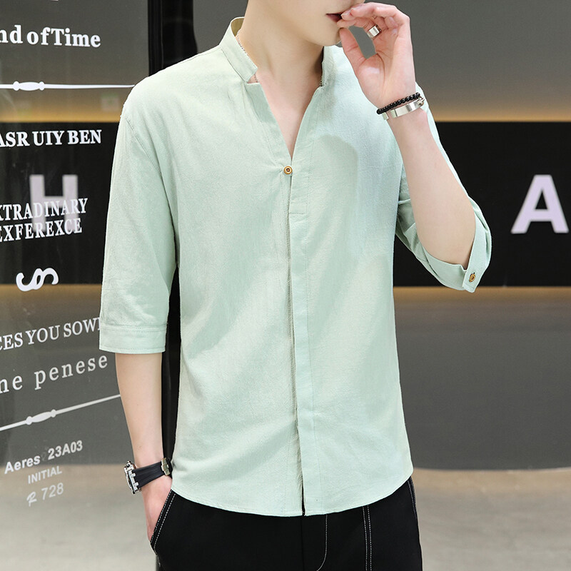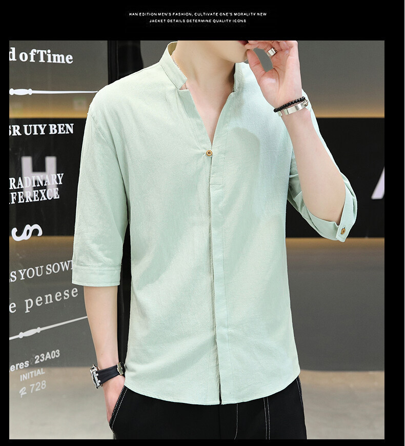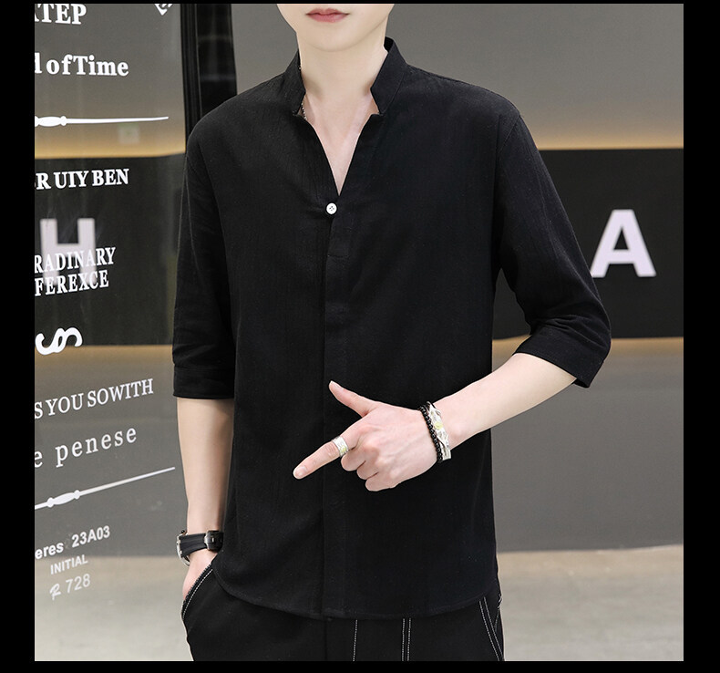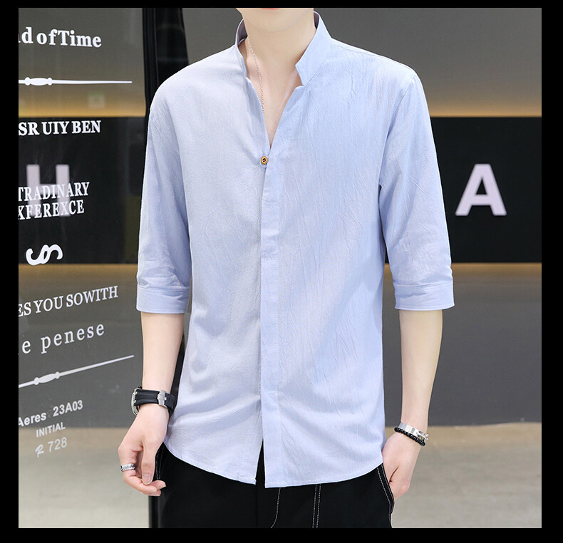 남성용 코튼 리넨 셔츠 짧은 소매 2025 새로운 스타일 얇은 세븐 소매 셔츠 여름 리넨 캐주얼 청소년 남성복스토어 가기