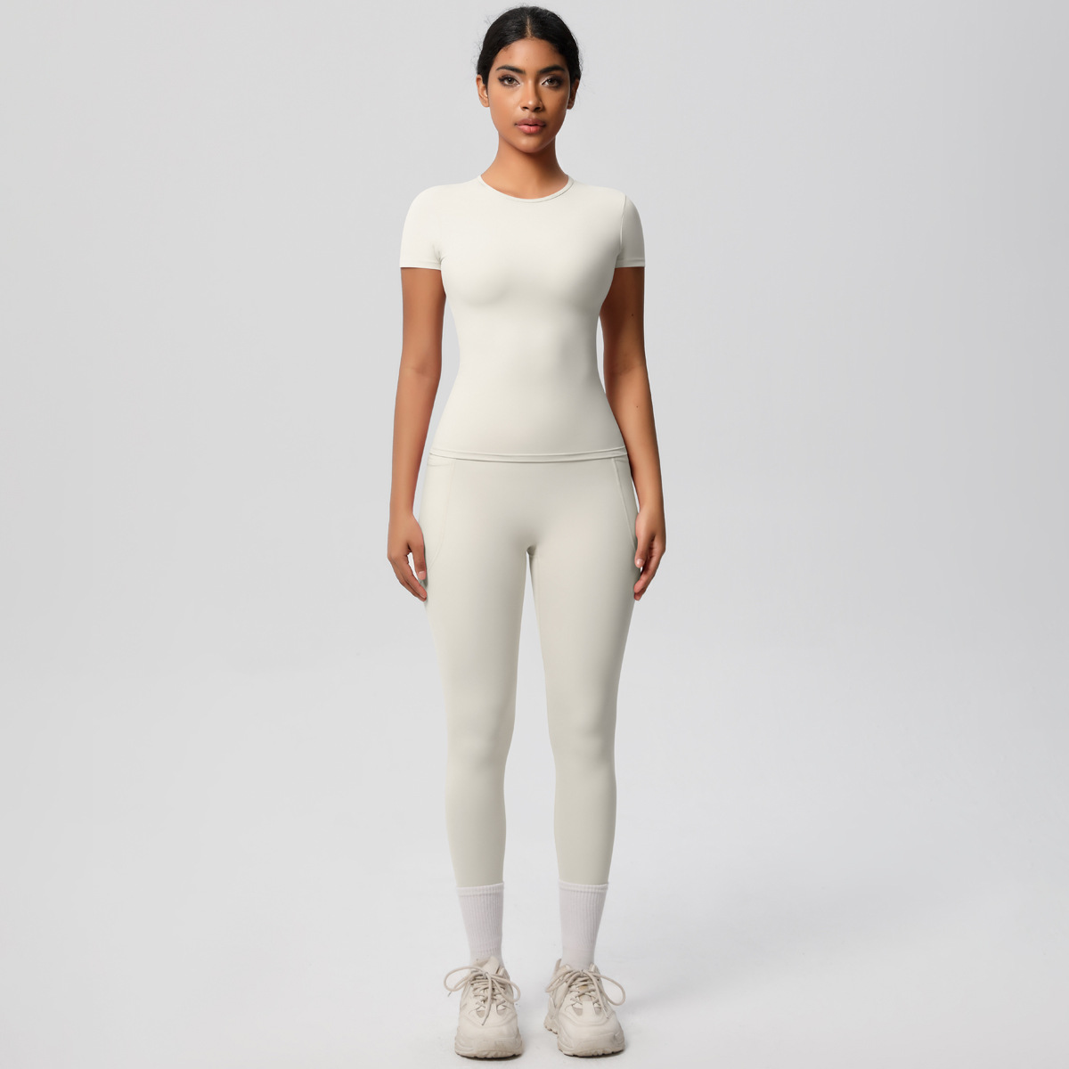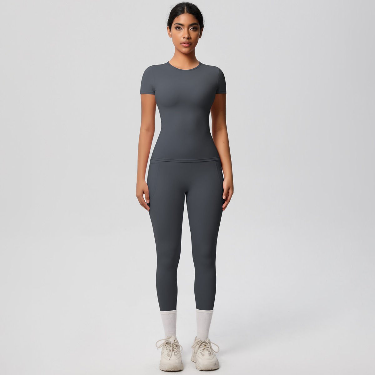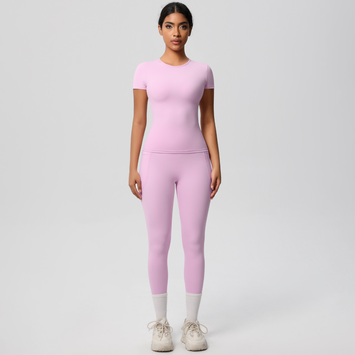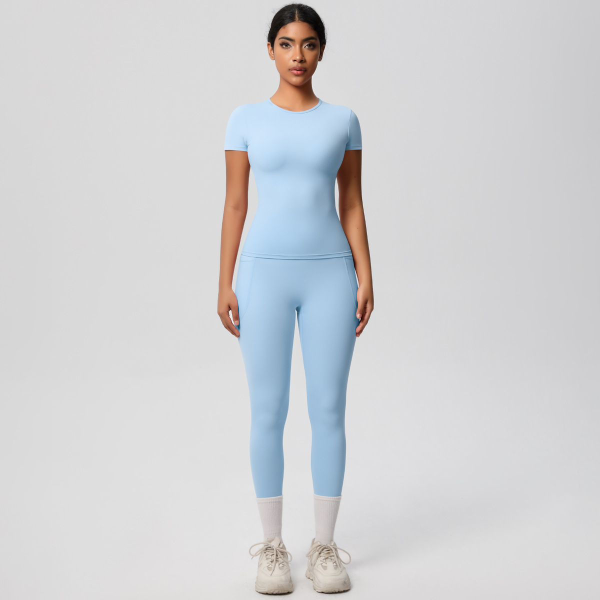 유럽과 미국의 퓨어 컬러 알몸 타이트 샌딩 반팔 요가 세트 높은 허리 엉덩이 리프팅 피트니스 바지 빠른 건조 달리기 스포츠 세트