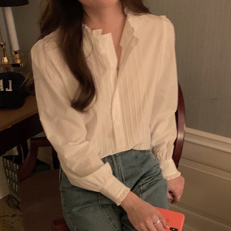 2025 새로운 스타일 느슨한 서양식 시대 감소 레이스 칼라 느슨한 내베이스 셔츠 여성용 긴 소매 셔츠 화이트 탑스토어 가기