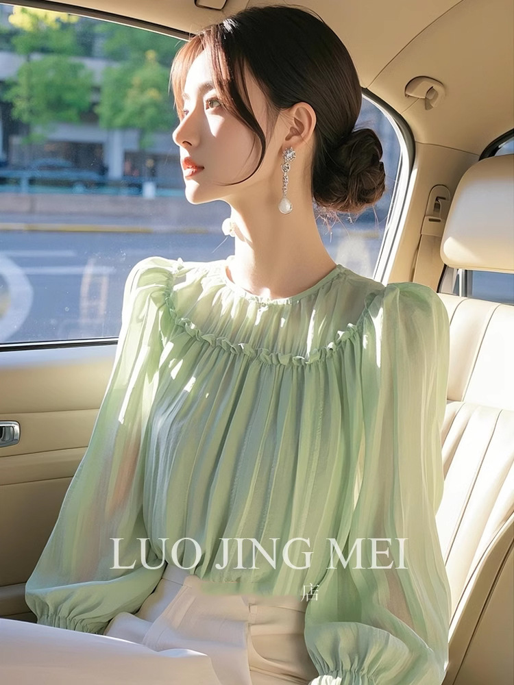 그린 쉬폰 긴팔 셔츠 여성용 하이 엔드 라이트 럭셔리 에이지 감소 서양식 통근 한국 스타일 틈새 독특한 세련된 탑스토어 가기
