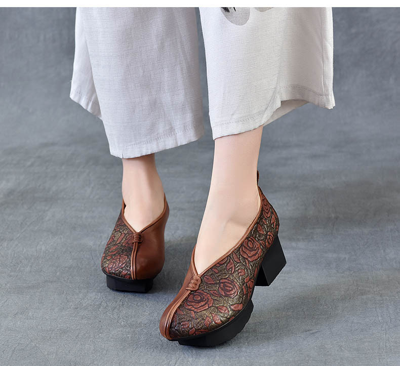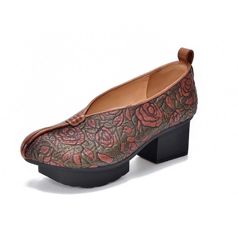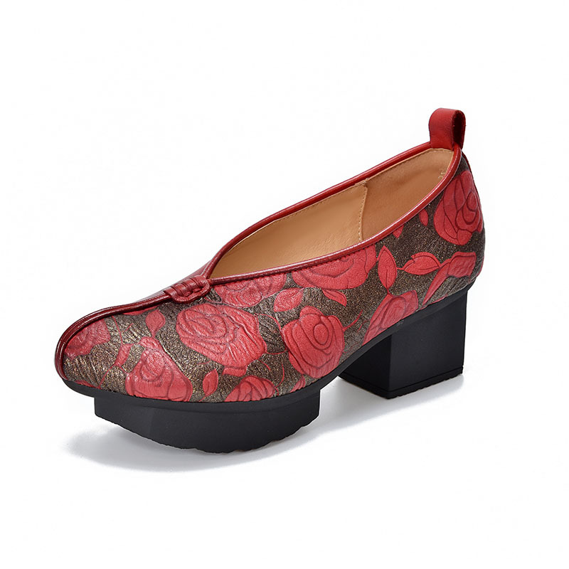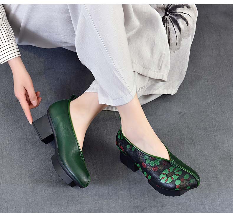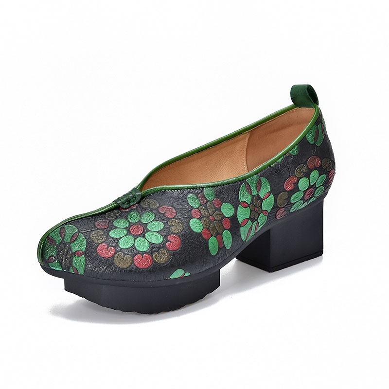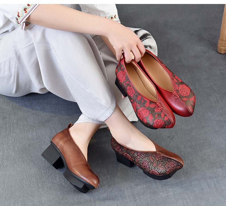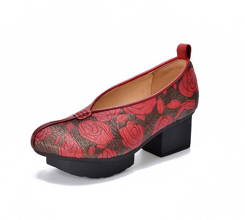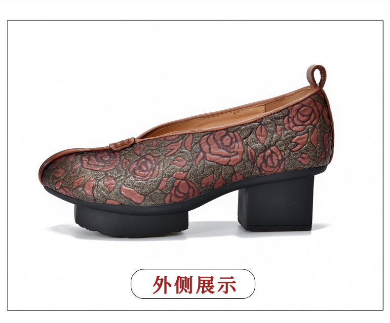새로운 중국 스타일 국가 스타일 두꺼운 힐 여성 신발 한 레이어 Cowhide 인쇄 민족 스타일 빈티지 싱글 레이어 신발 면 및 리넨 스타일 창백한 신발스토어 가기