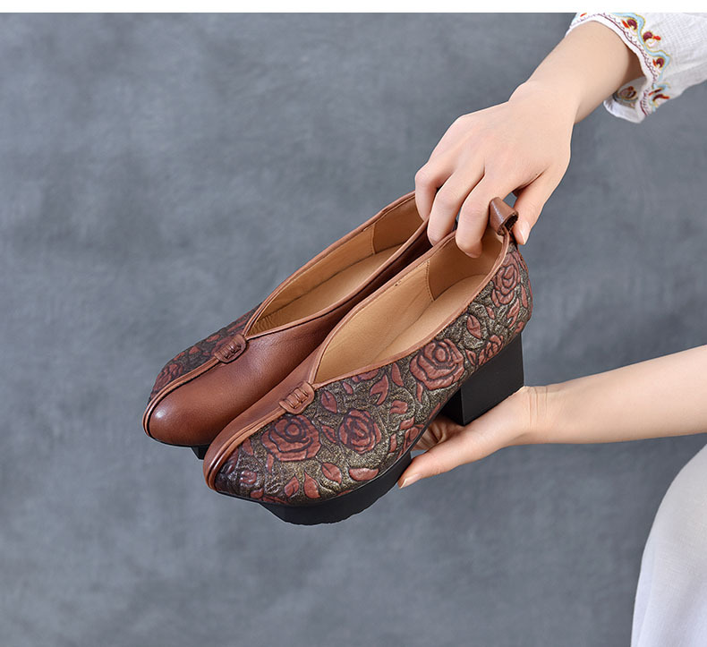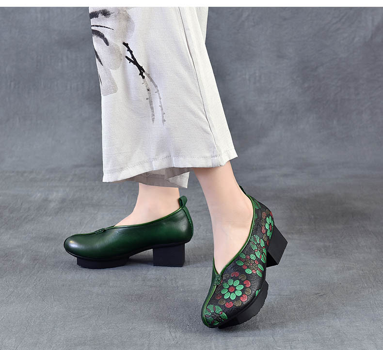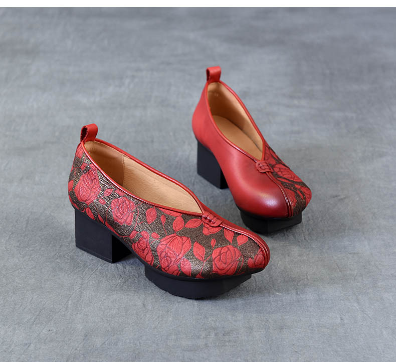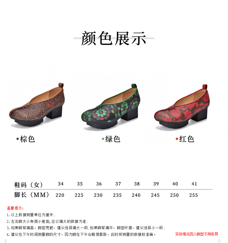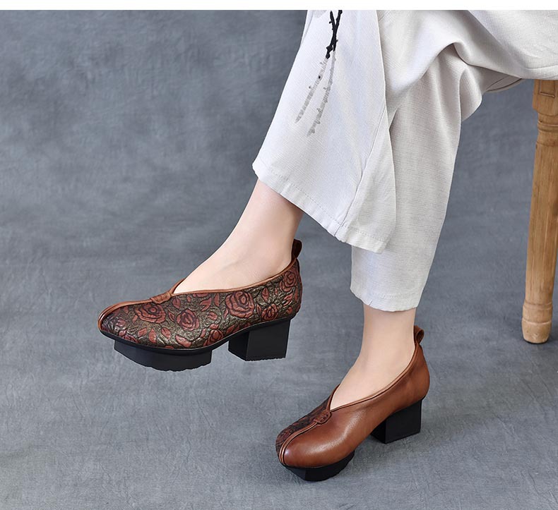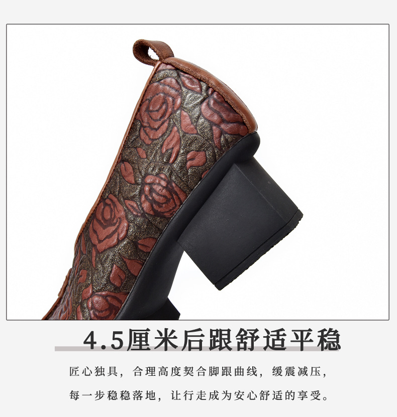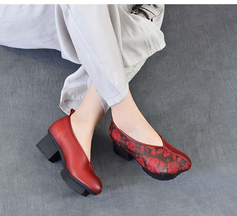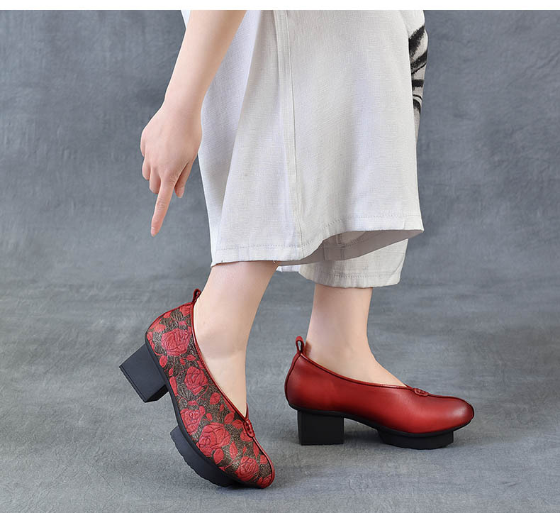 새로운 중국 스타일 국가 스타일 두꺼운 힐 여성 신발 한 레이어 Cowhide 인쇄 민족 스타일 빈티지 싱글 레이어 신발 면 및 리넨 스타일 창백한 신발스토어 가기