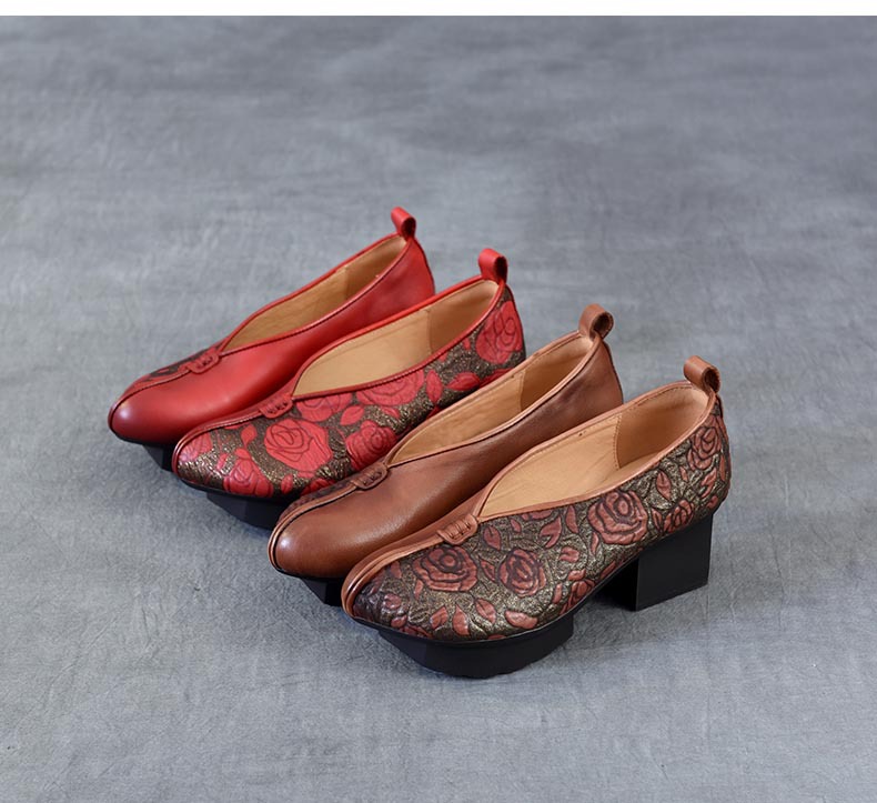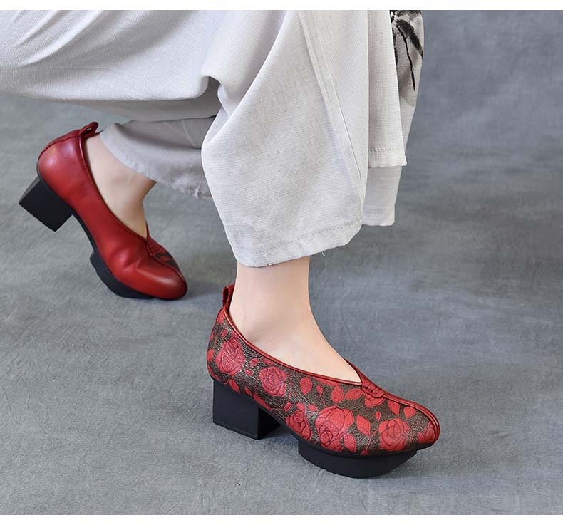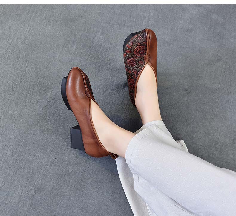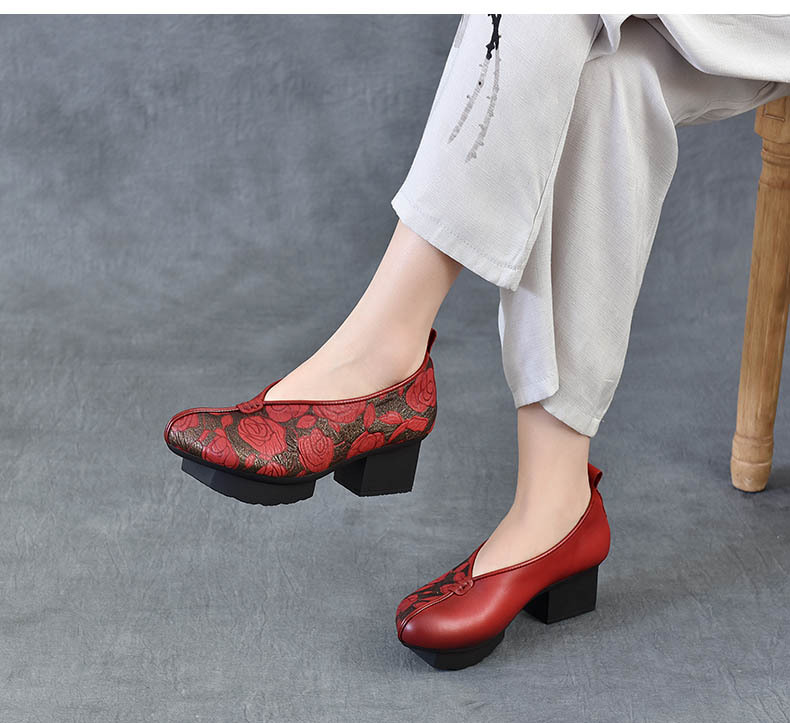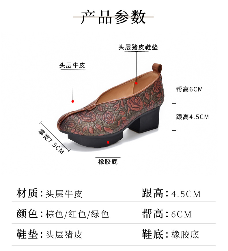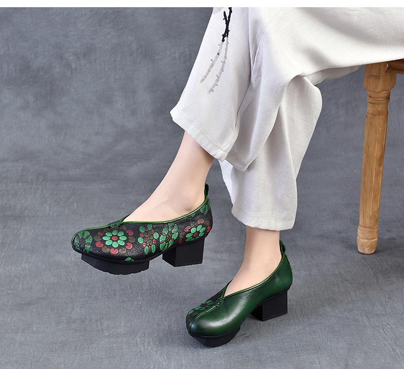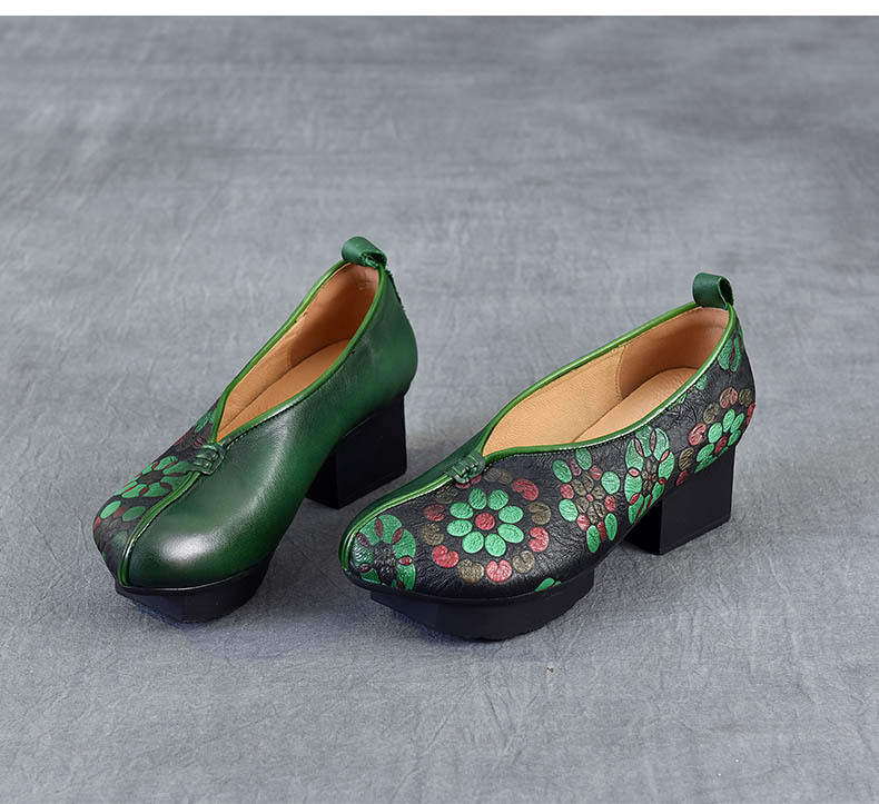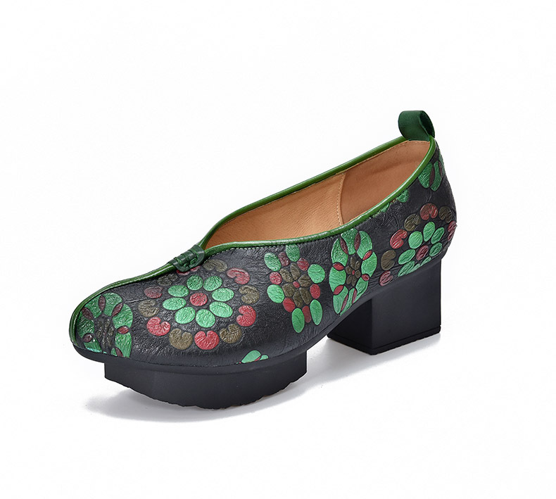 새로운 중국 스타일 국가 스타일 두꺼운 힐 여성 신발 한 레이어 Cowhide 인쇄 민족 스타일 빈티지 싱글 레이어 신발 면 및 리넨 스타일 창백한 신발스토어 가기
