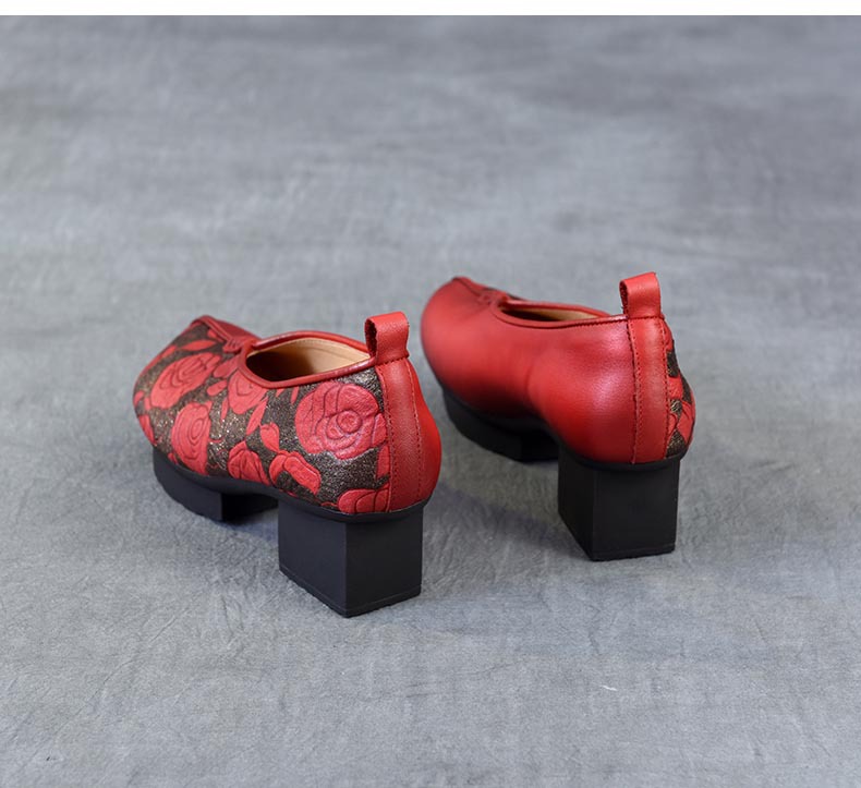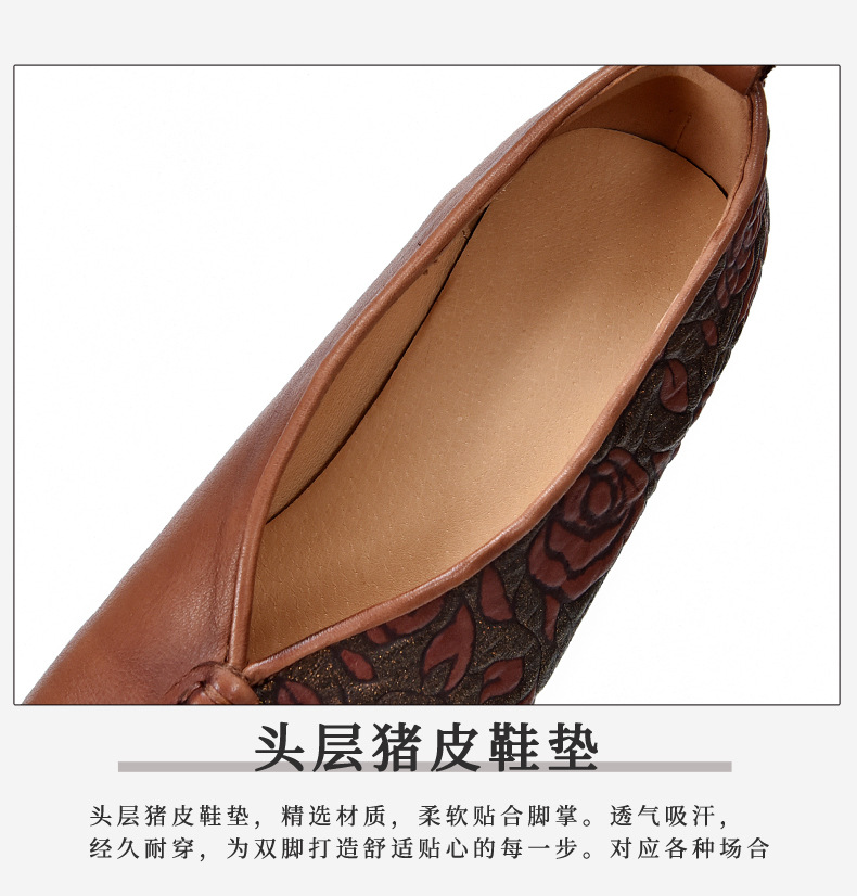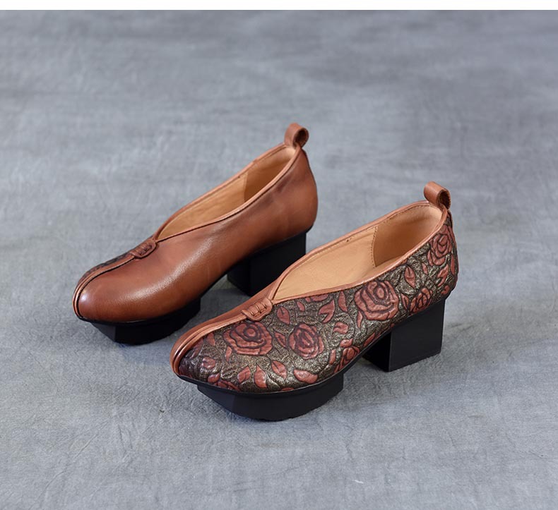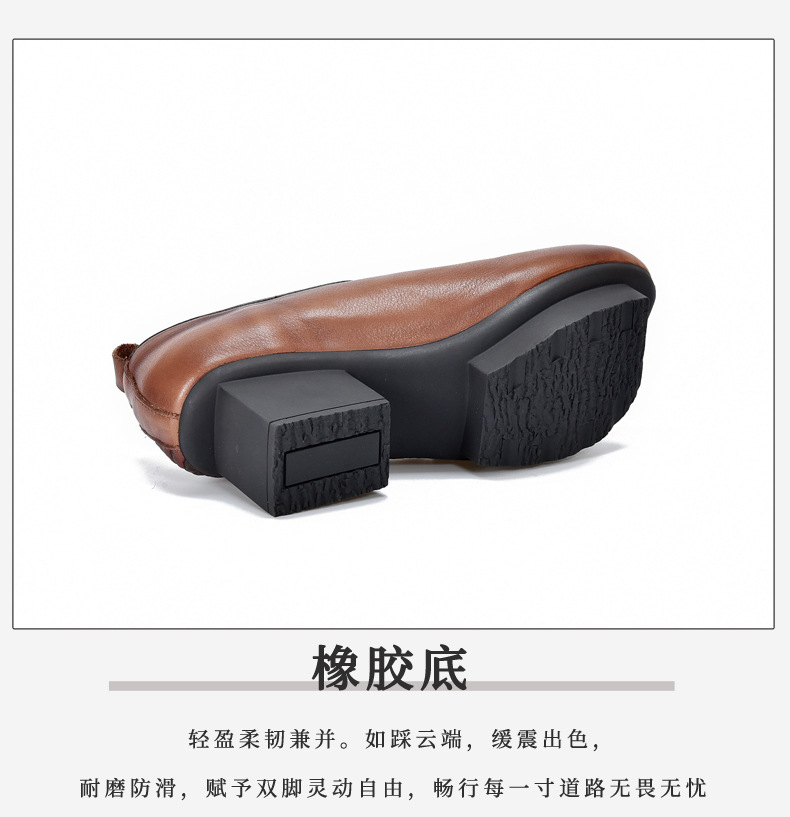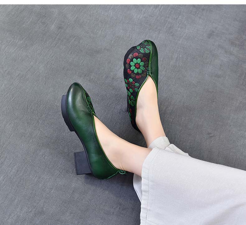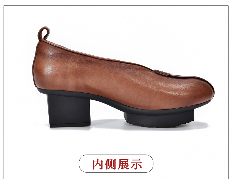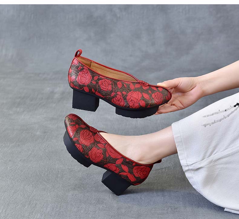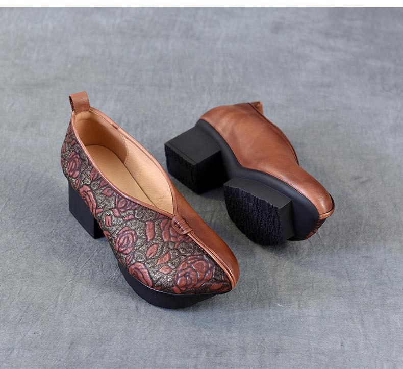 새로운 중국 스타일 국가 스타일 두꺼운 힐 여성 신발 한 레이어 Cowhide 인쇄 민족 스타일 빈티지 싱글 레이어 신발 면 및 리넨 스타일 창백한 신발스토어 가기