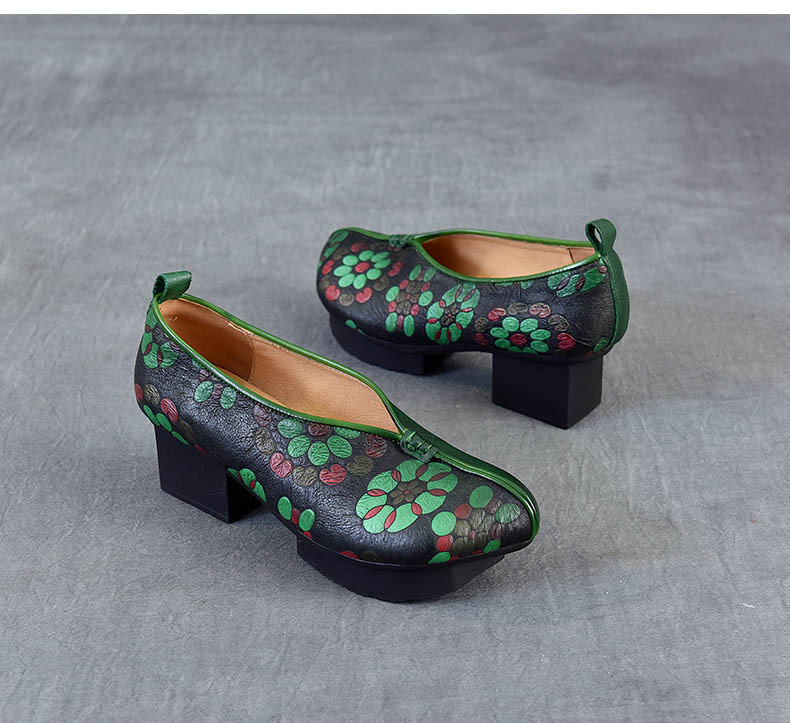 새로운 중국 스타일 국가 스타일 두꺼운 힐 여성 신발 한 레이어 Cowhide 인쇄 민족 스타일 빈티지 싱글 레이어 신발 면 및 리넨 스타일 창백한 신발
