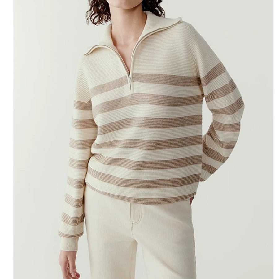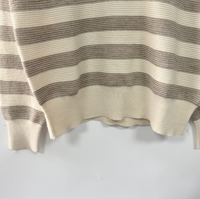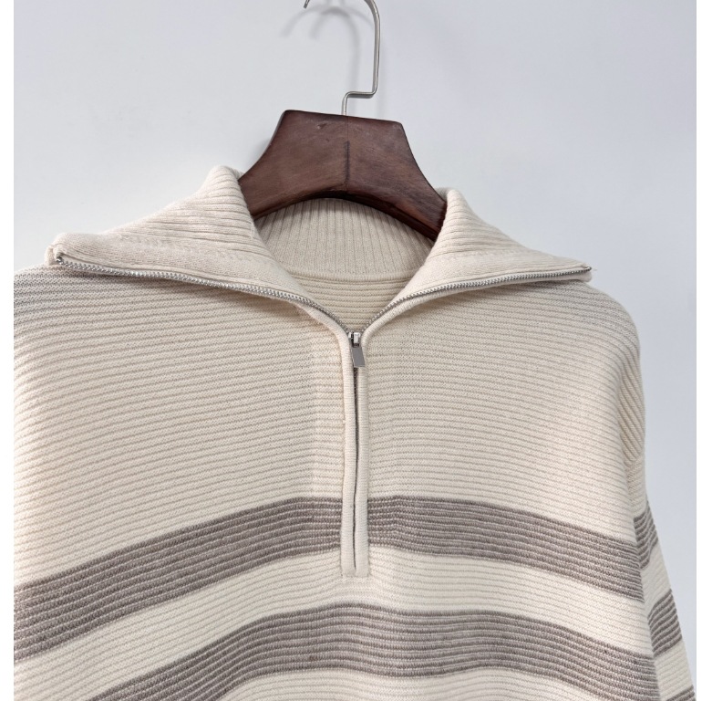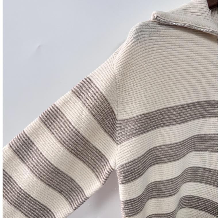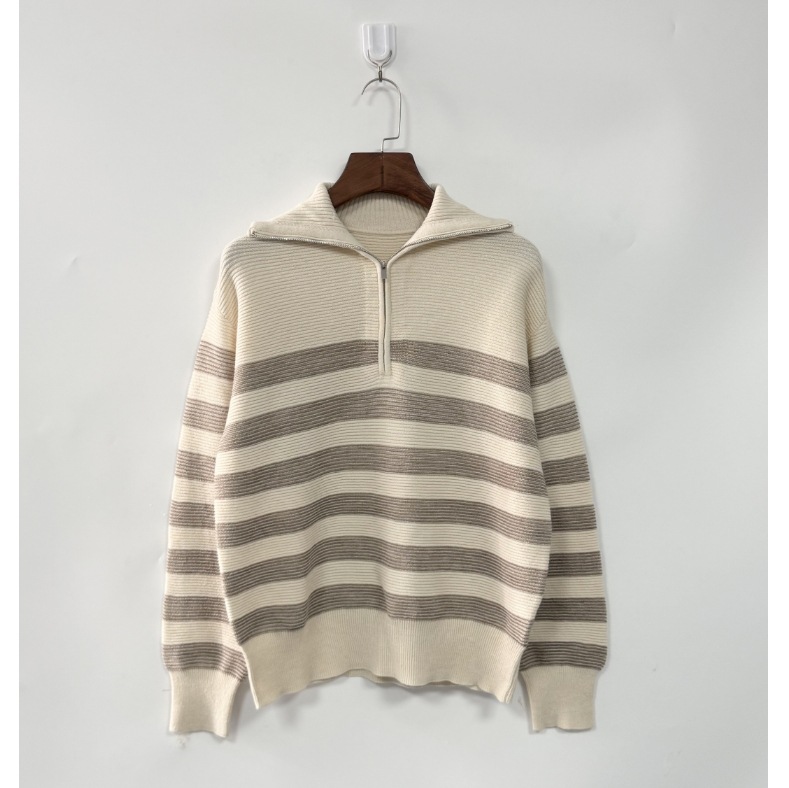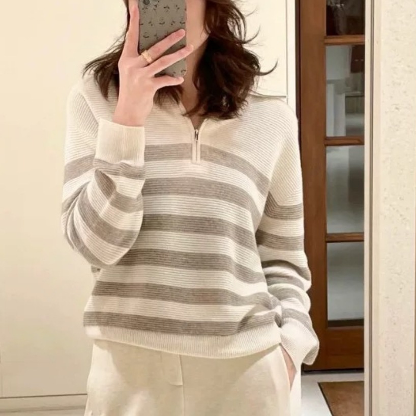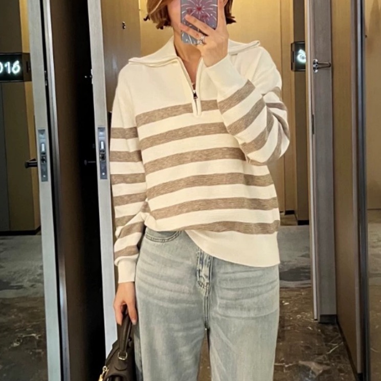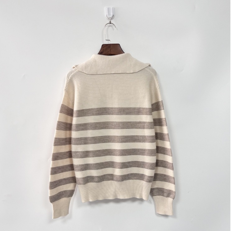 IC25 봄과 여름 새로운 간단한 게으른 스타일 줄무늬 옷깃 올 매치 슬림 핏 풀오버 스웨터스토어 가기